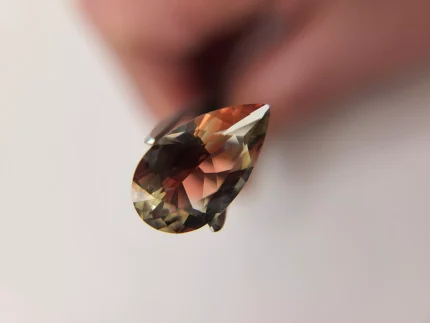 Dreamy 3.3ct peachy pink Oregon Sunstone pear cut (13x9mm) with gorgeous copper schiller. Perfect for a pendant — stunning in rose gold and priced right for the quality.