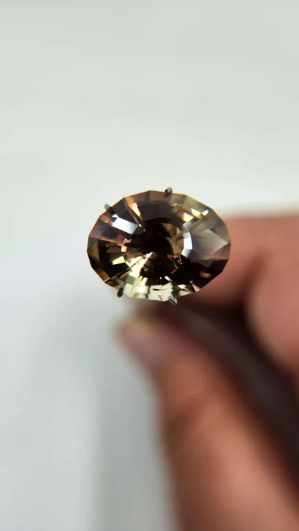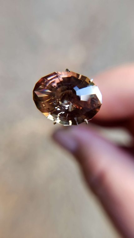 Each Oregon Sunstone is unique, and this one is a unicorn for sure. Weighing 6.7ct, it measures 11.5mm around and 9.7mm deep. When I saw this rough, I knew it had to be a deep cut, and this Portuguese with 161 facets really does it justice. Look at the brilliance here. In natural light or artificial, the green and coppery pink bi-color nature of this all natural stone really shines through.