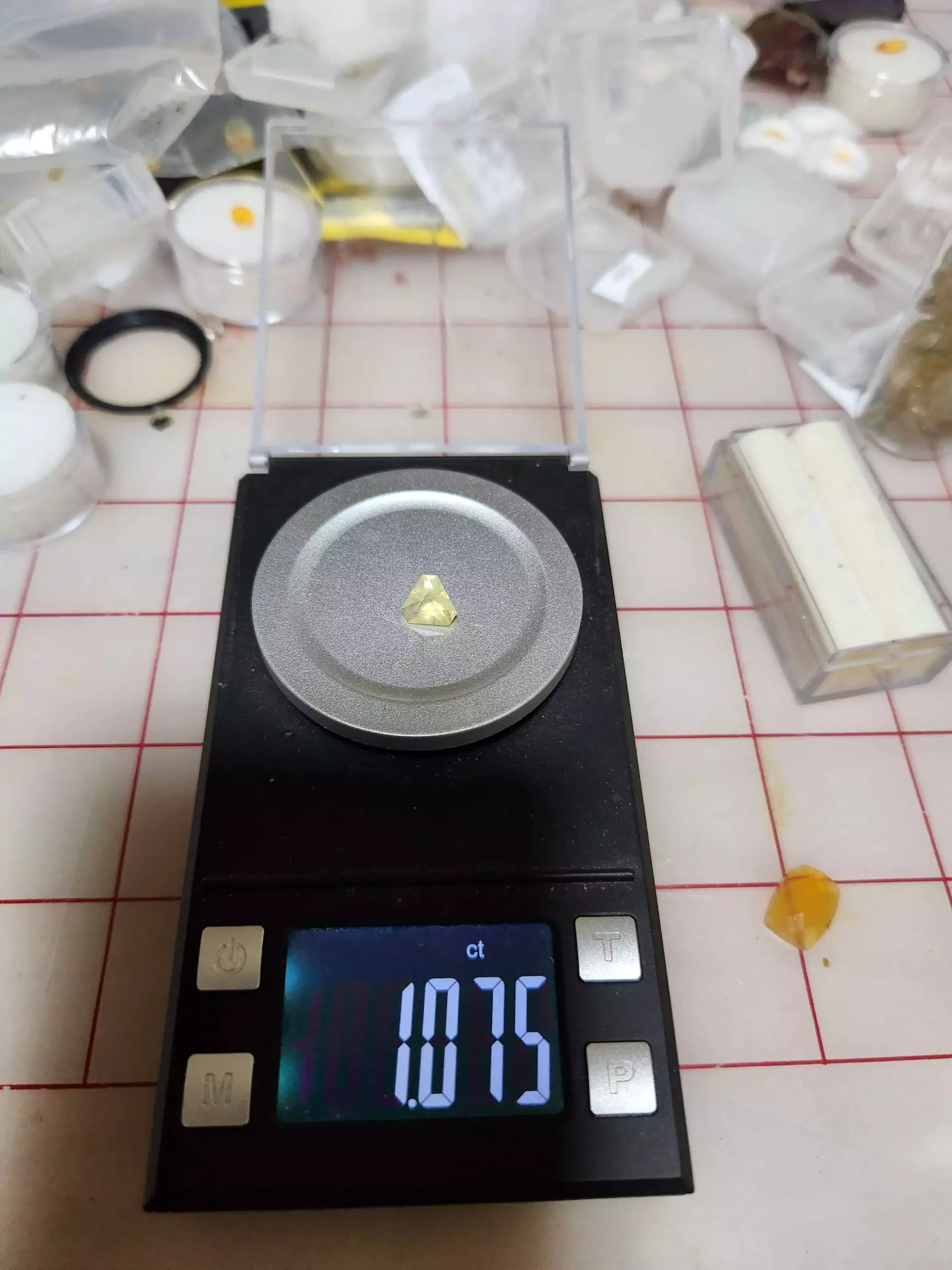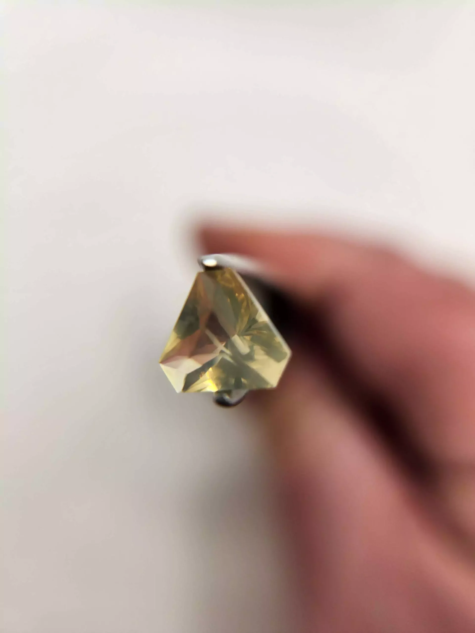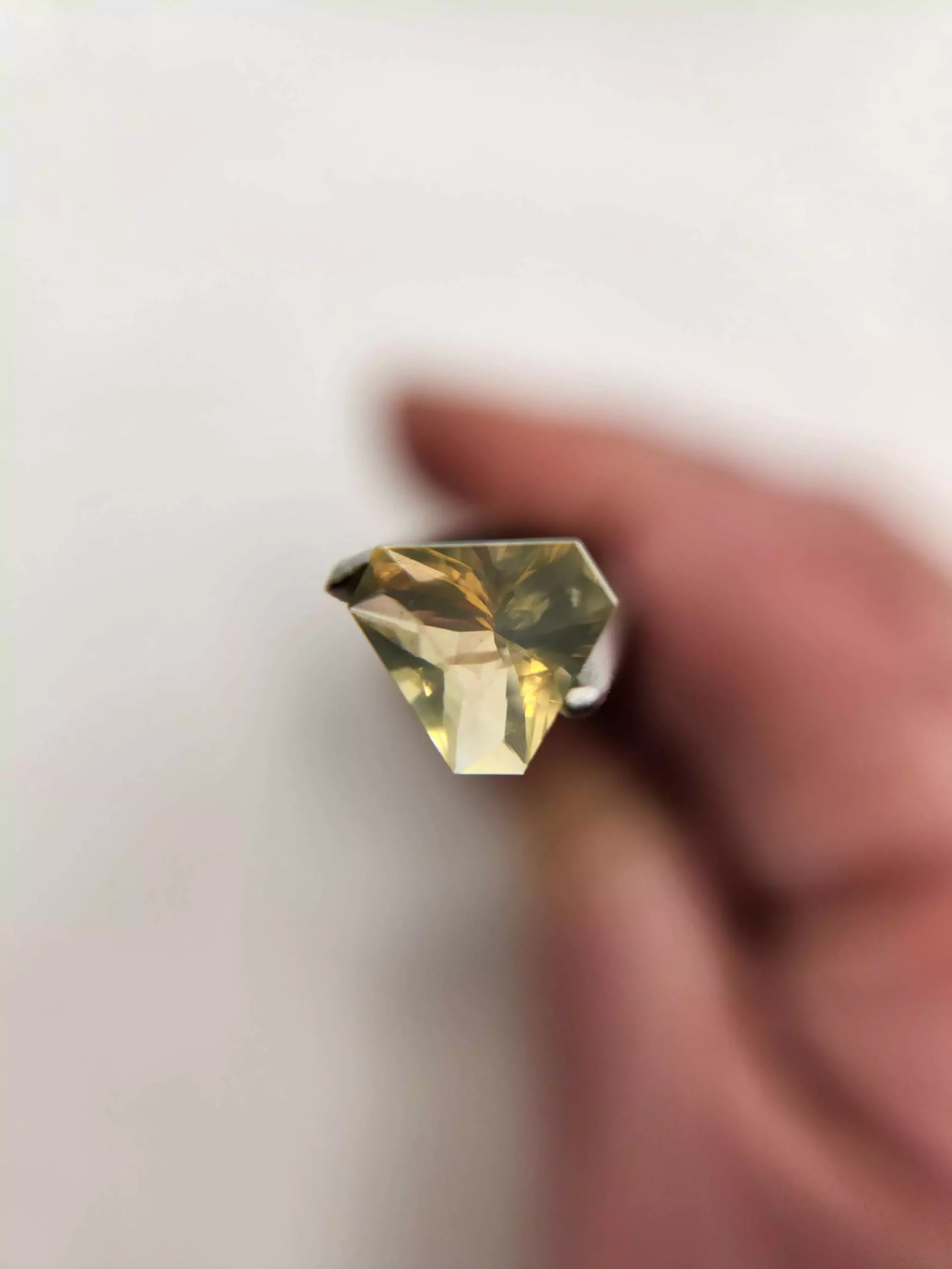 It throws amber and gold opalescence with its "lens cut" and would look great in a design where you can see the pattern of the metal behind it bending as a result of this faceting design.