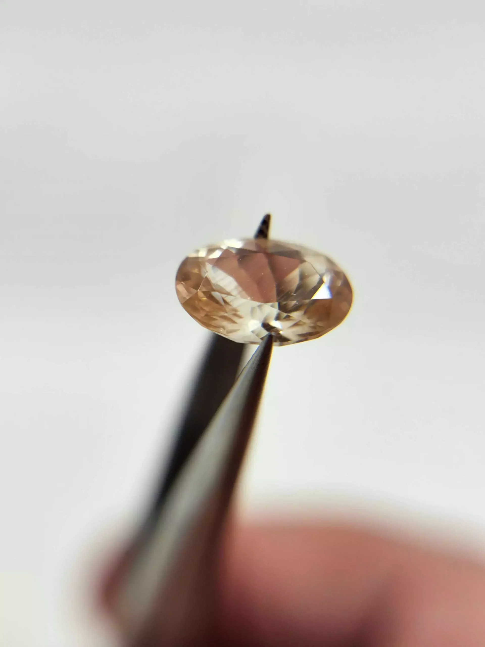 This 1.9ct Oregon Sunstone trillion is champagne in color with a little bit of copper schiller to add some extra sparkle. In the sun, you'll see shades of pink and green in it as well as that golden champagne color.