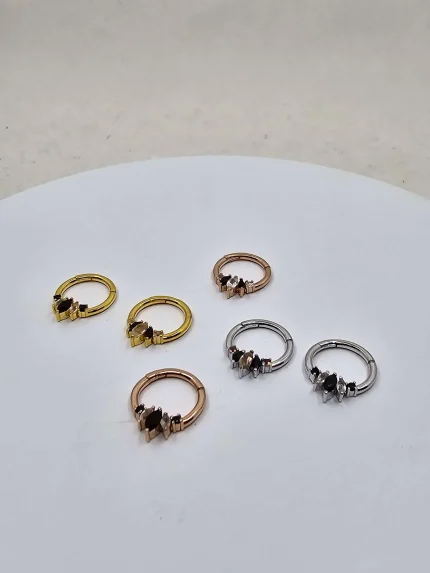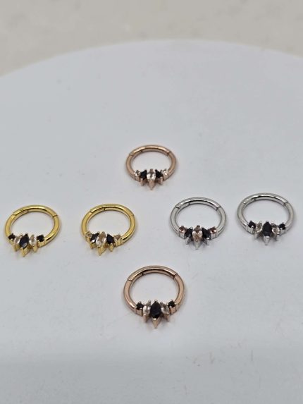 Embody the divine femininity of Parvati, the Hindu goddess of love and beauty, with our stunning septum ring clicker. This exquisite piece features alternating Oregon Sunstone and black spinel gems, showcasing the unique schillerization of Sunstone and the mysterious allure of spinel. The Parvati septum ring clicker is available in 14k yellow gold, white gold, or rose gold, allowing you to choose the perfect match for your style. Details: - Alternating Oregon Sunstone and black spinel gems - Schillerization in Oregon Sunstone adds a metallic shimmer - 14k yellow gold, white gold, or rose gold - Handcrafted with love and attention to detail - Unique and eye-catching design - Perfect for septum or daith piercings This ring is not only a beautiful addition to your jewelry collection but also a symbol of inner strength, love, and beauty. Treat yourself or gift someone special with the Parvati septum ring clicker. Order now and shine with divine elegance!