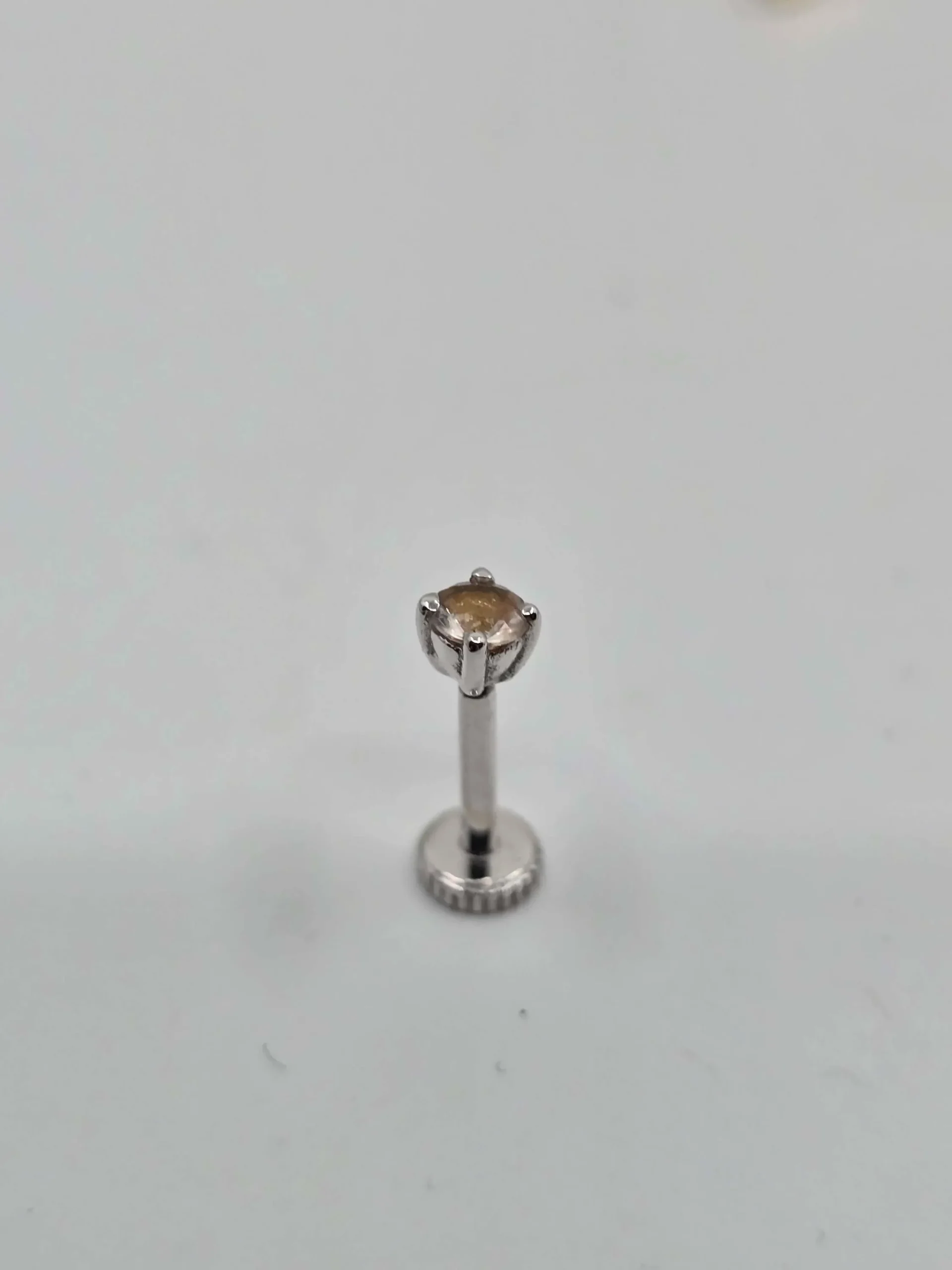 This 14k gold flat back labret features a natural Oregon Sunstone in your choice of bezel or prong setting. Ideal for nose, conch, helix, Medusa, Monroe, or labret piercings. Internally threaded 16g post with a secure 5mm flat back.