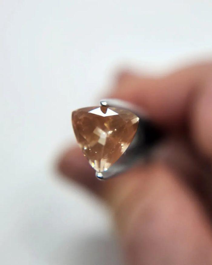 This 1.9ct Oregon Sunstone trillion is champagne in color with a little bit of copper schiller to add some extra sparkle. In the sun, you'll see shades of pink and green in it as well as that golden champagne color.