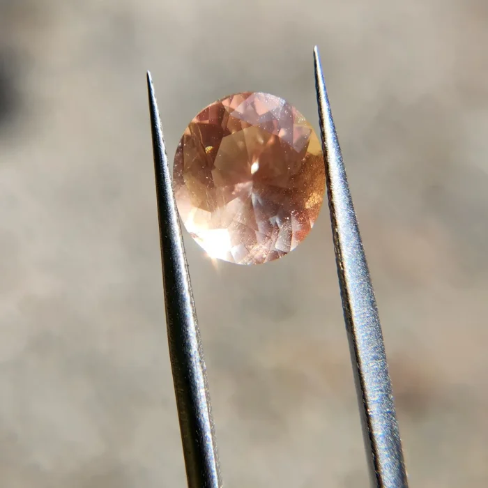 This 1.9ct Oregon Sunstone trillion is champagne in color with a little bit of copper schiller to add some extra sparkle. In the sun, you'll see shades of pink and green in it as well as that golden champagne color.