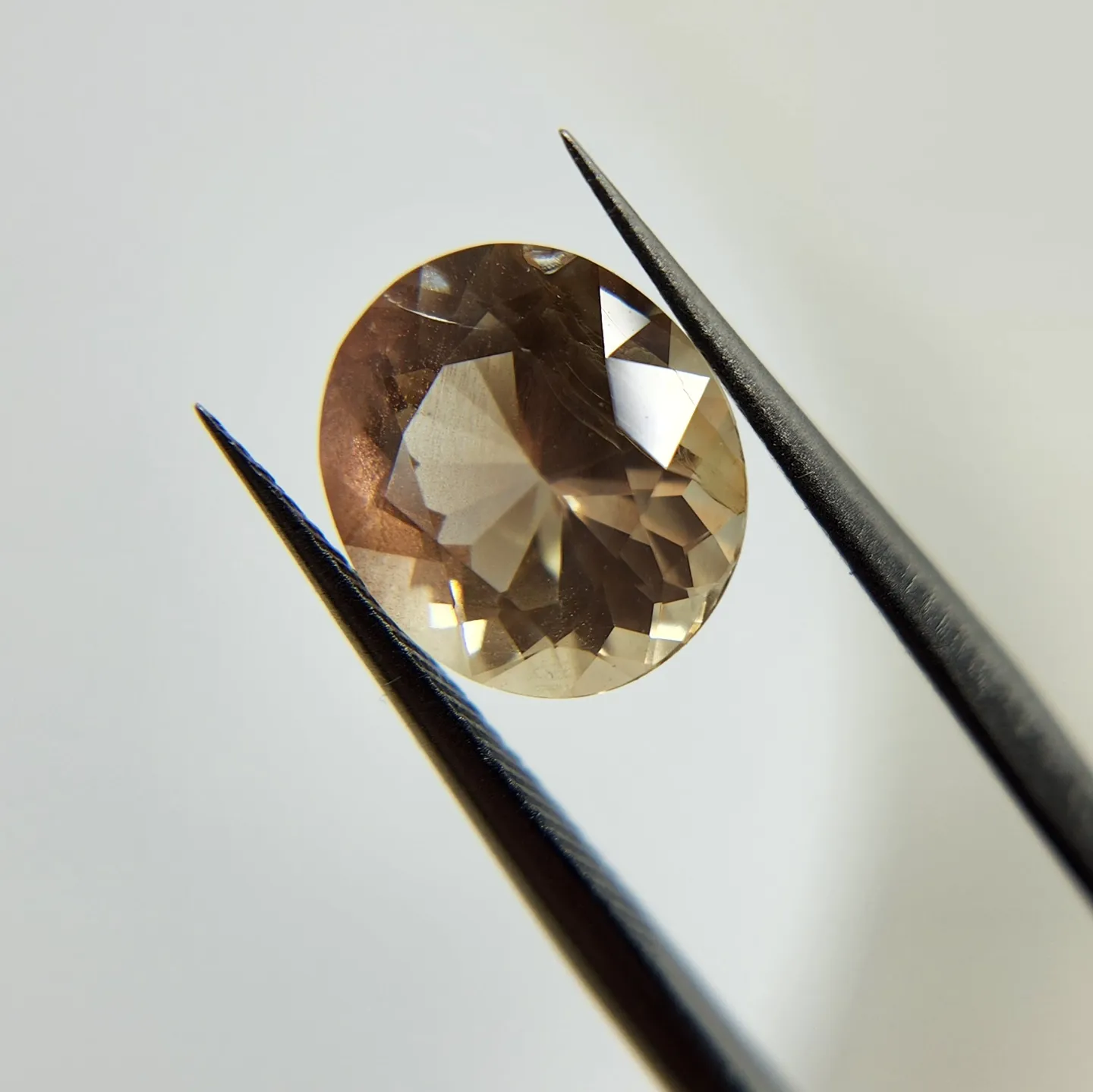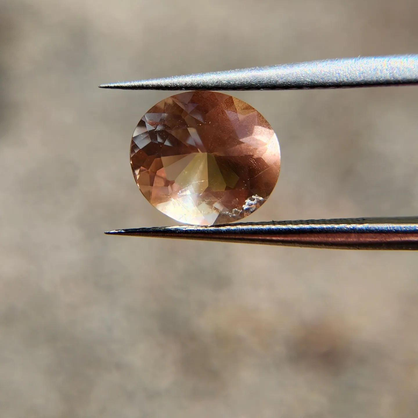 This 1.9ct Oregon Sunstone trillion is champagne in color with a little bit of copper schiller to add some extra sparkle. In the sun, you'll see shades of pink and green in it as well as that golden champagne color.