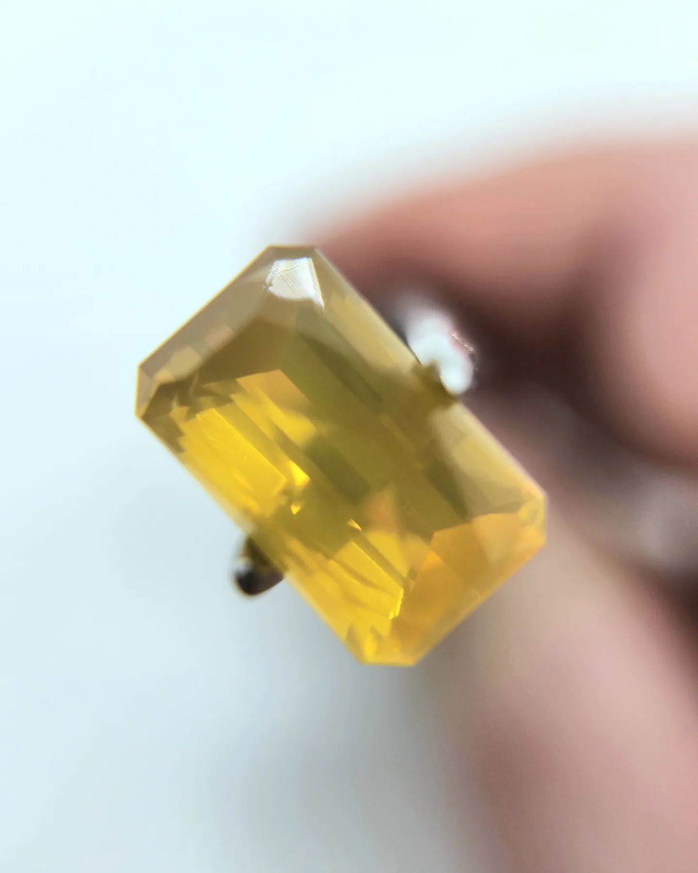 It throws amber and gold opalescence with its "lens cut" and would look great in a design where you can see the pattern of the metal behind it bending as a result of this faceting design.
