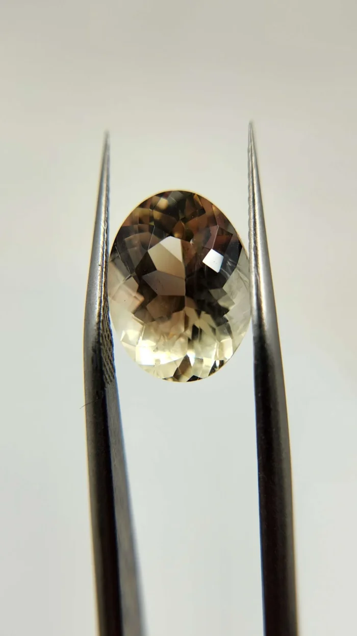 This 1.9ct Oregon Sunstone trillion is champagne in color with a little bit of copper schiller to add some extra sparkle. In the sun, you'll see shades of pink and green in it as well as that golden champagne color.