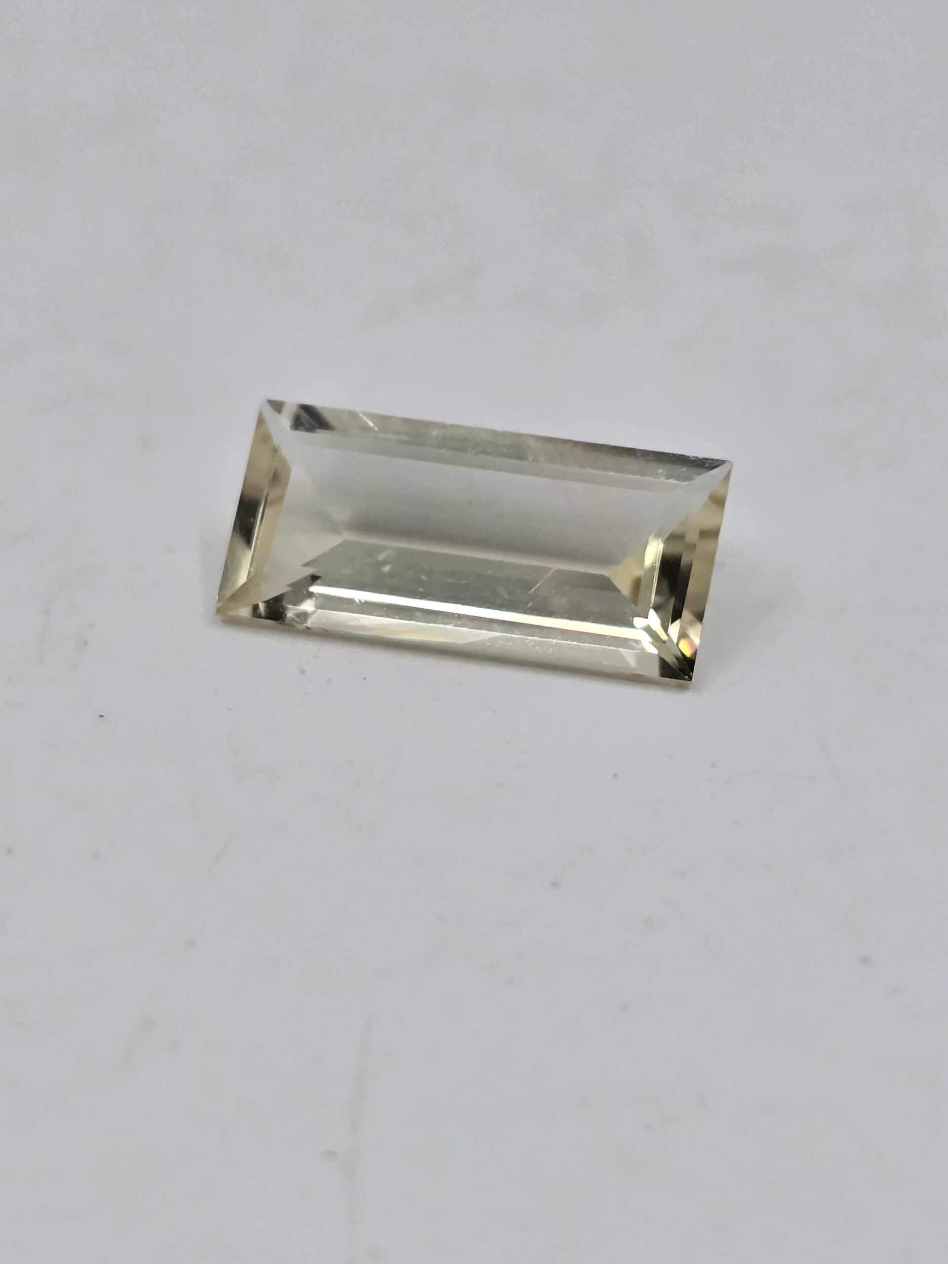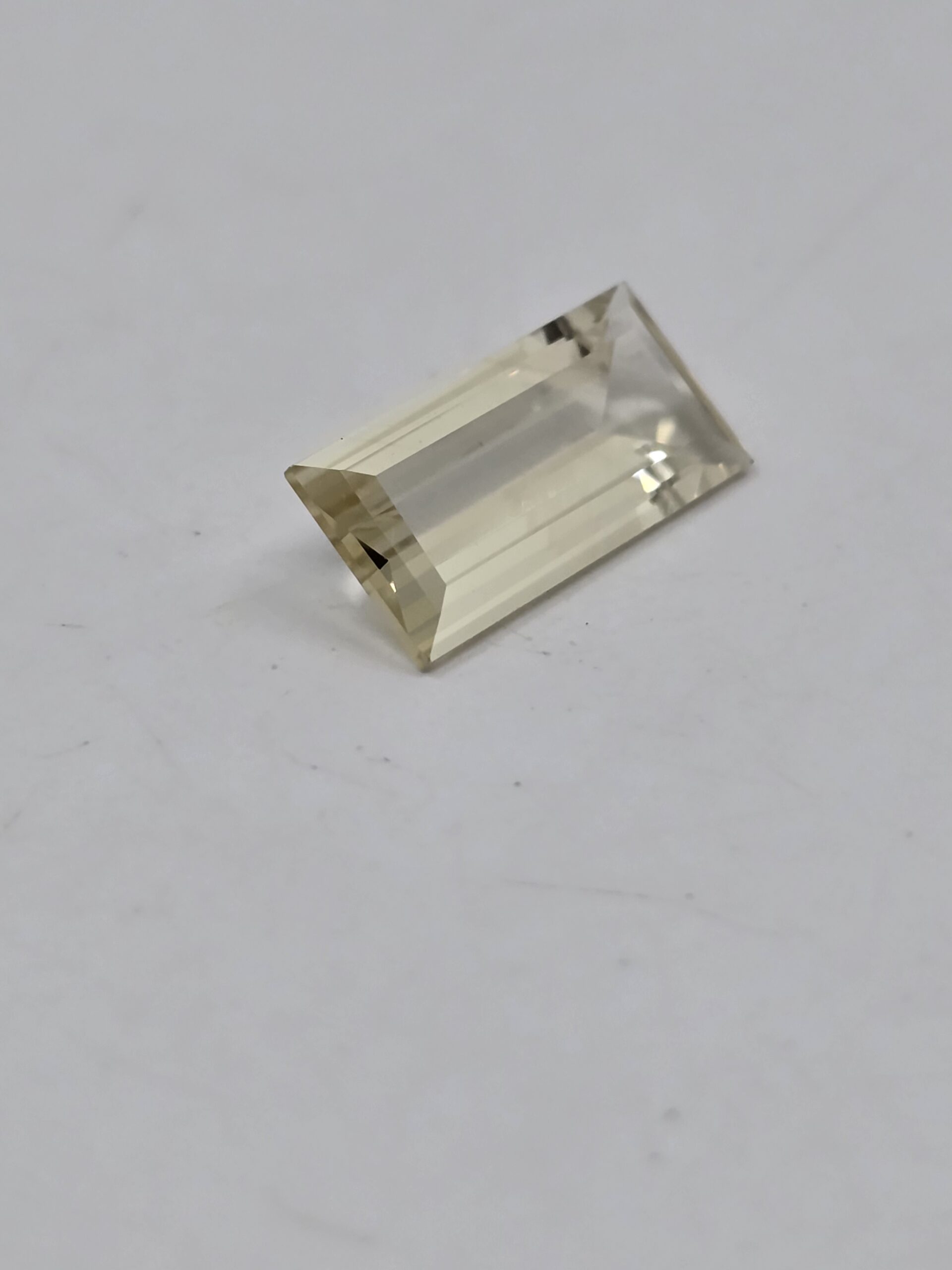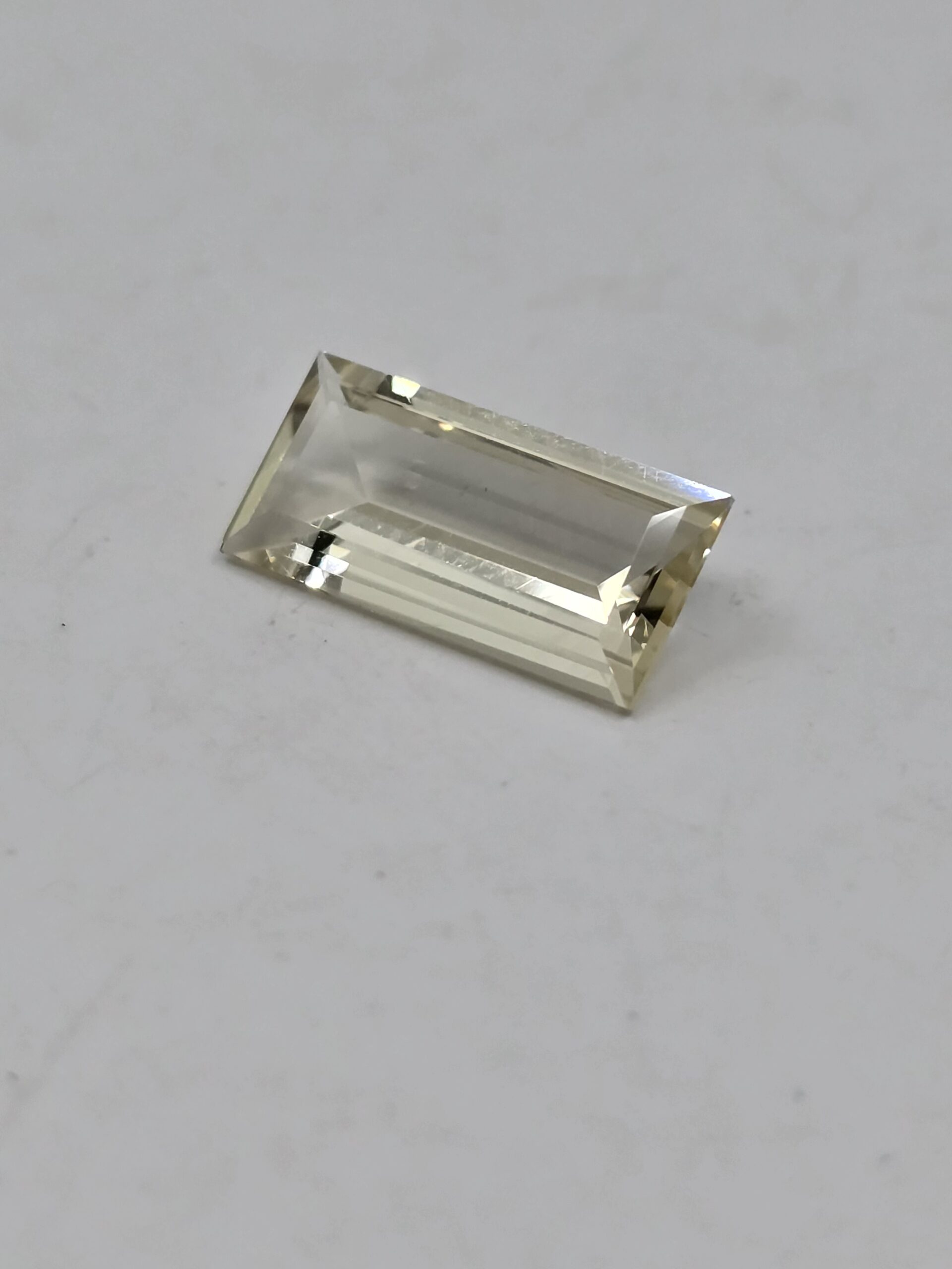 Measuring 16 x 7.8mm, it features a beautifully elongated rectangular shape with symmetrical four-sided faceting. Its coloring is a delicate gradient between champagne gold and pale pink, catching the light with a soft, inner glow.