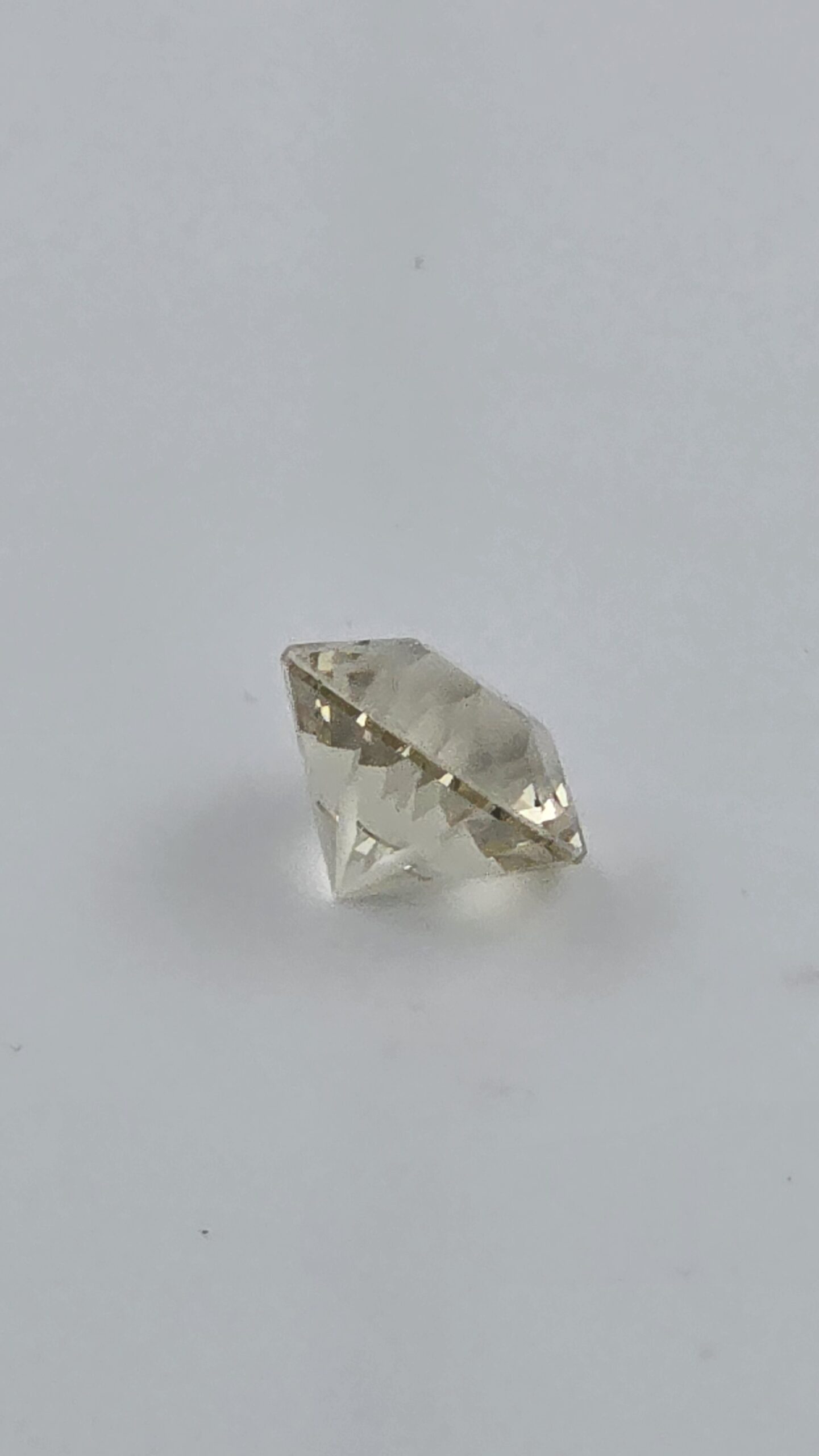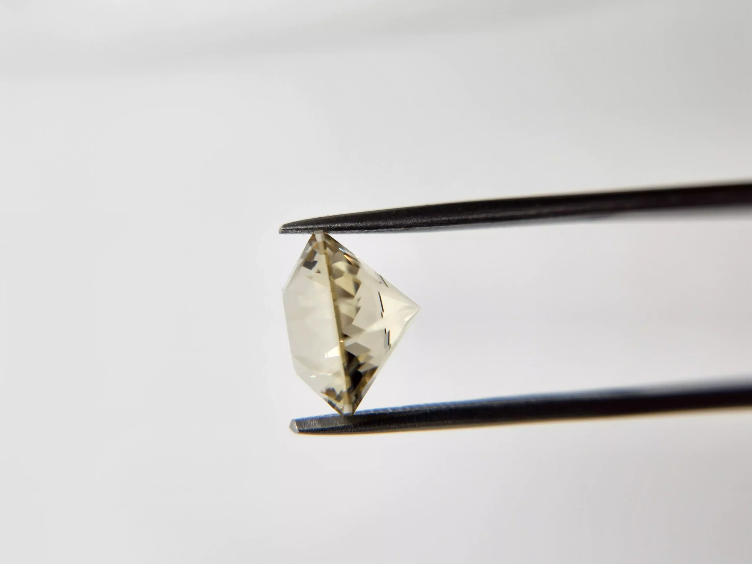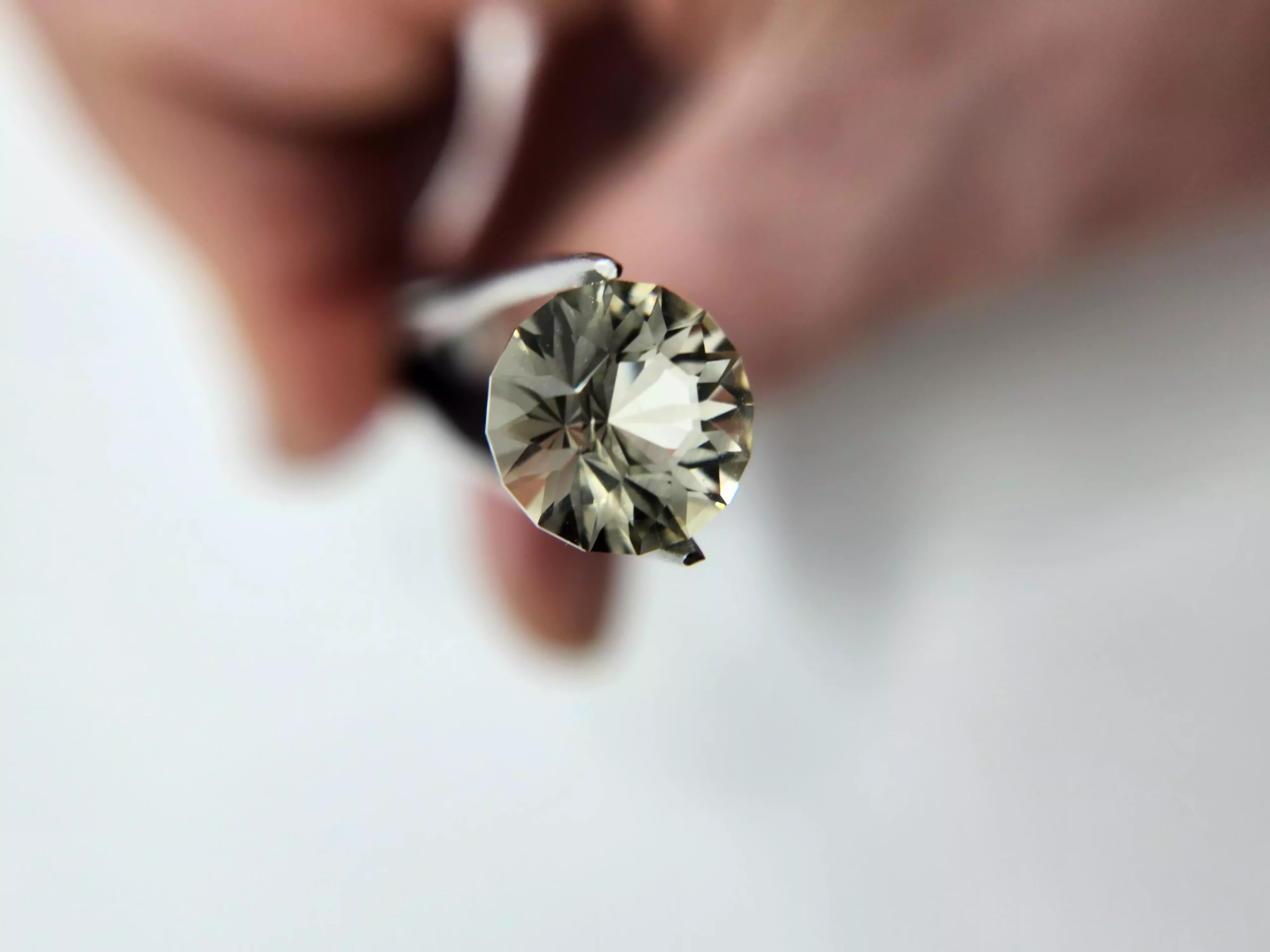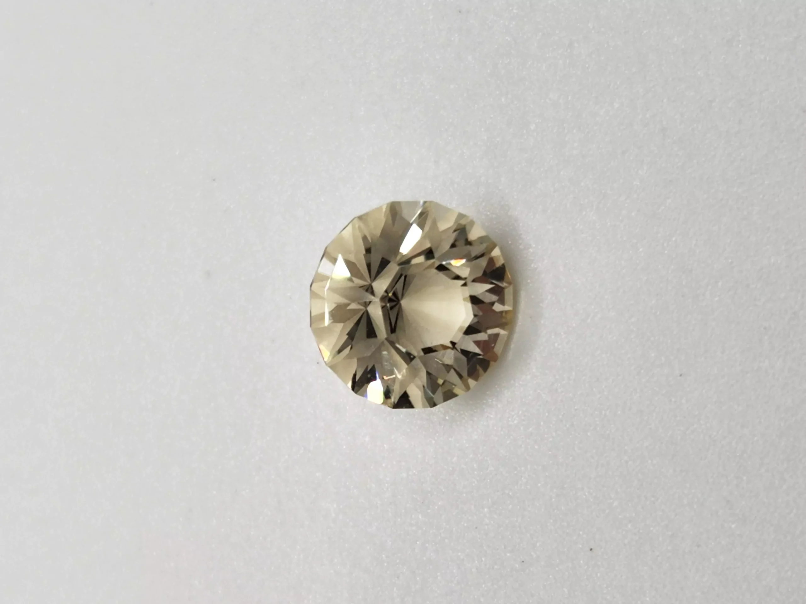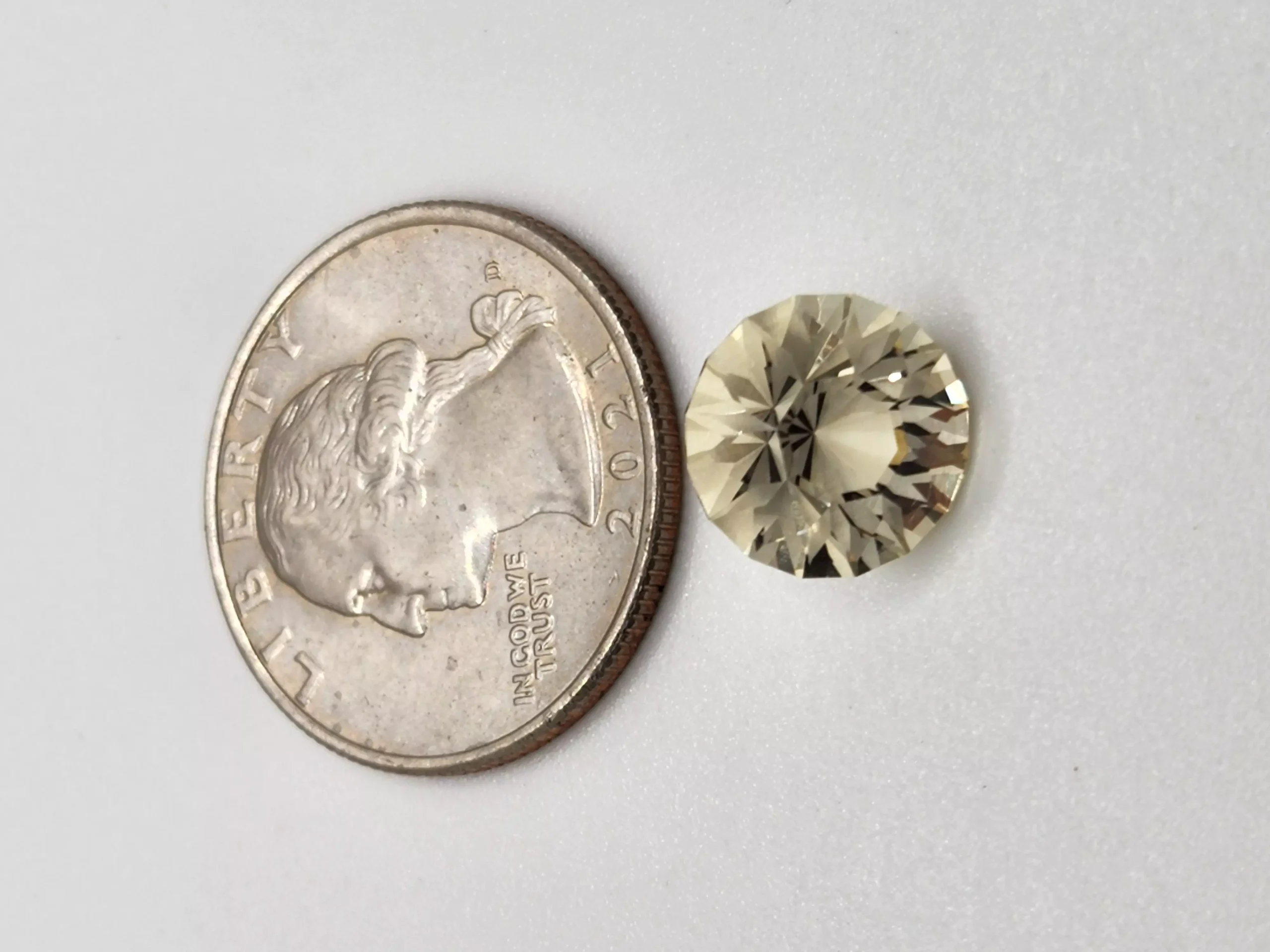 4.36ct “Lucky Sunflower” cut Oregon Sunstone (10.73mm). Champagne-yellow color with radiant golden sparkle. Self-mined and cut in the USA — 100% U.S. sourced.