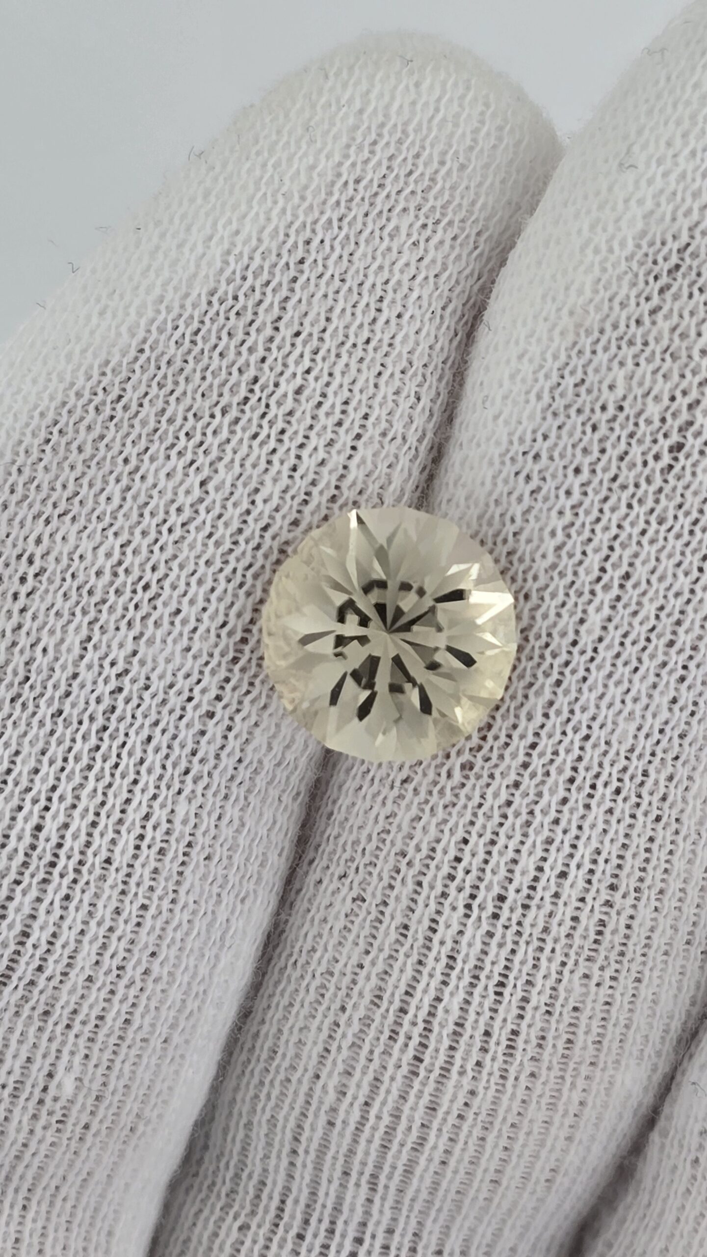 This radiant Oregon Sunstone has been masterfully cut into a rare and artistic shape known as the “Lucky Sunflower”, a design that radiates golden light from every facet like the sun itself. Measuring 10.73mm and weighing 4.36 carats, it’s a beautifully sized gem that dazzles with a warm champagne-yellow glow and sun-like brilliance.