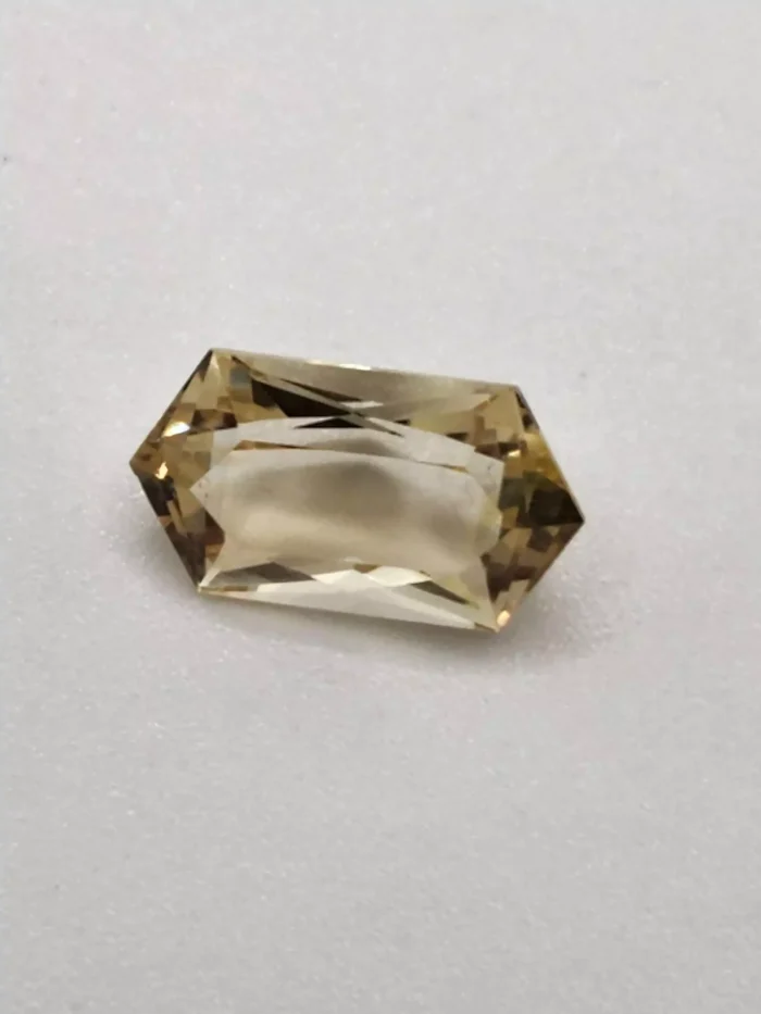 This 1.9ct Oregon Sunstone trillion is champagne in color with a little bit of copper schiller to add some extra sparkle. In the sun, you'll see shades of pink and green in it as well as that golden champagne color.