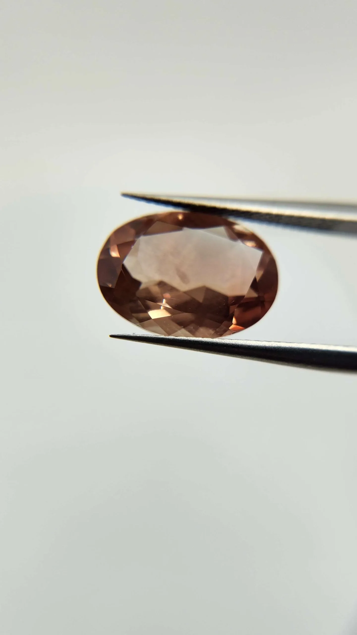This 1.9ct Oregon Sunstone trillion is champagne in color with a little bit of copper schiller to add some extra sparkle. In the sun, you'll see shades of pink and green in it as well as that golden champagne color.