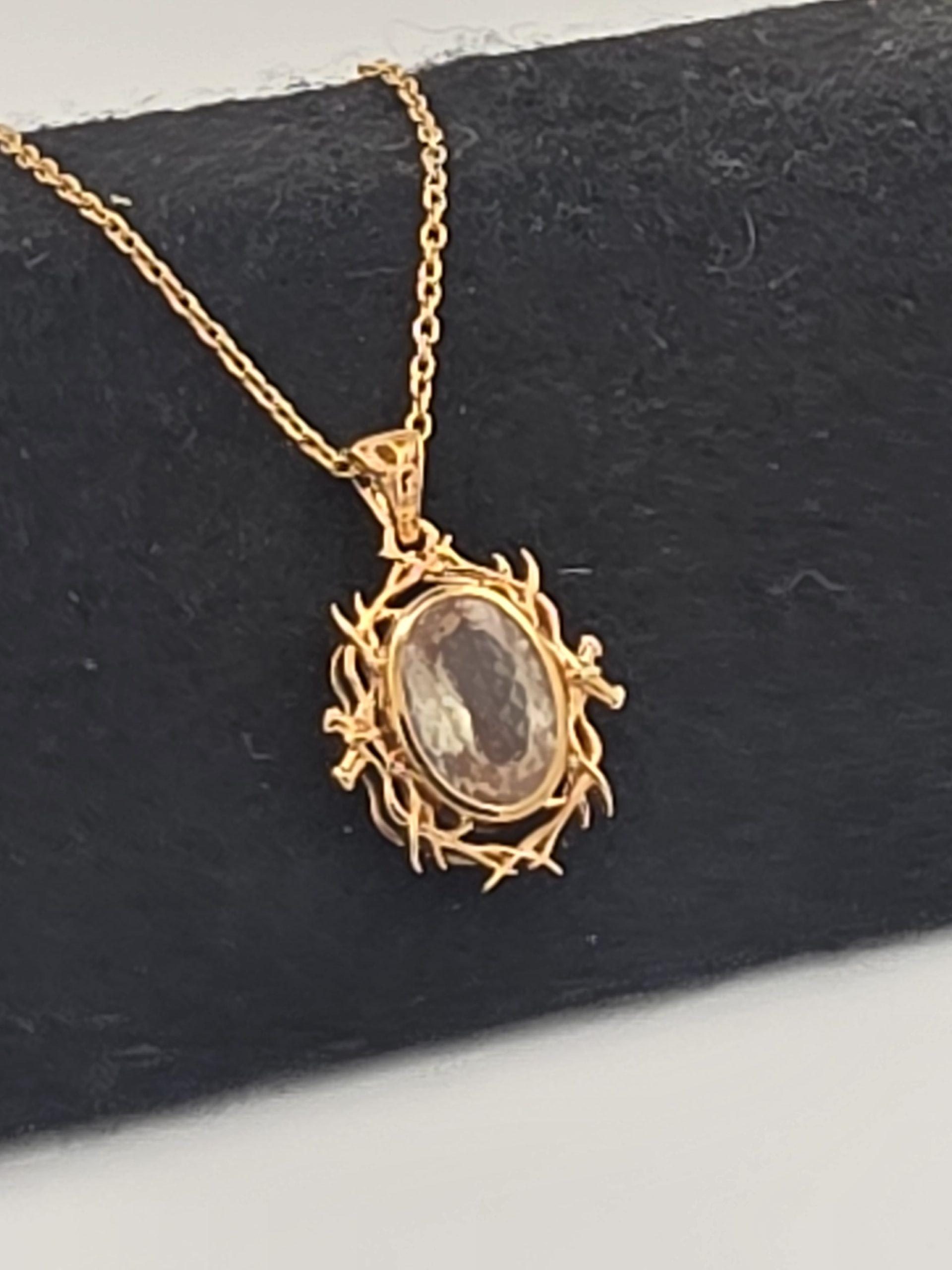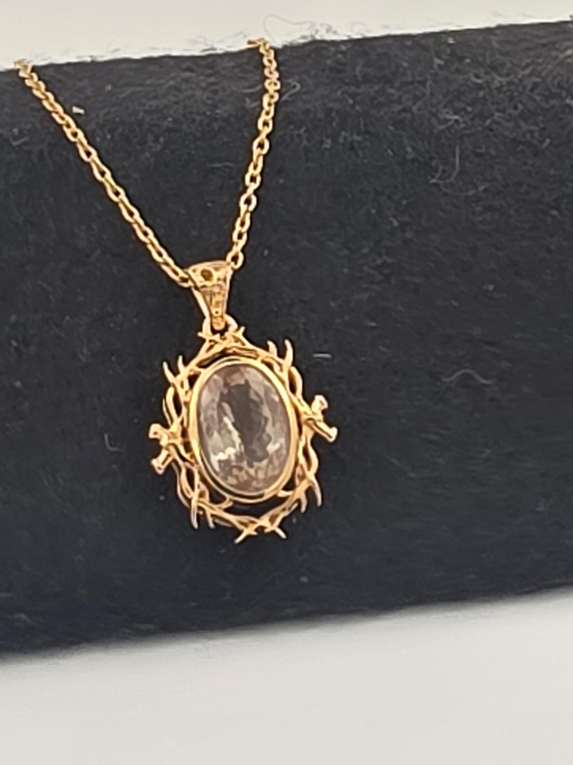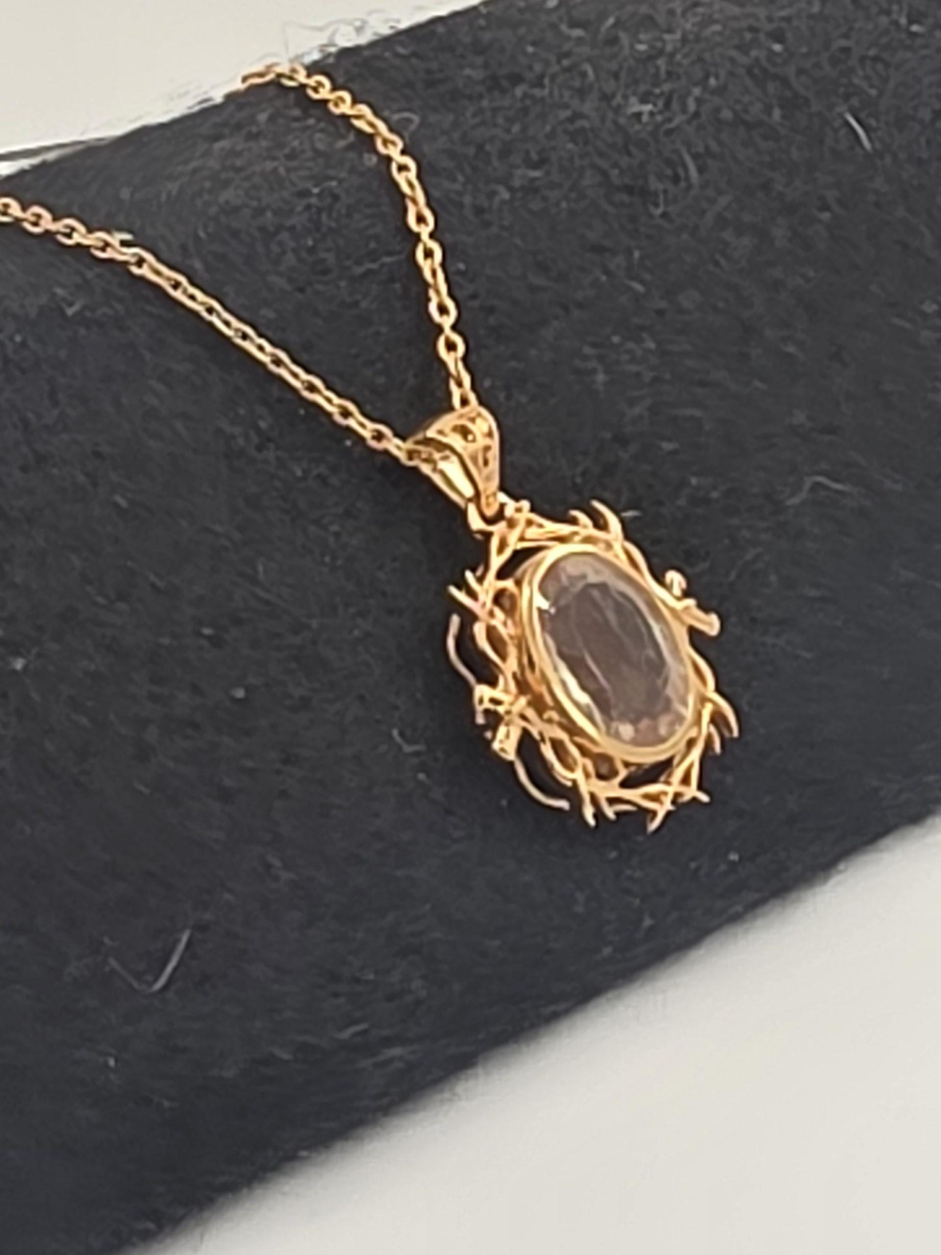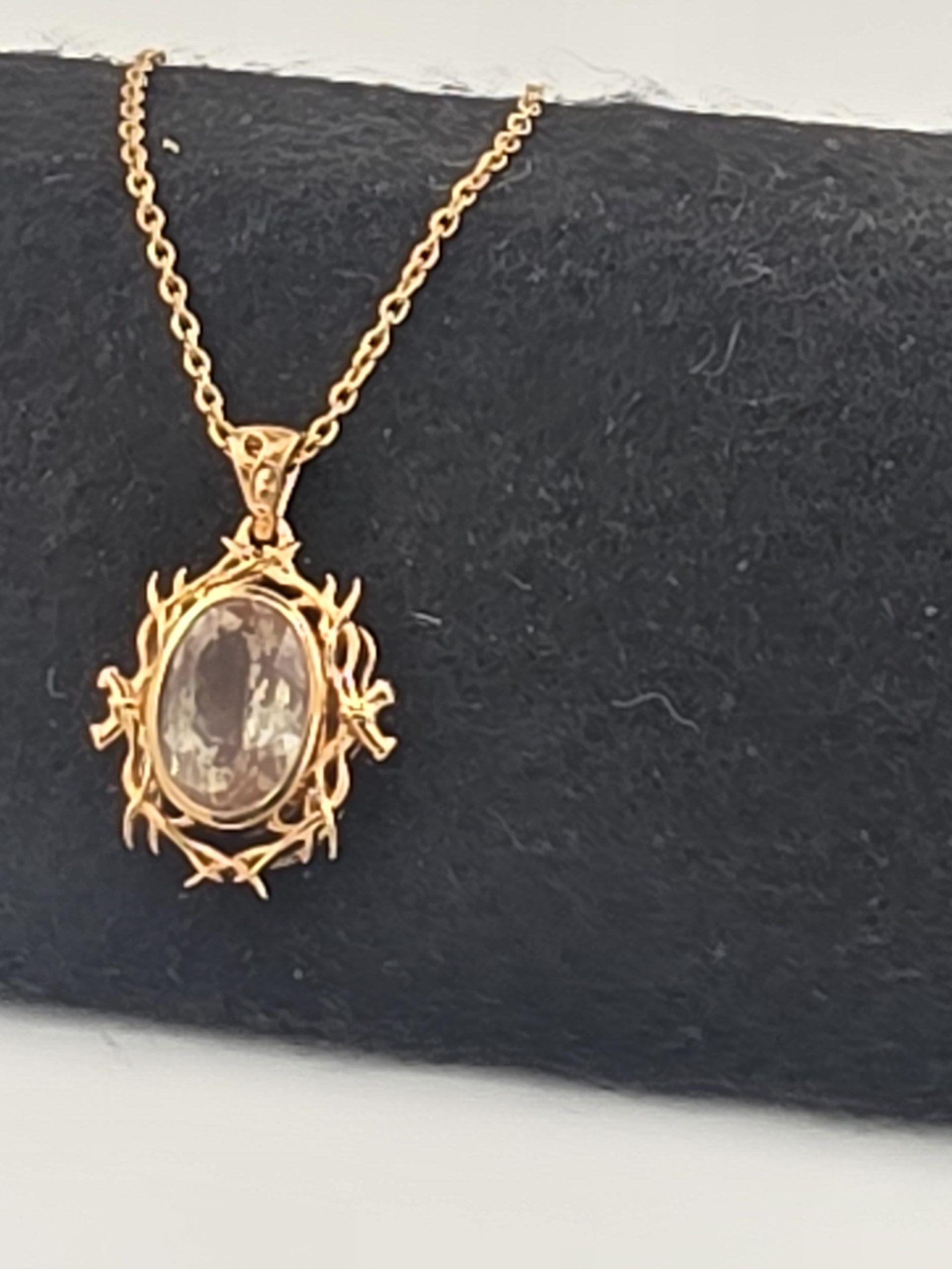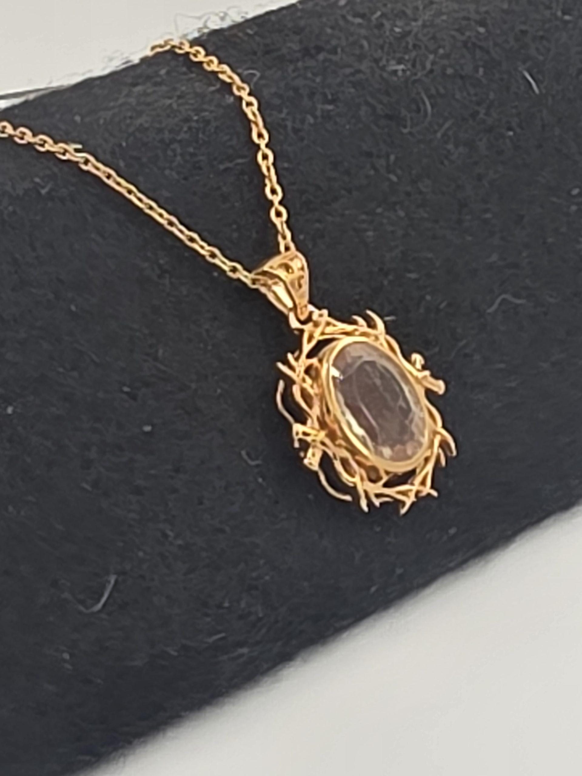 The sunstone is set in a rich gold vermeil finish over sterling silver, giving the piece a warm, luxurious look while keeping it affordable. The decorative setting frames the stone beautifully and adds dramatic presence, making this pendant a standout choice for anyone who loves unique American-mined gemstones and bold jewelry design. Comes with a chain adjustable from 18 – 22″.