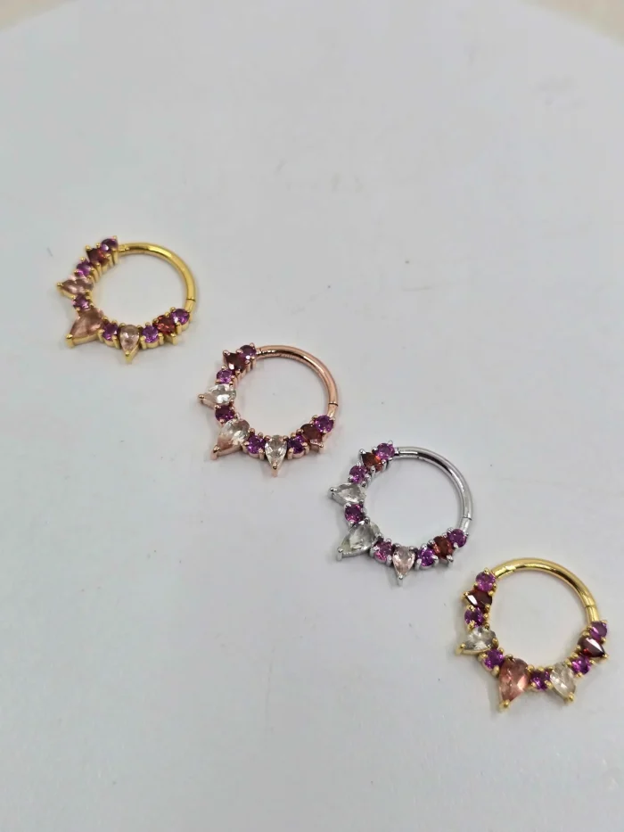 Expertly crafted with deep raspberry Rhodolite Garnets and glowing Oregon Sunstones, this clicker balances rich, moody glamour with warm, sunlit shimmer. Whether you wear it in your septum or daith, Artemis is a statement piece that looks like it belongs in a myth.