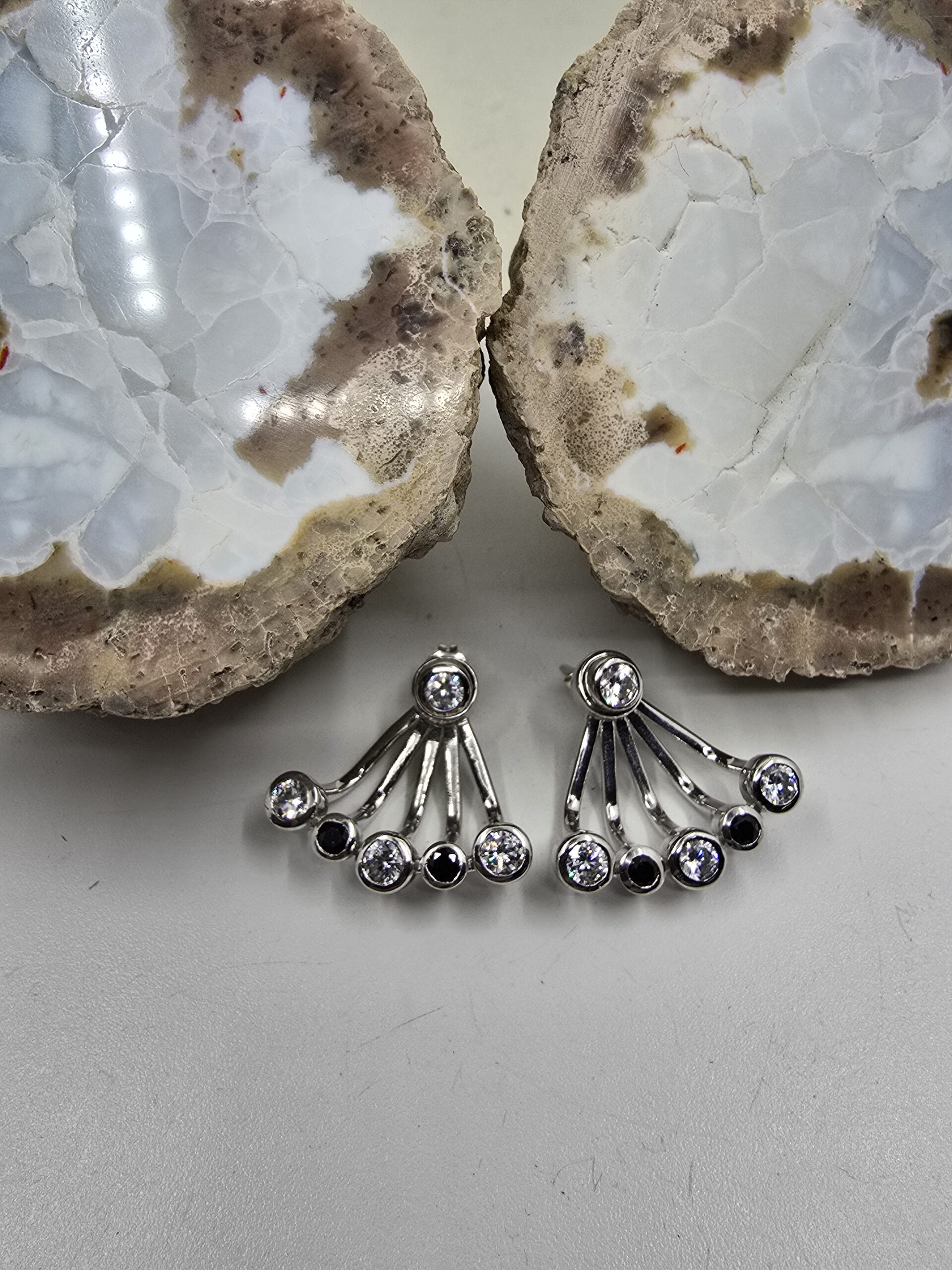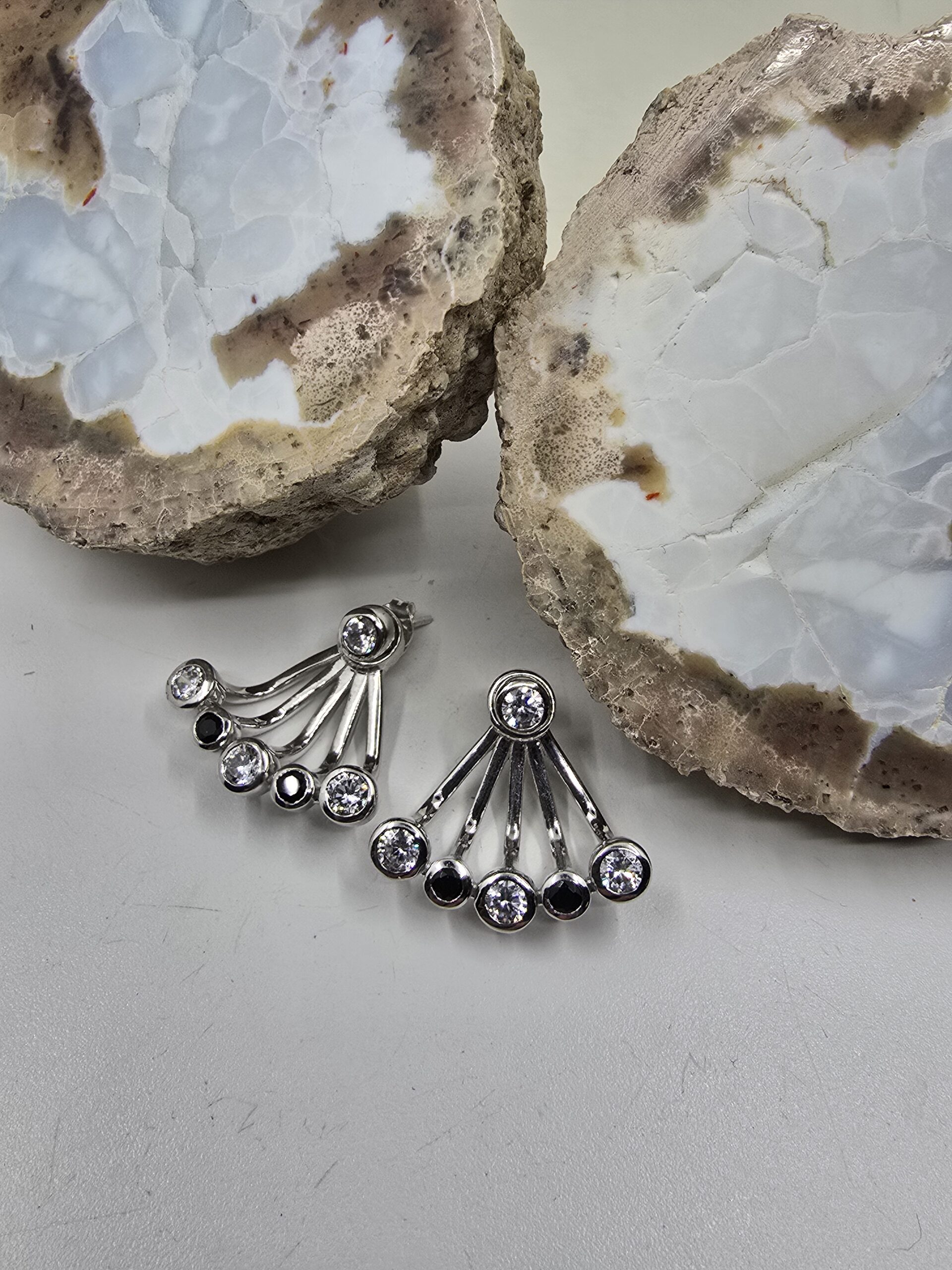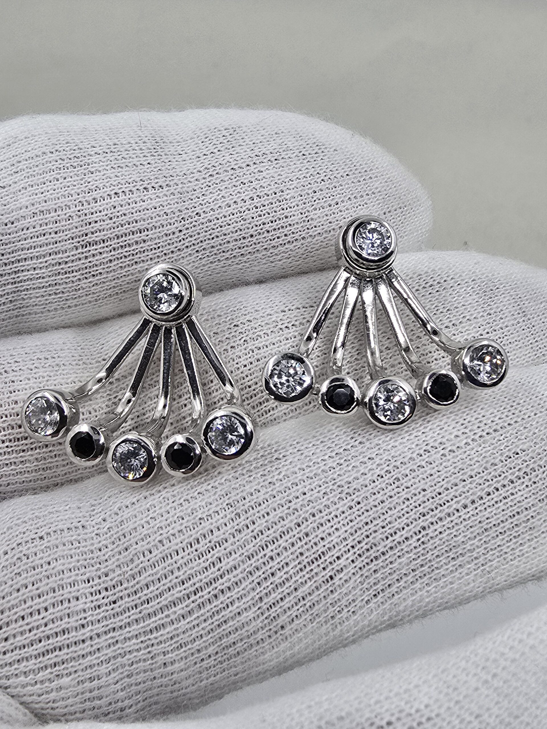 Add bold versatility and sparkle to your jewelry collection with these stunning convertible jacket earrings. Crafted from .925 sterling silver and finished with bright rhodium plating, these earrings are designed to be worn two stylish ways—as classic moissanite studs, or paired with the striking fan-shaped jacket featuring a dramatic mix of moissanite and black spinel.