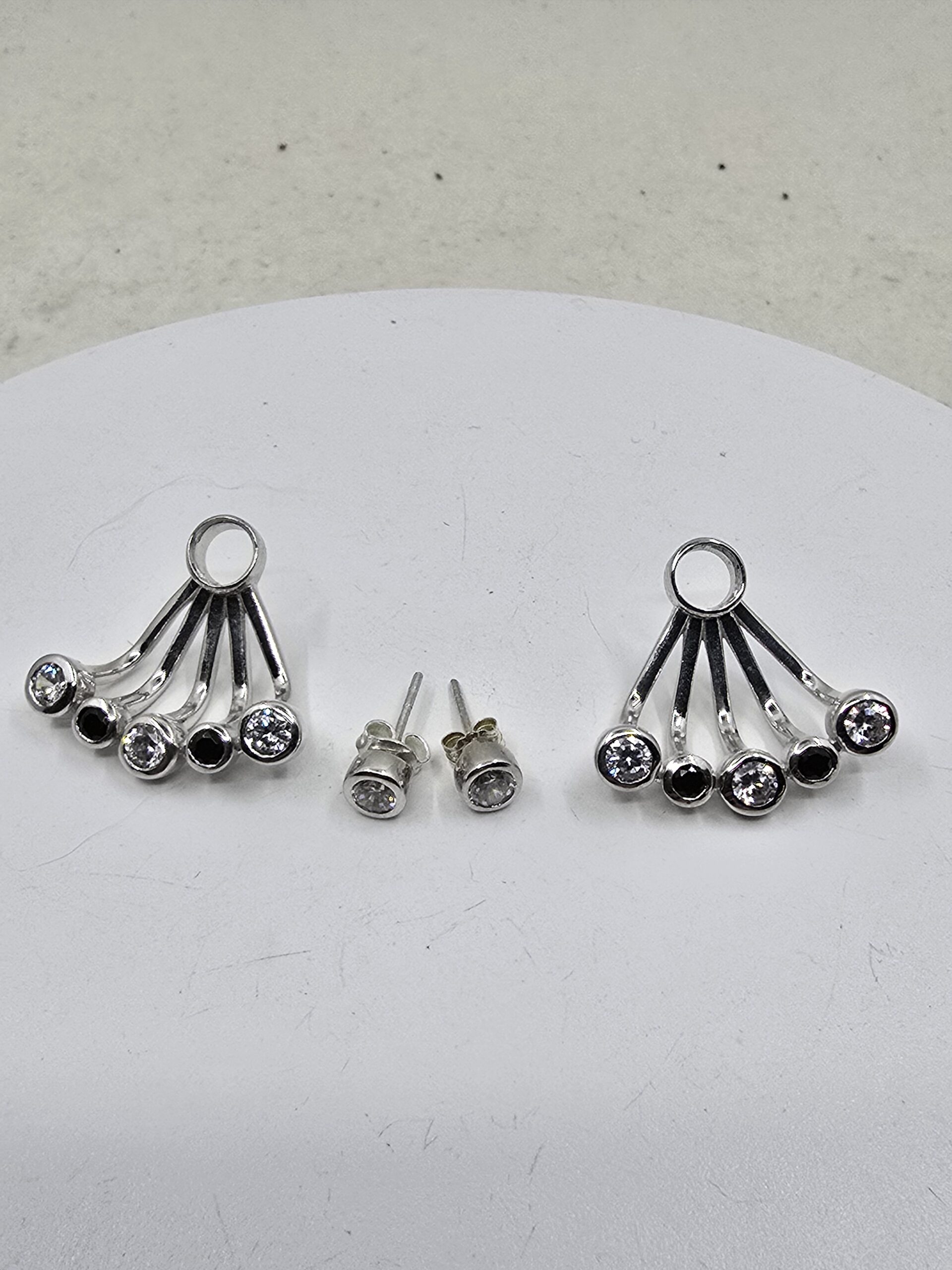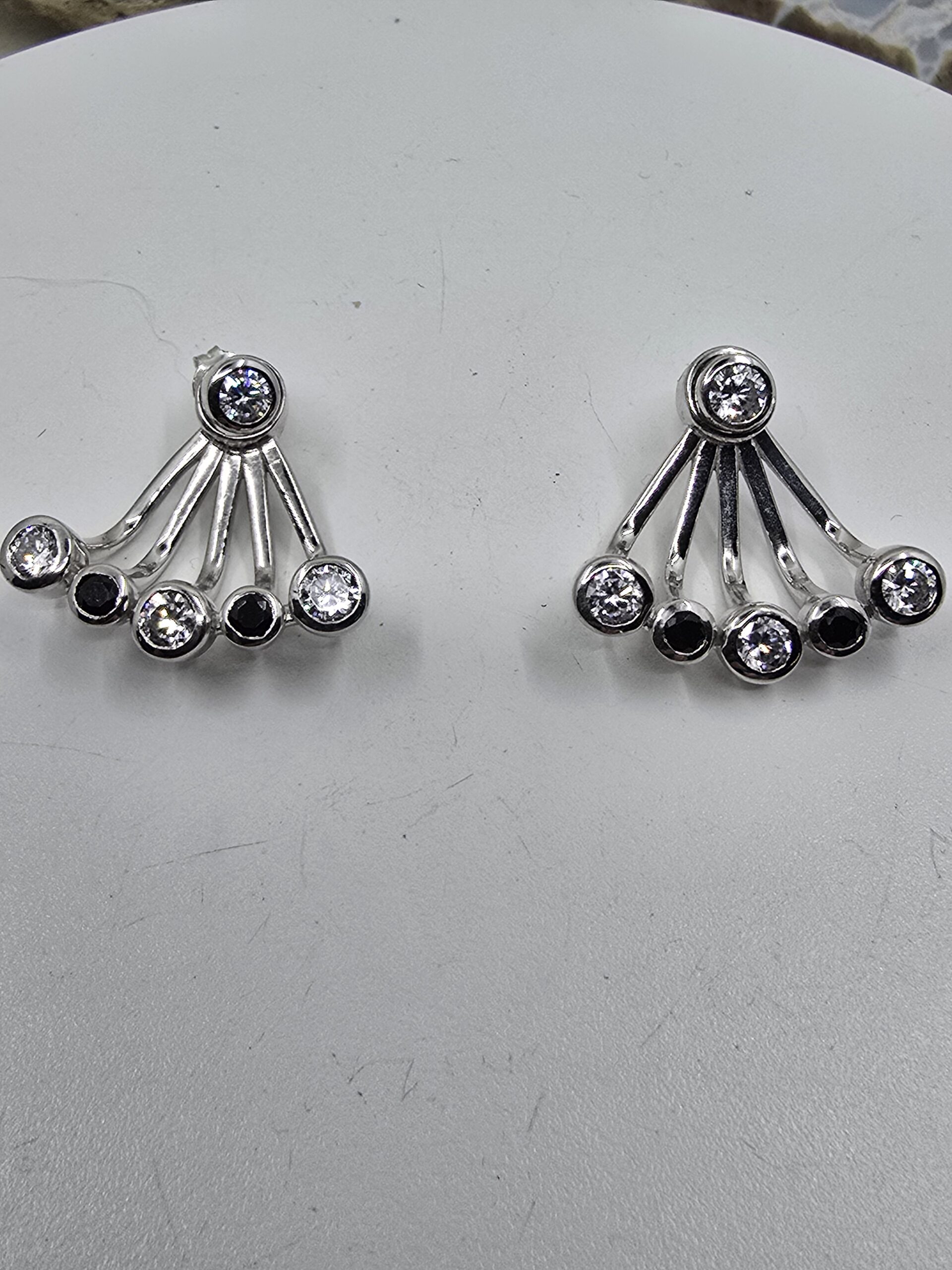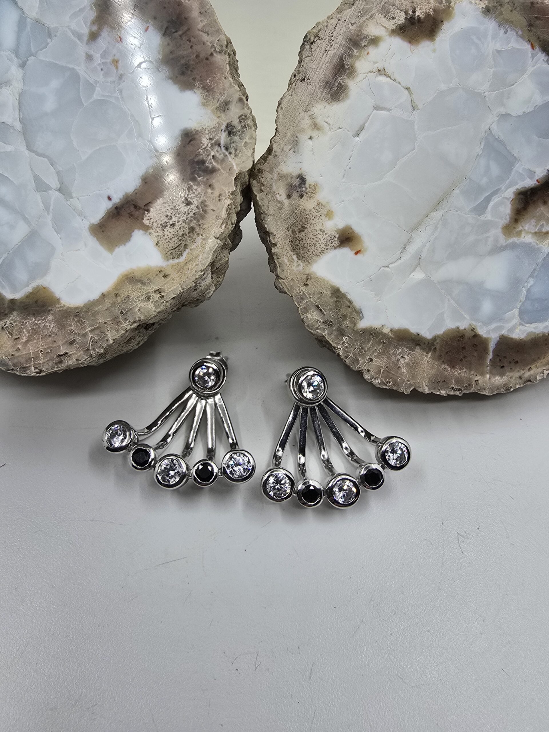 Add bold versatility and sparkle to your jewelry collection with these stunning convertible jacket earrings. Crafted from .925 sterling silver and finished with bright rhodium plating, these earrings are designed to be worn two stylish ways—as classic moissanite studs, or paired with the striking fan-shaped jacket featuring a dramatic mix of moissanite and black spinel.