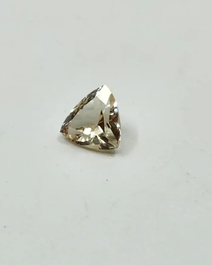 This 1.9ct Oregon Sunstone trillion is champagne in color with a little bit of copper schiller to add some extra sparkle. In the sun, you’ll see shades of pink and green in it as well as that golden champagne color.