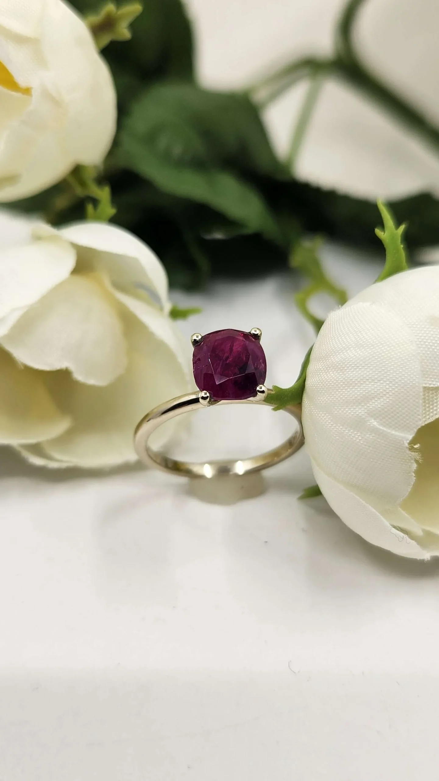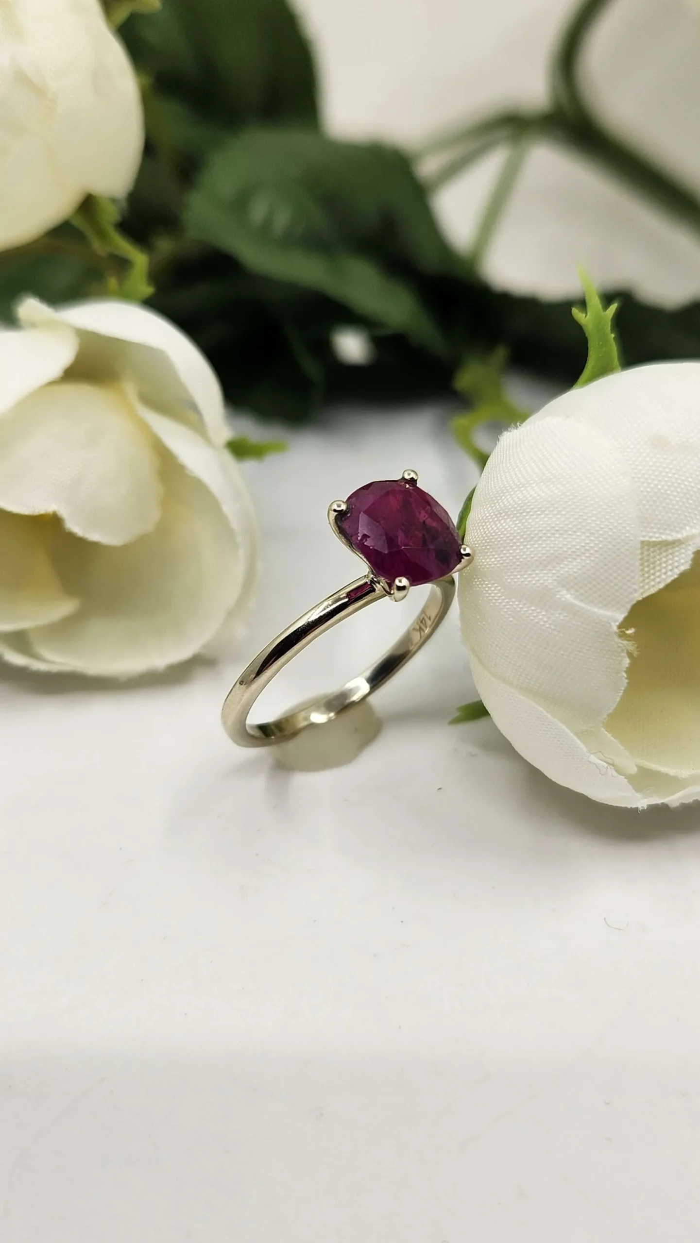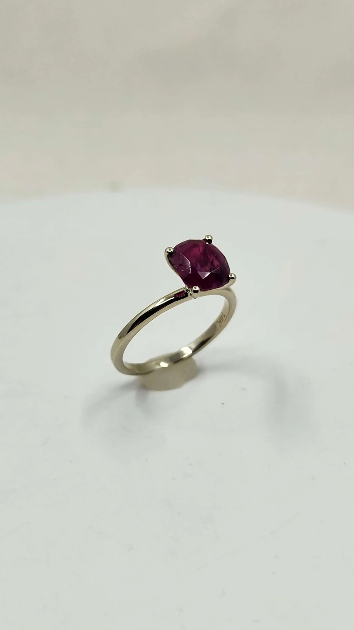 The stone in this ring is a 2.6ct untreated natural ruby from Afghanistan. While there are imperfections, the stone is absolutely gorgeous with a deep velvety purplish red hue.