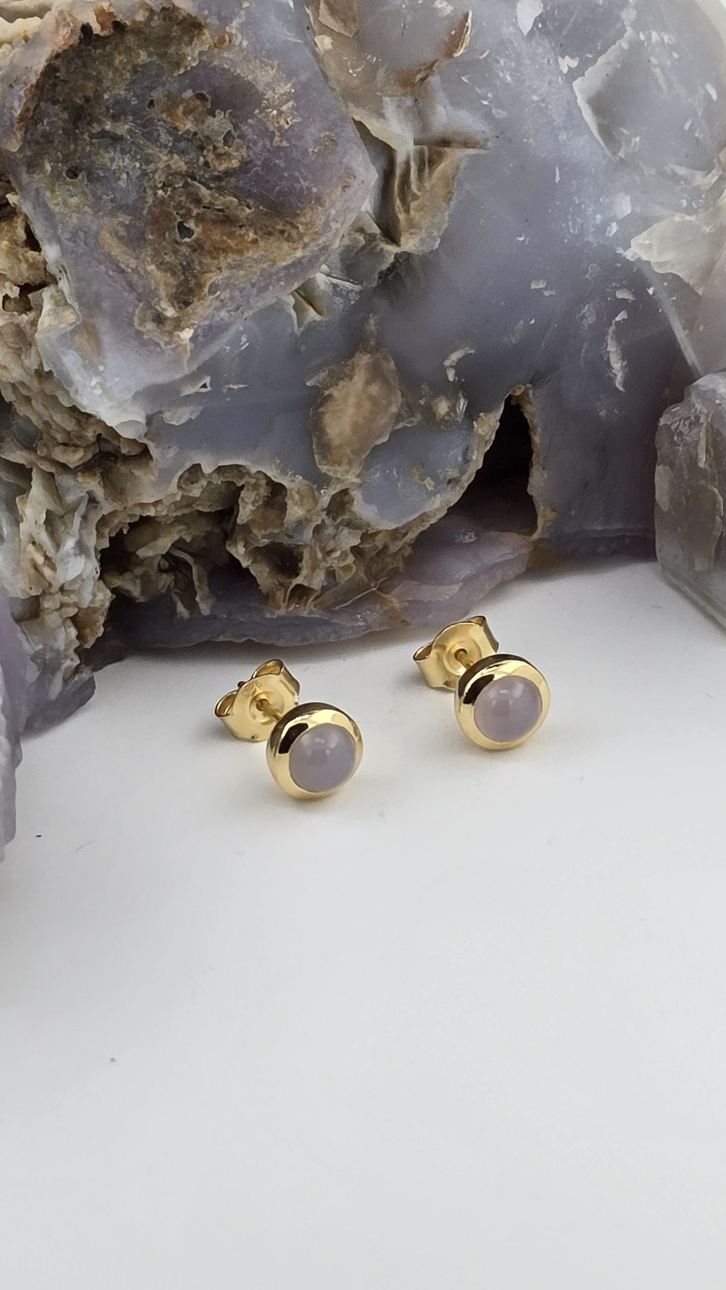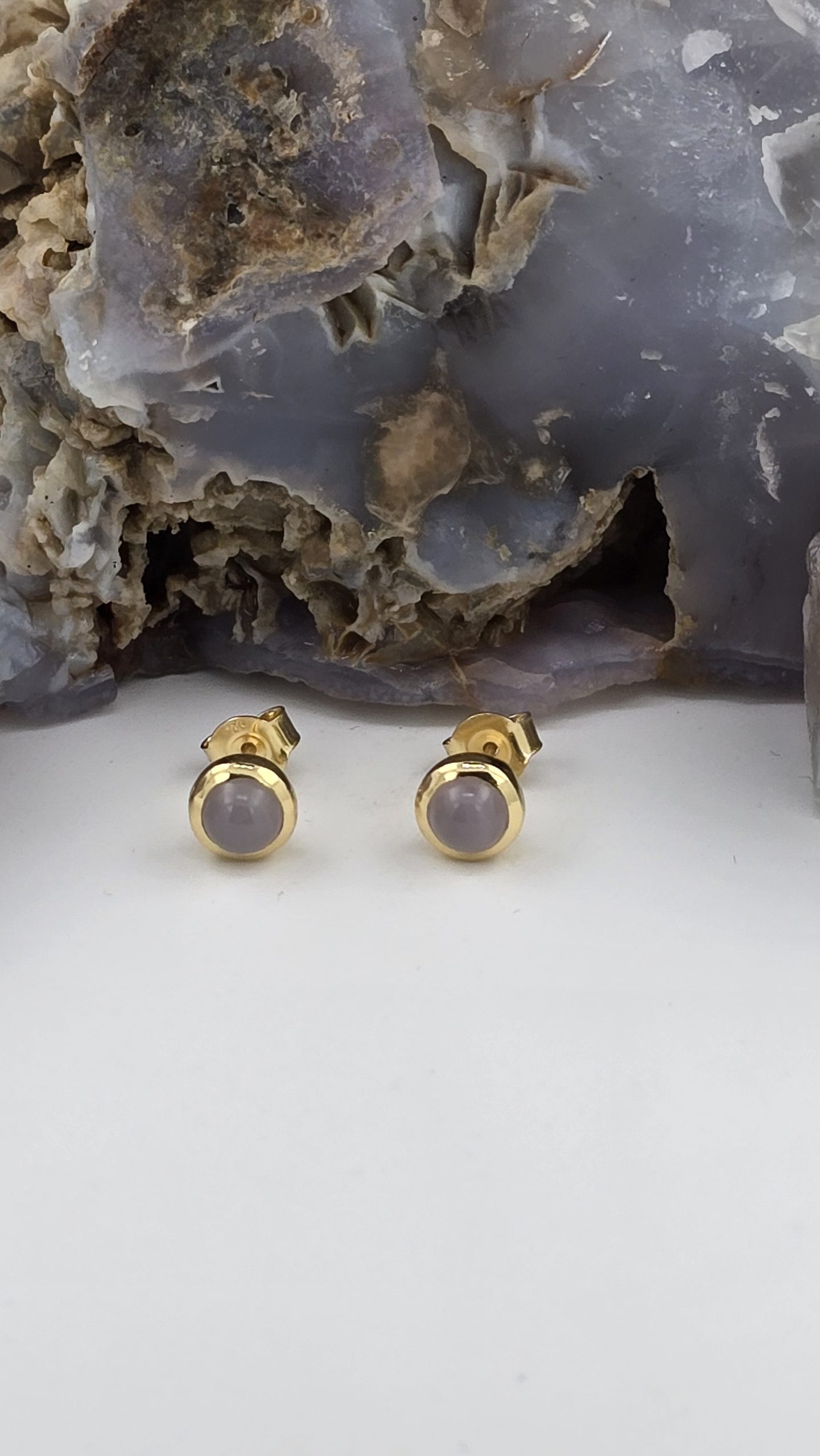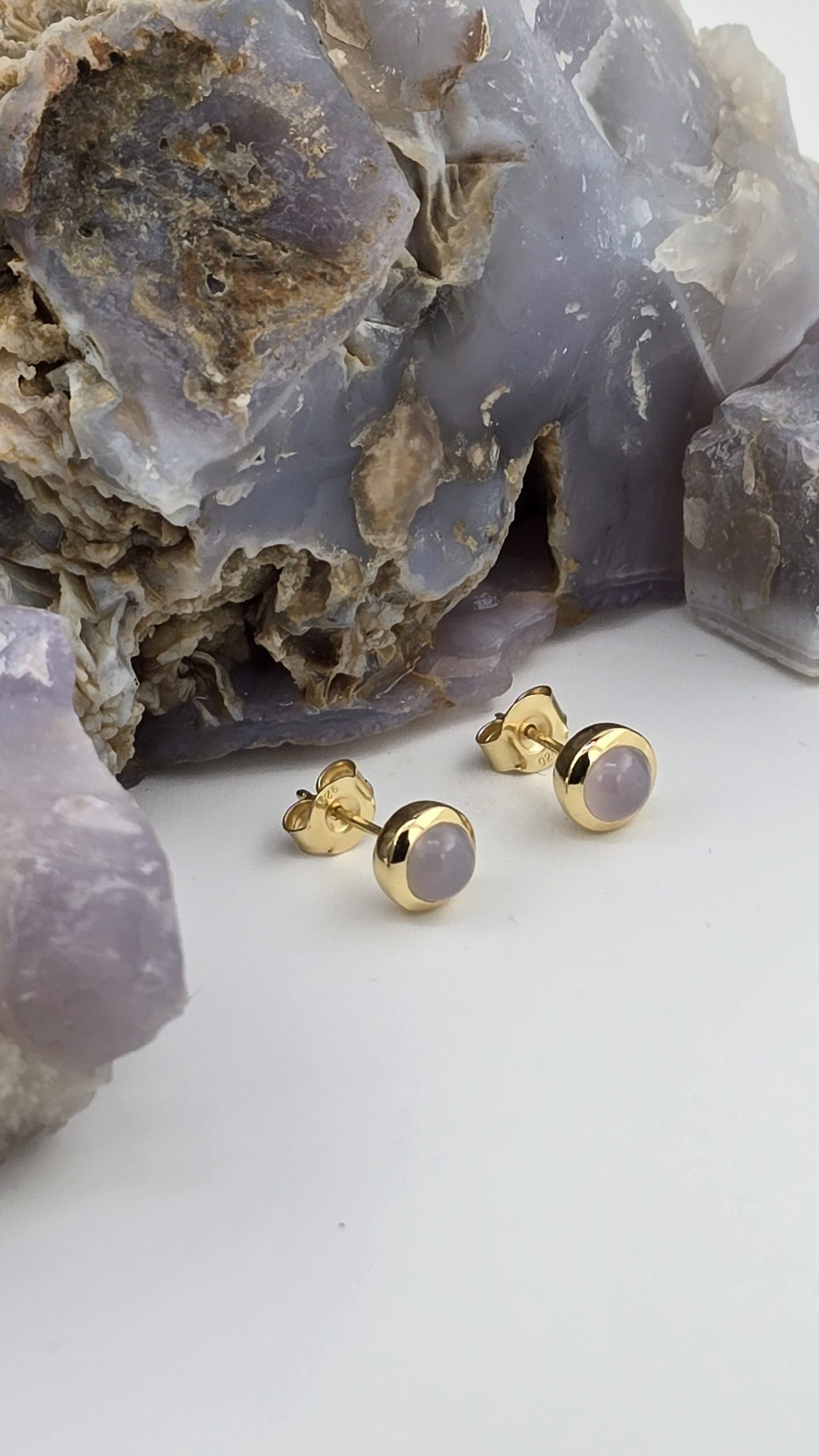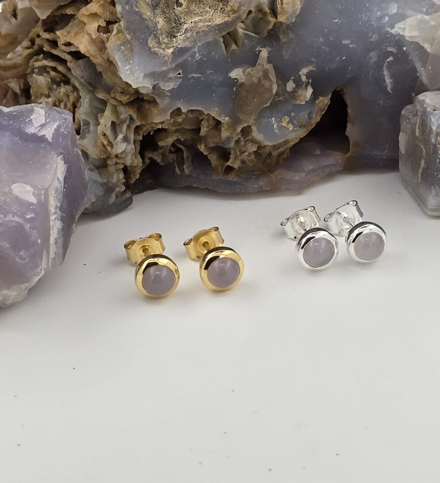 Rare Oregon Holley Blue Agate stud earrings featuring 5mm stones in sleek bezel settings. Soft bluish-lavender color with peachy undertones and a subtle natural sheen. Available in sterling silver or gold vermeil.