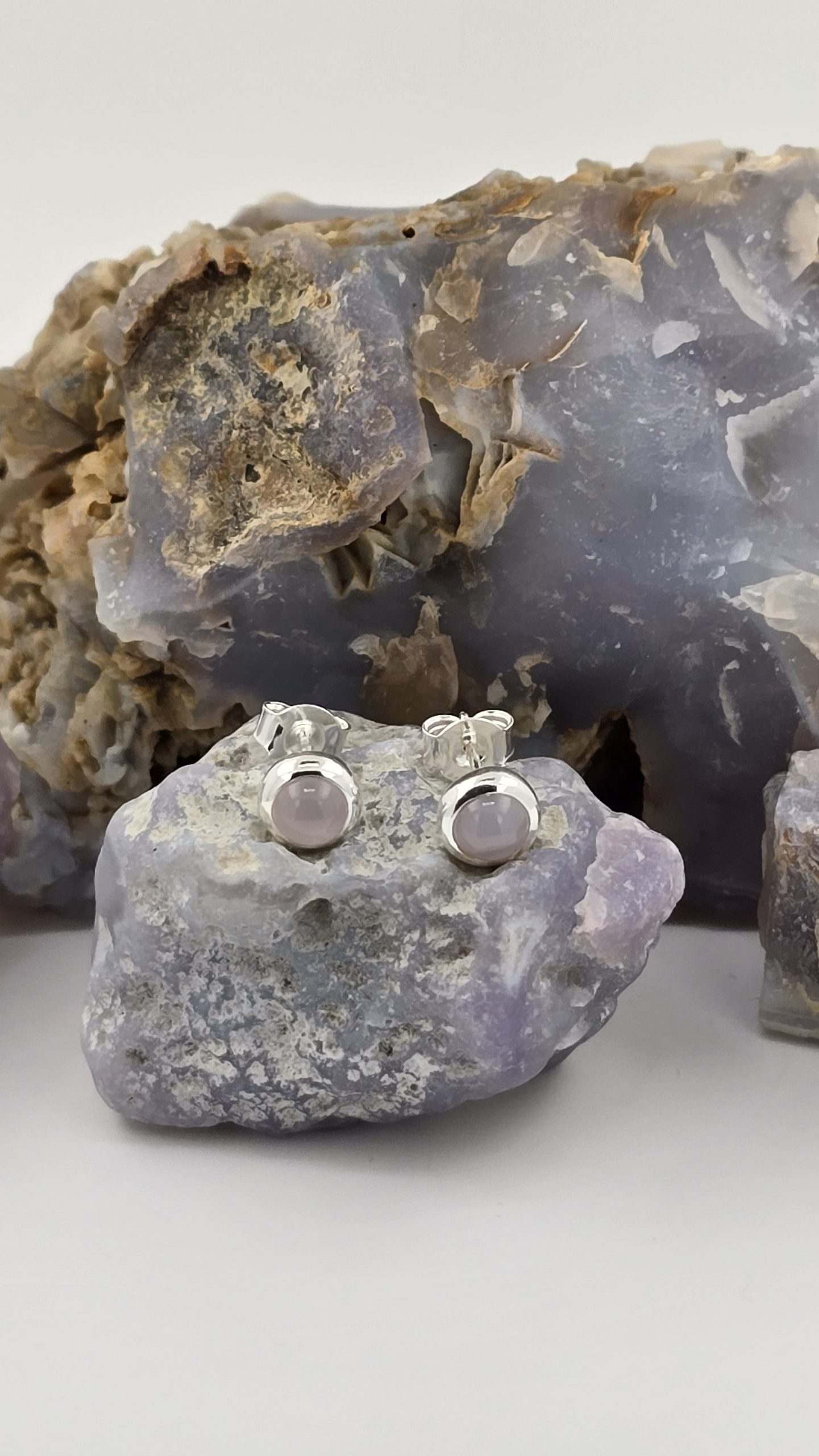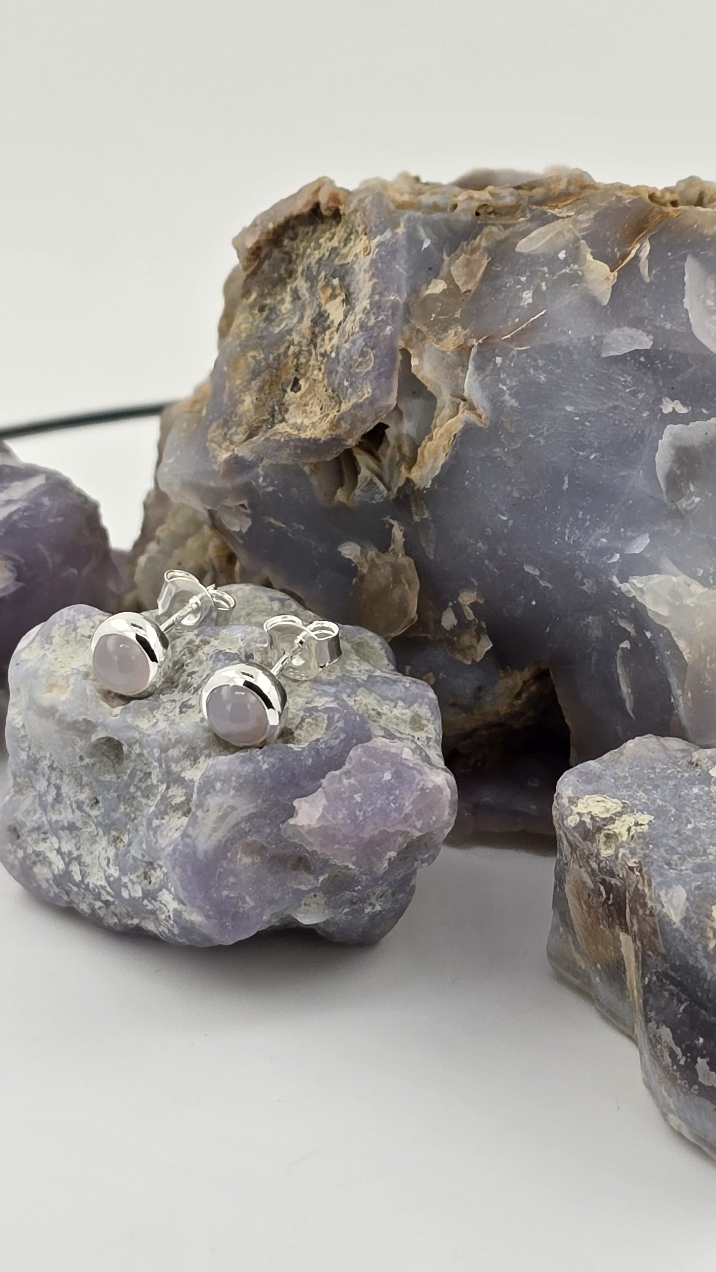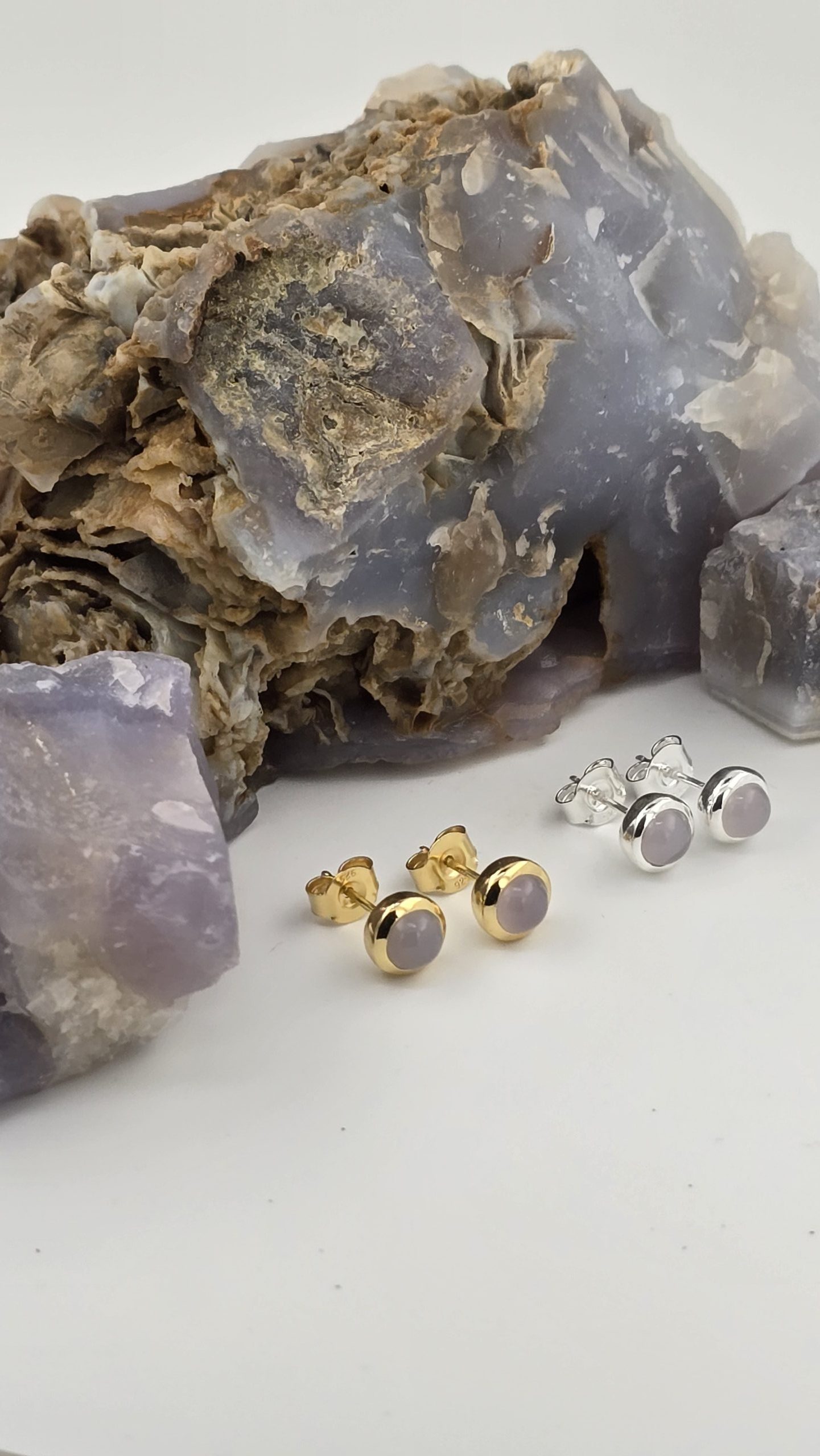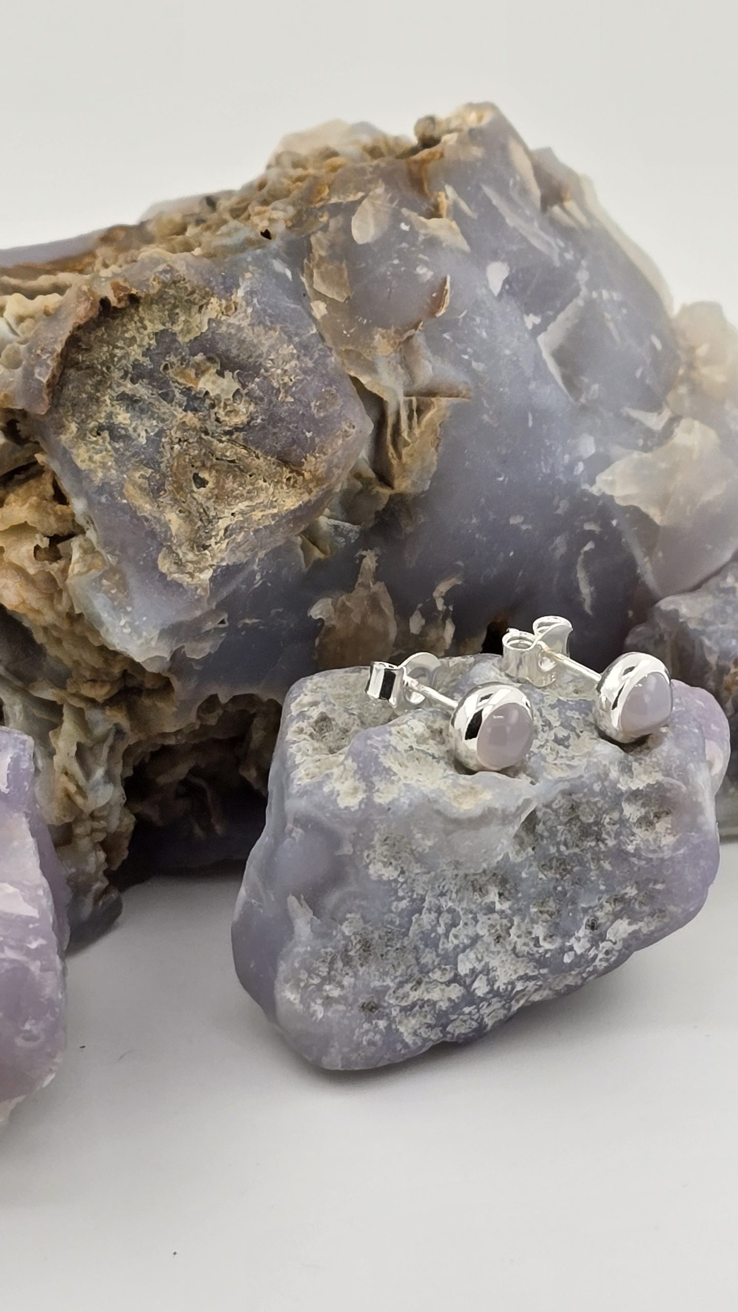 Rare Oregon Holley Blue Agate stud earrings featuring 5mm stones in sleek bezel settings. Soft bluish-lavender color with peachy undertones and a subtle natural sheen. Available in sterling silver or gold vermeil.