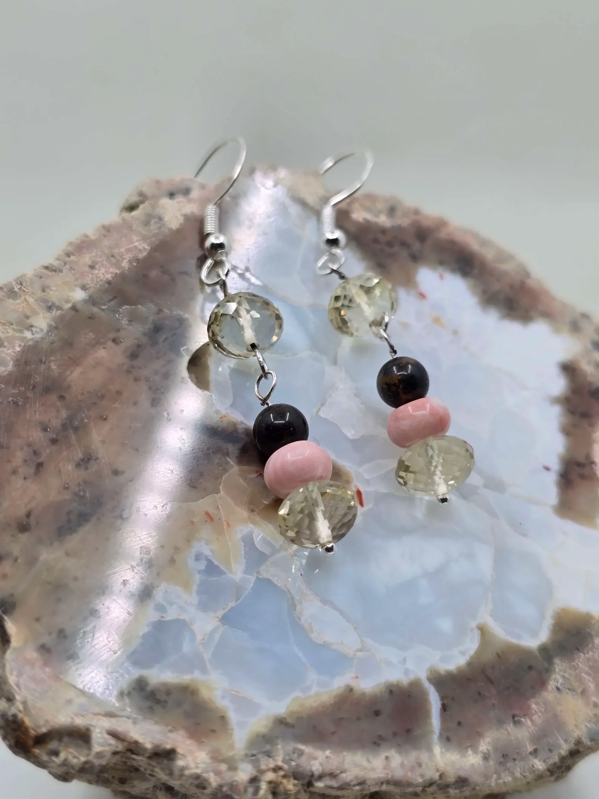 All three stones are Oregon natives. The first is “Vanilla” (or clear) Oregon Sunstone. The second is a “Chocolate” Oregon Fire Opal from Opal Butte near John Day. The third pink stone, you may not be familiar with. It’s a pink common opal, also found near Opal Butte from the Pink Lady mine. This one, I call “Strawberry” pink opal. It’s rounded out by another sweet “Vanilla” Oregon Sunstone bead.