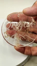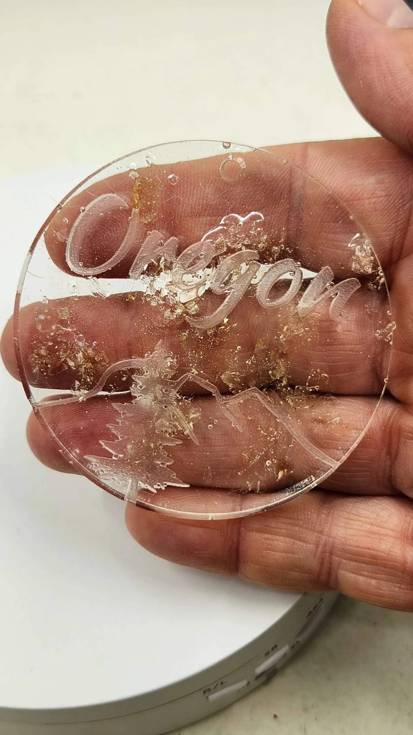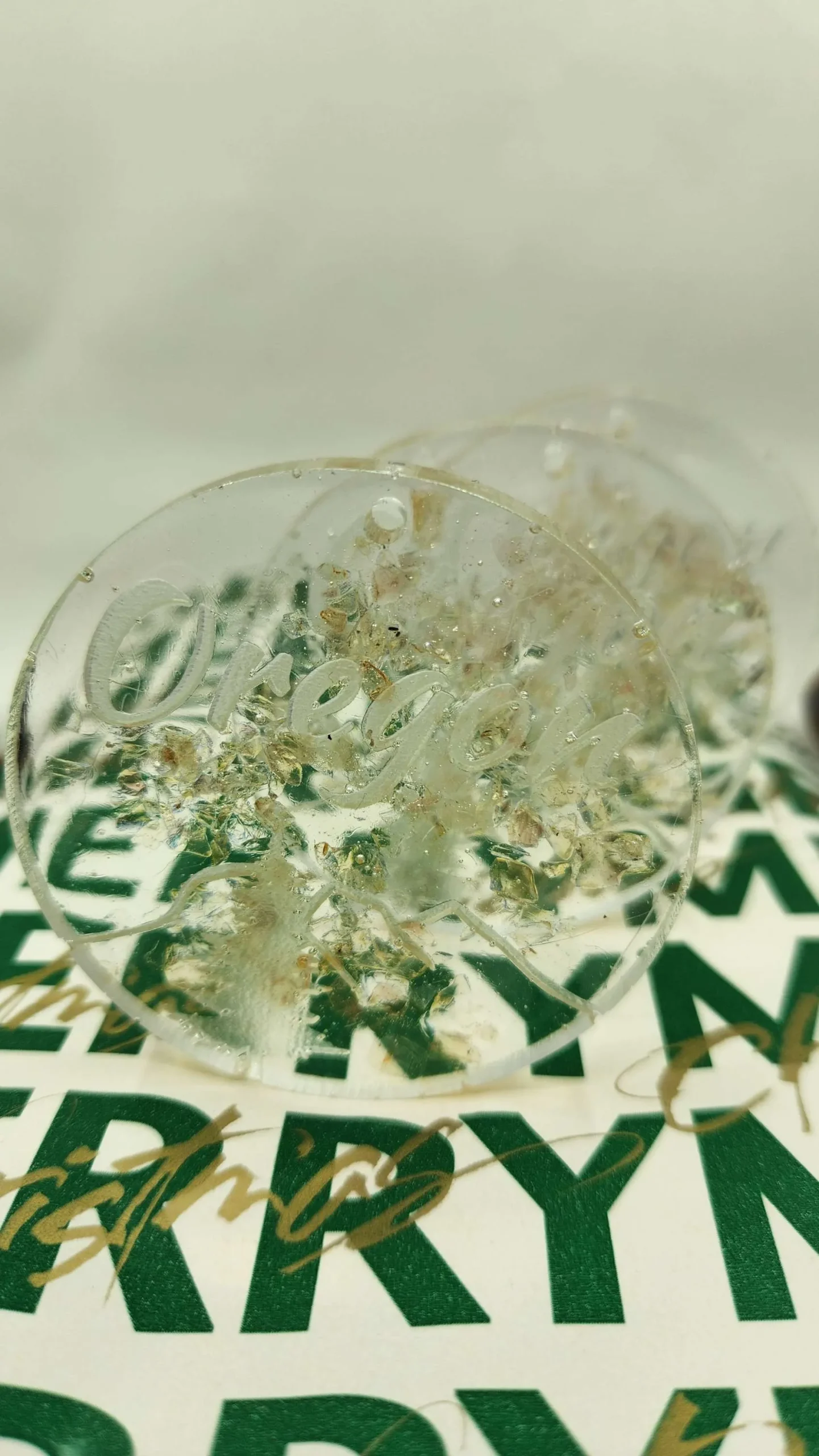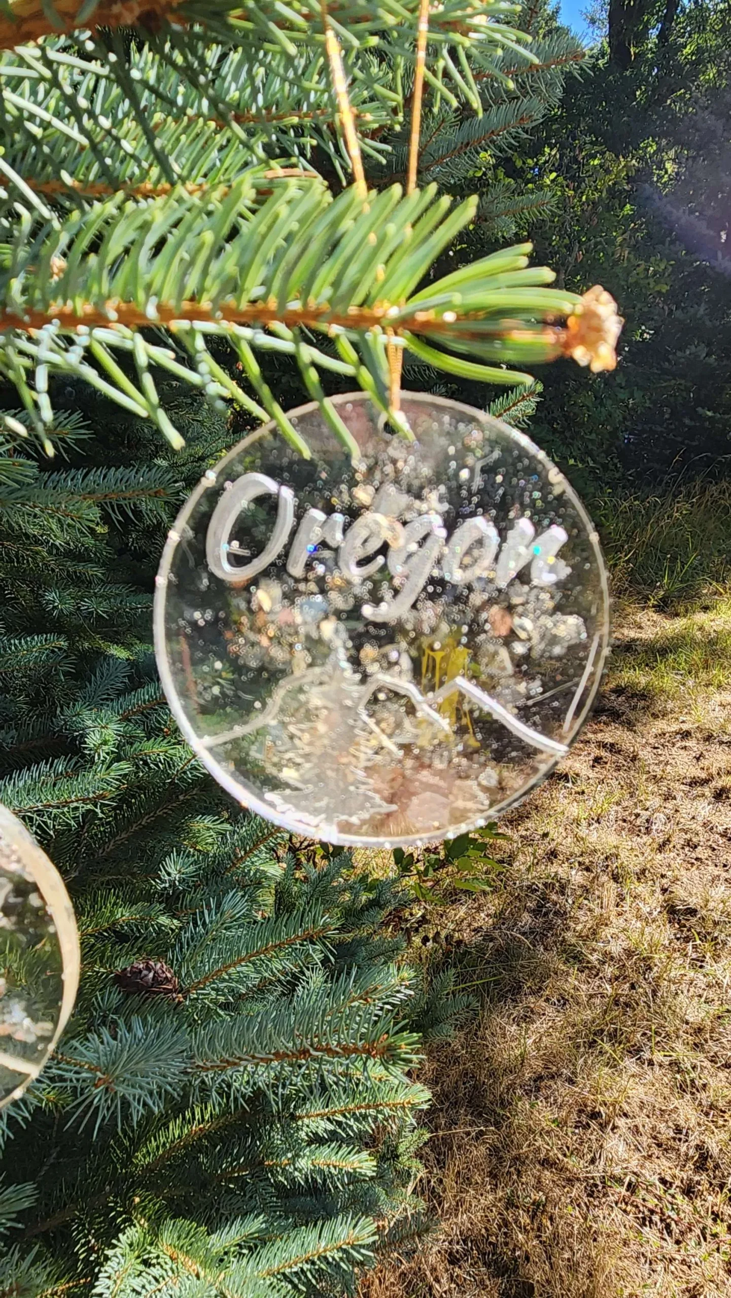 A beautiful Christmas tree ornament crafted from crushed Oregon Sunstone and epoxy resin on a piece of shimmering gold elastic.