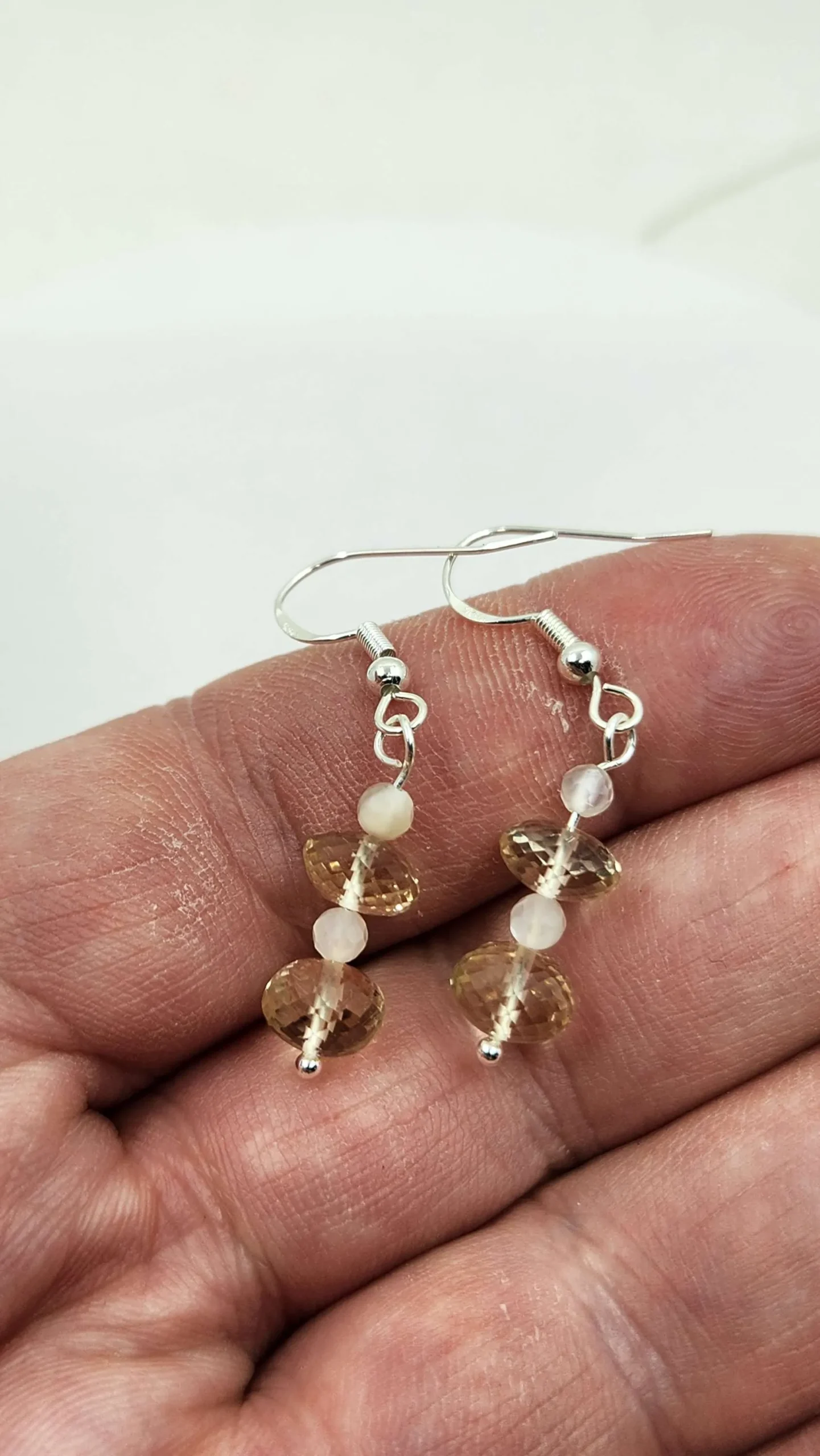 This pretty pair of dangle earrings has two Oregon Sunstone beads and two moonstone beads on each. The total length is about 1″, so they’re not overly long.