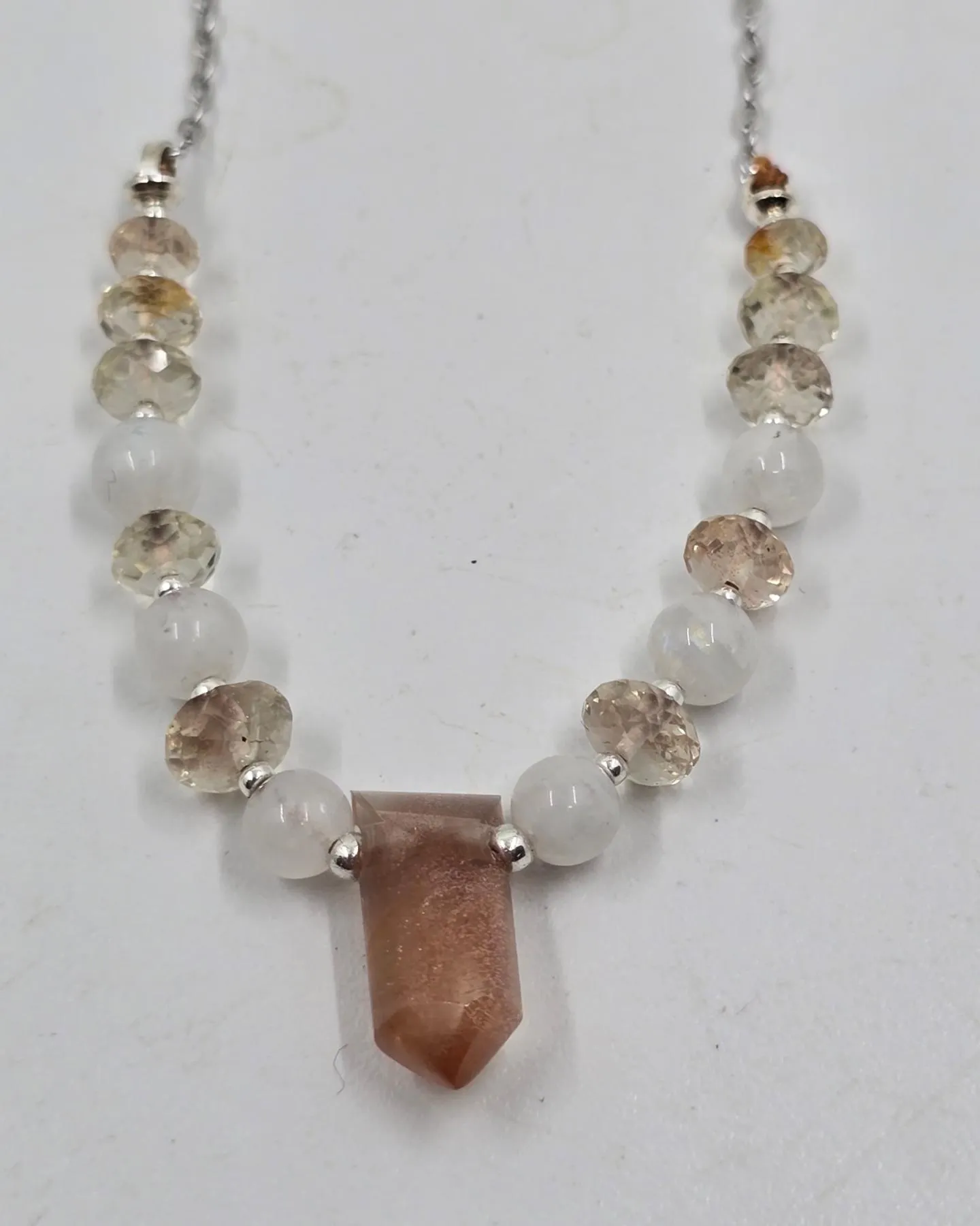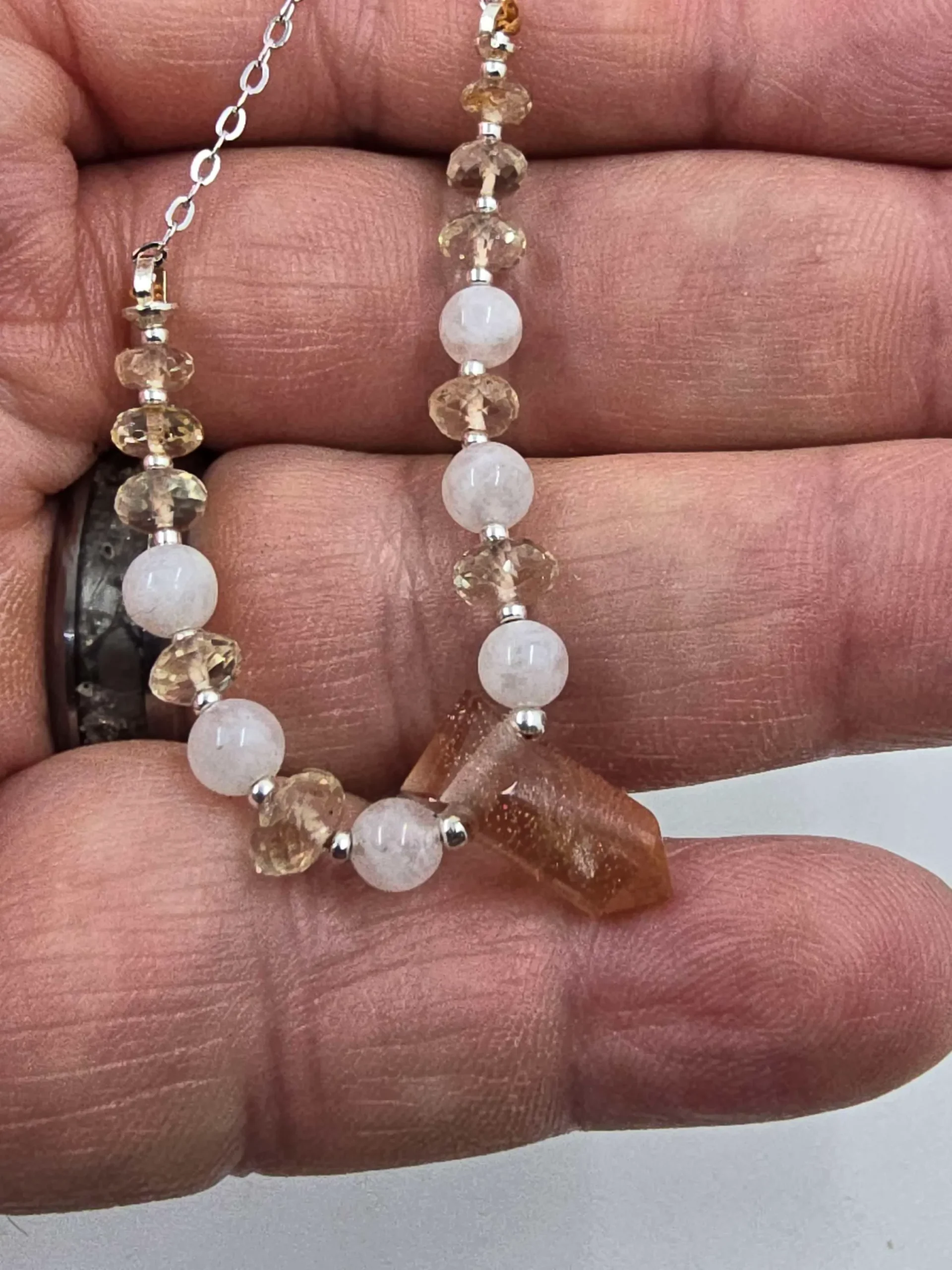 This necklace features a nicely hand worked piece of very shillered Oregon Sunstone at the center of it, surrounded by faceted Oregon Sunstone beads with dazzling copper schiller and shimmering adularescence from moonstone beads. The overall length is just over 20″, including the sterling silver chain it’s attached to.