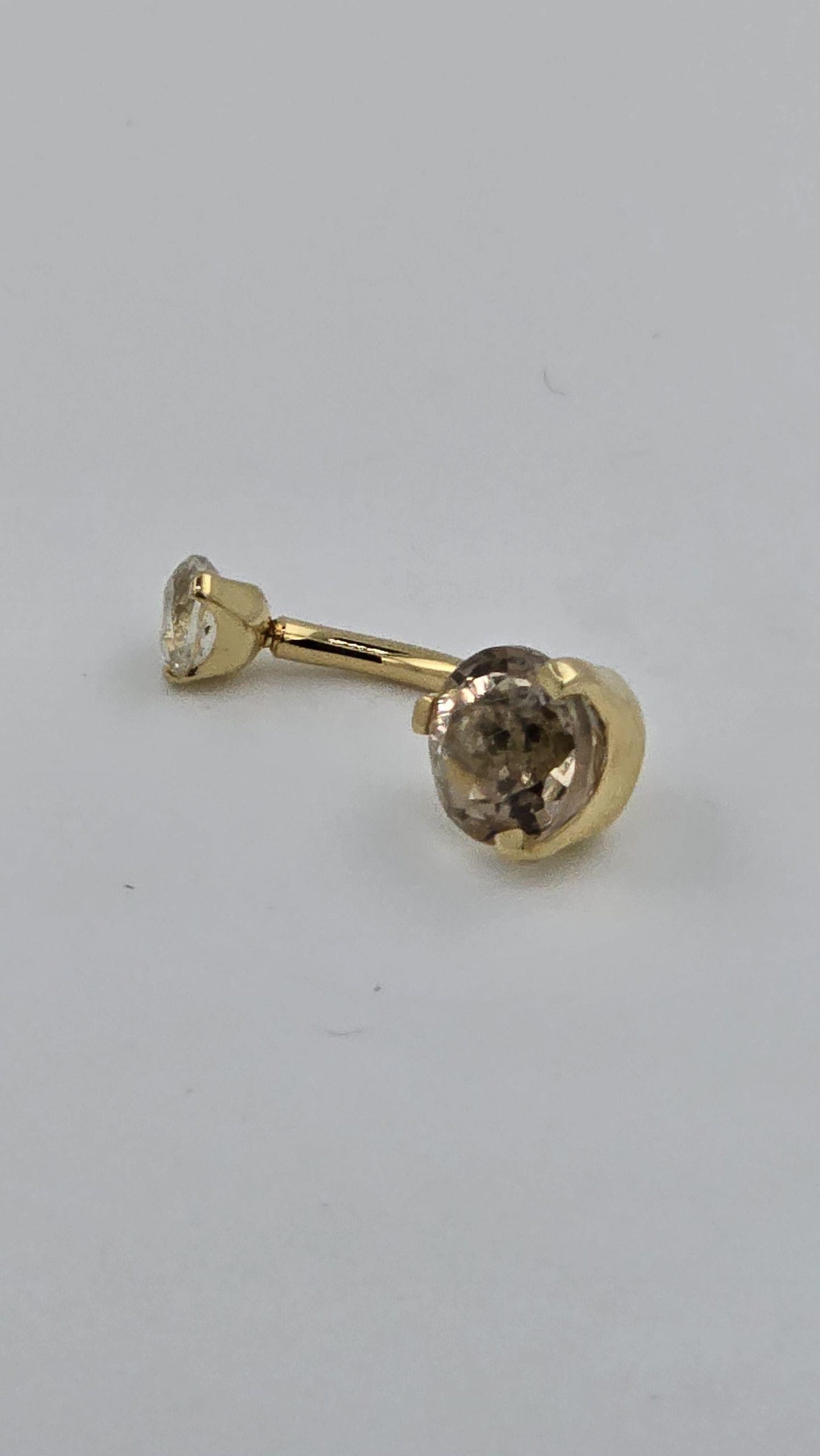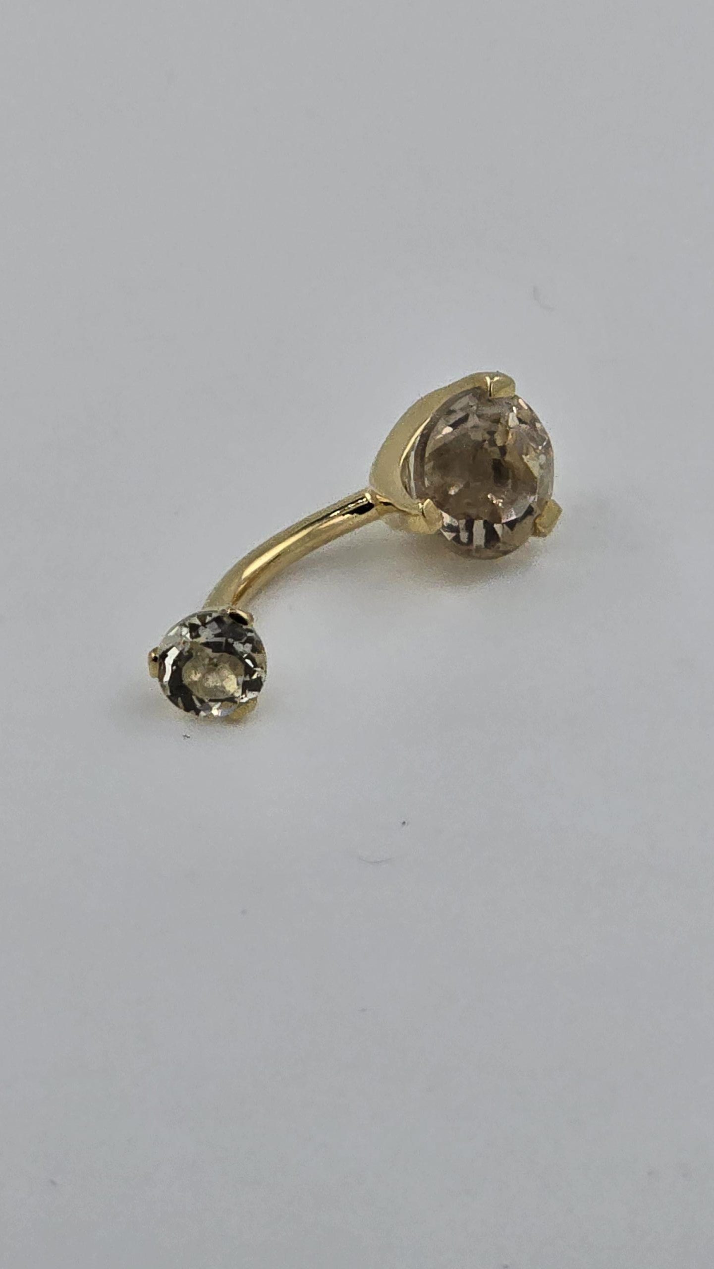 This belly ring features two round faceted Oregon Sunstones set on a classic curved barbell. The warm champagne-to-peachy tones of Oregon Sunstone give this piece a soft glow that stands apart from mass-produced body jewelry. The threaded design makes it secure and easy to insert, while the polished finish keeps the look sleek and comfortable for everyday wear.