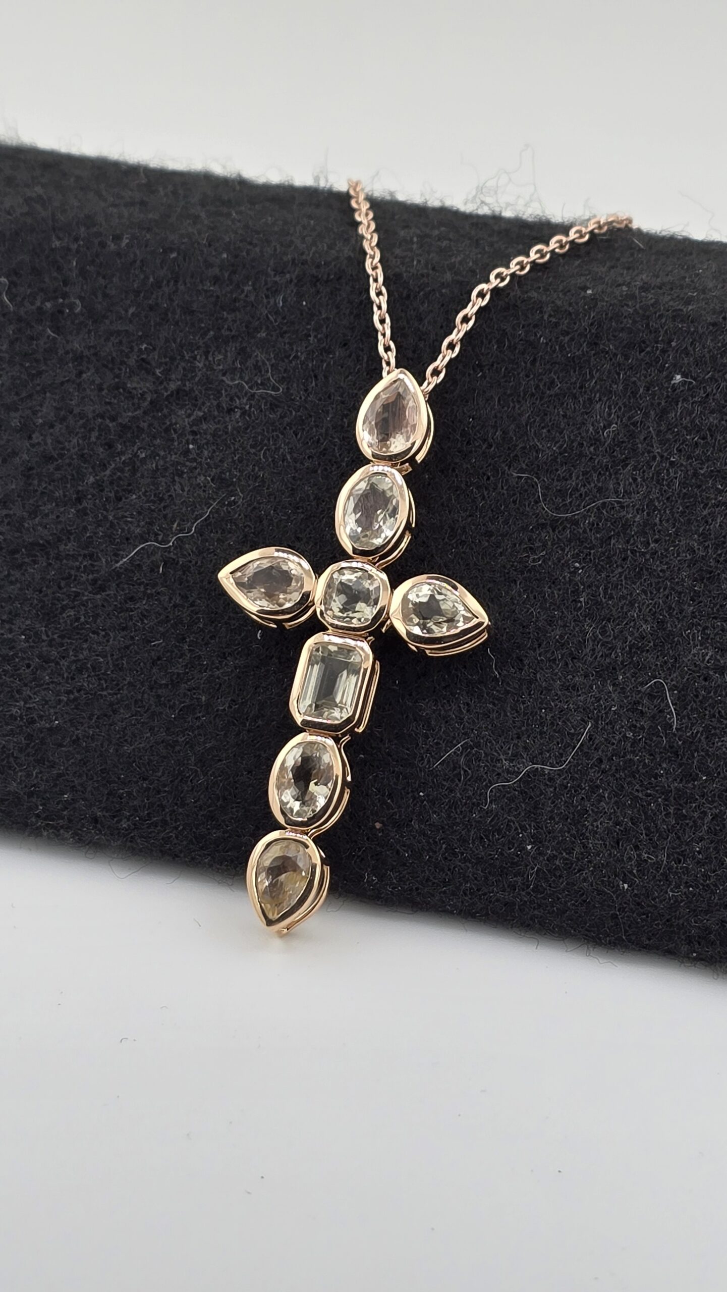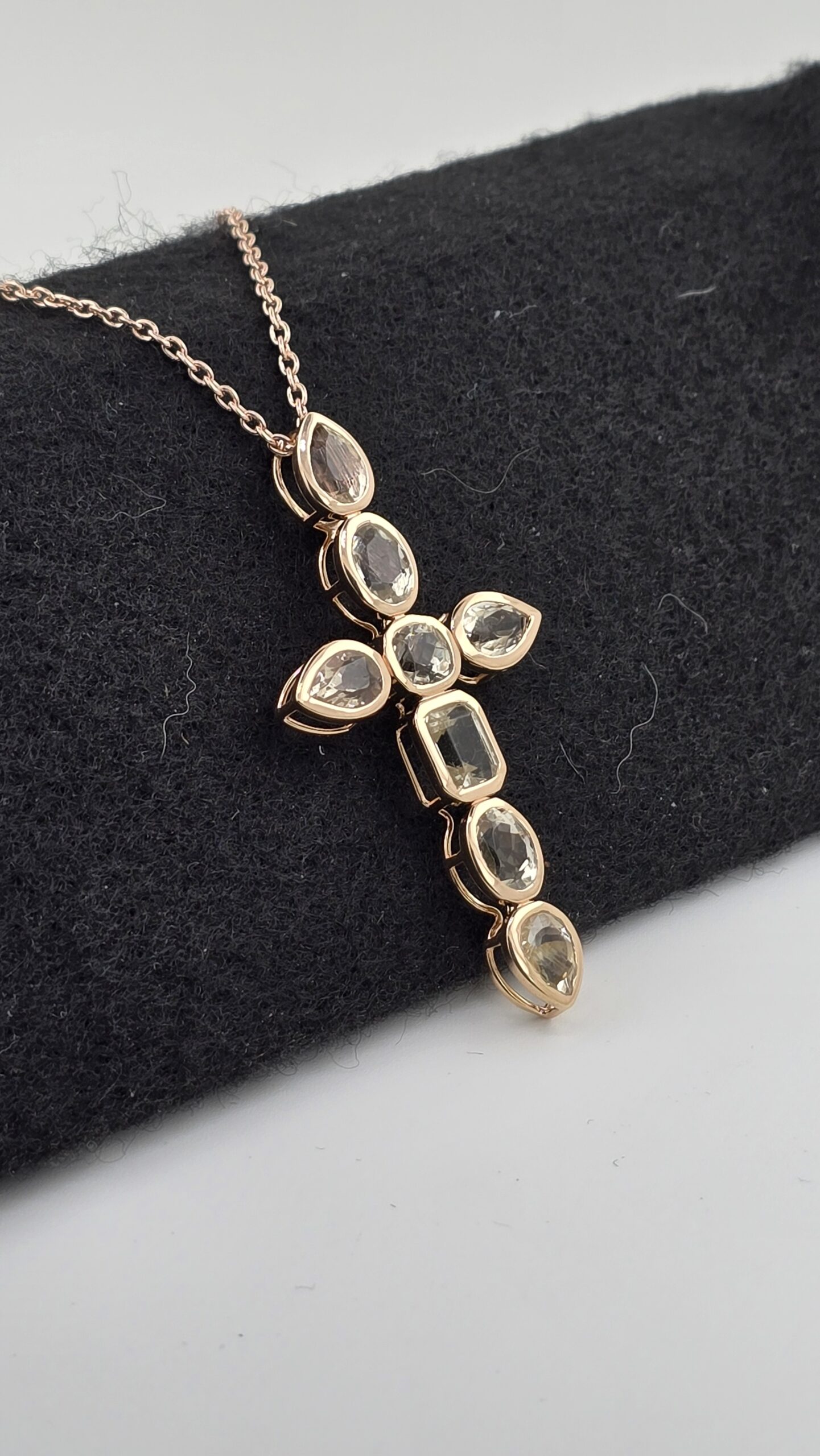 Each gemstone is individually bezel-set in warm rose gold vermeil, highlighting the natural tones of the stones and creating a timeless, elegant silhouette. The cross design makes this piece a meaningful symbol of faith, love, and light — perfect for any occasion.