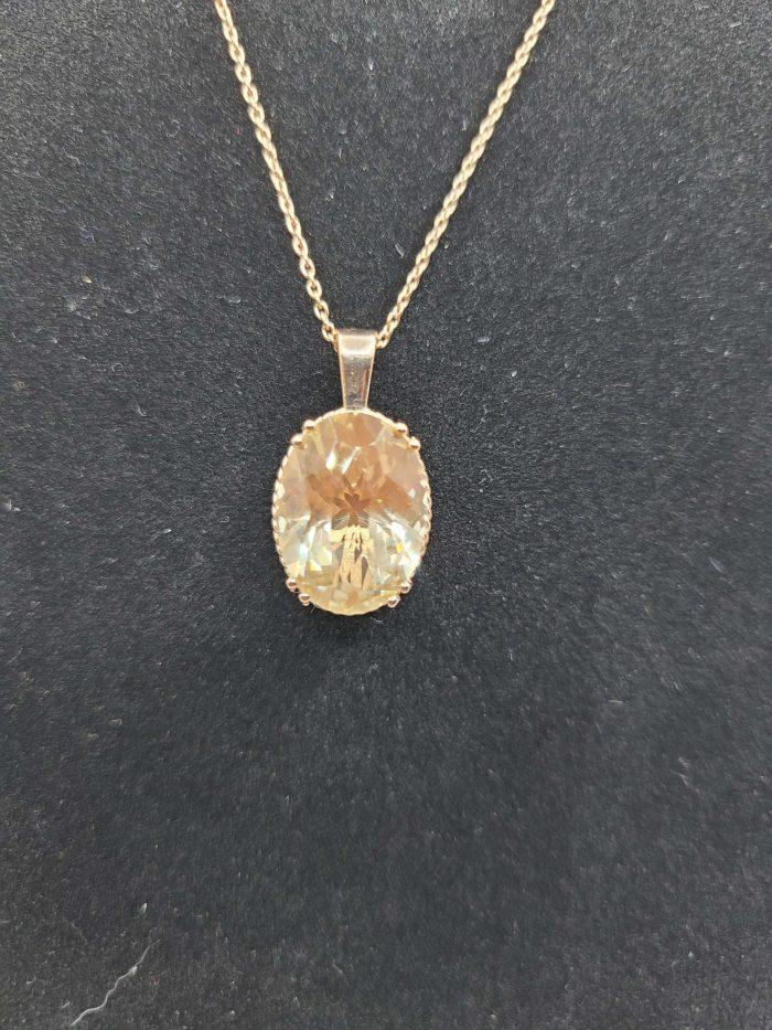 This pendant is truly spectacular. The center stone is a whopping 10.5ct pink Oregon Sunstone with beautiful copper schiller that catches the sun and dazzles the eye.