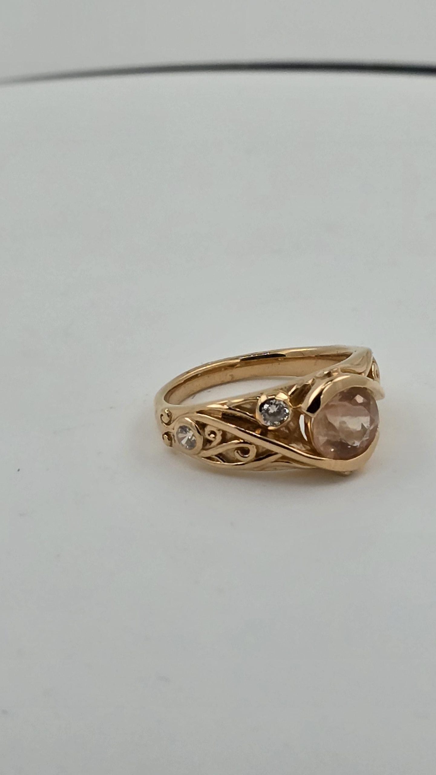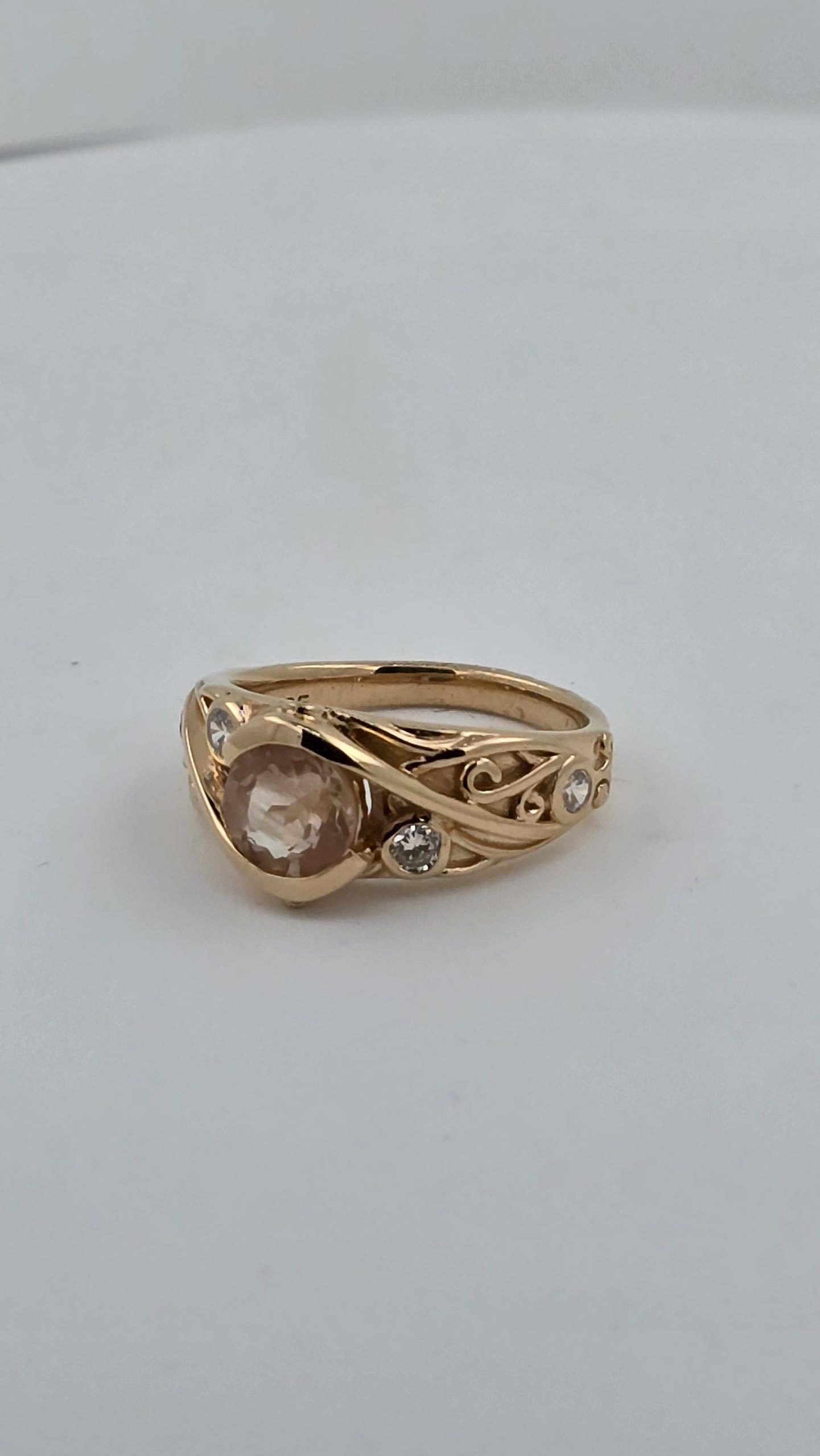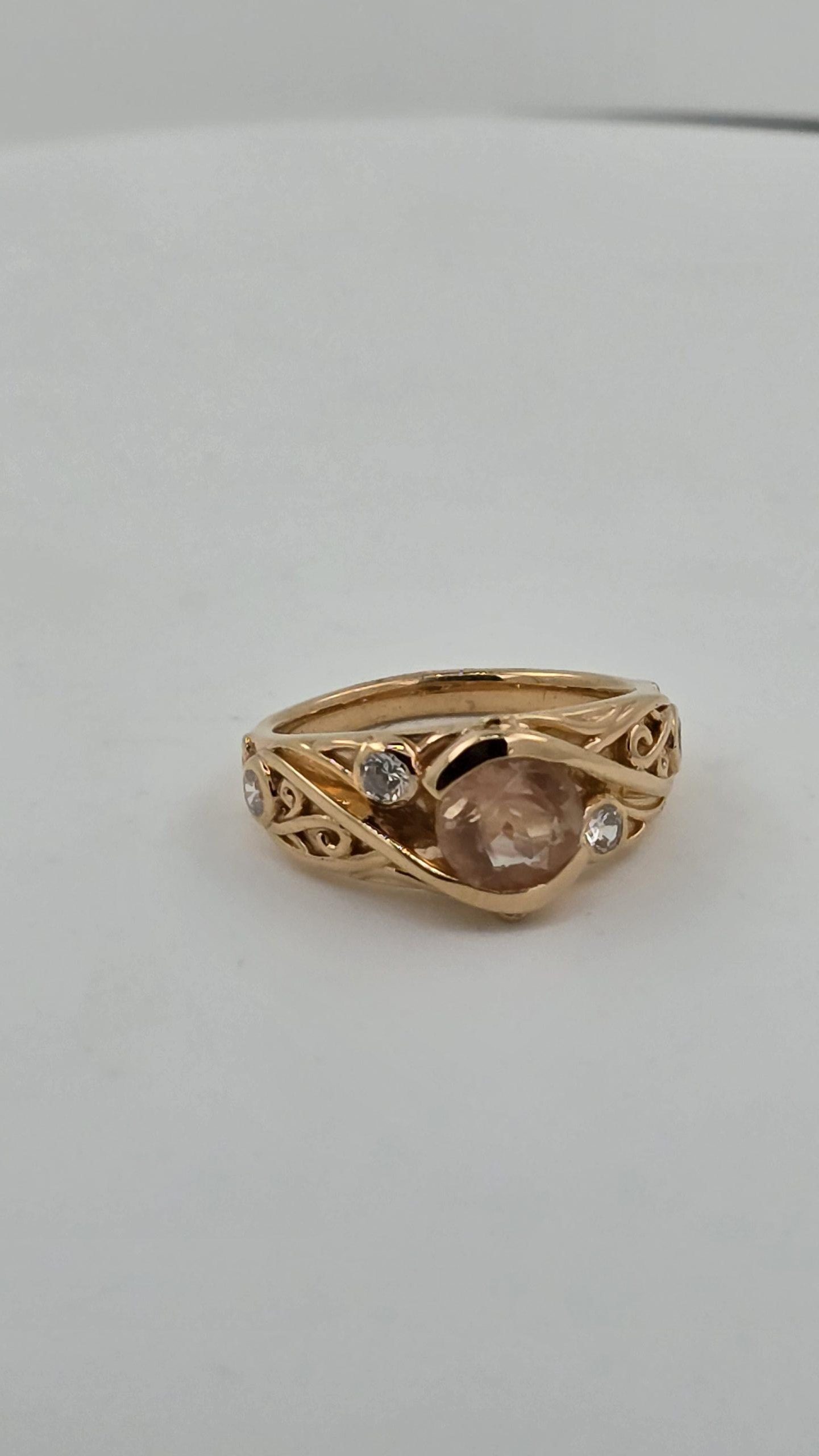 This Oregon Sunstone ring is crafted from 925 sterling silver and finished in rich rose gold vermeil for a luxe look that wears beautifully. The centerpiece is a 7mm Oregon Sunstone with a soft champagne-to-peach glow that catches light from every angle. Four cubic zirconia accent stones add extra sparkle, while the elegant, flowing design gives the ring a romantic, vintage feel.
