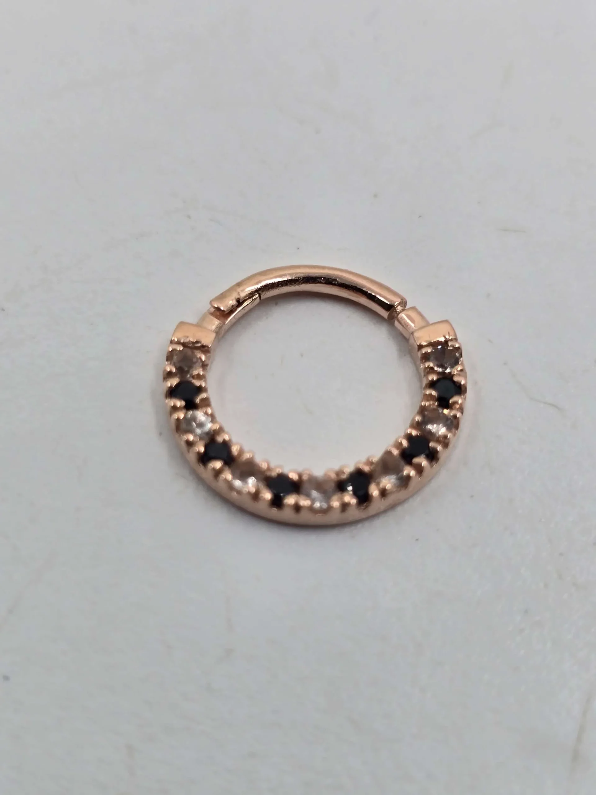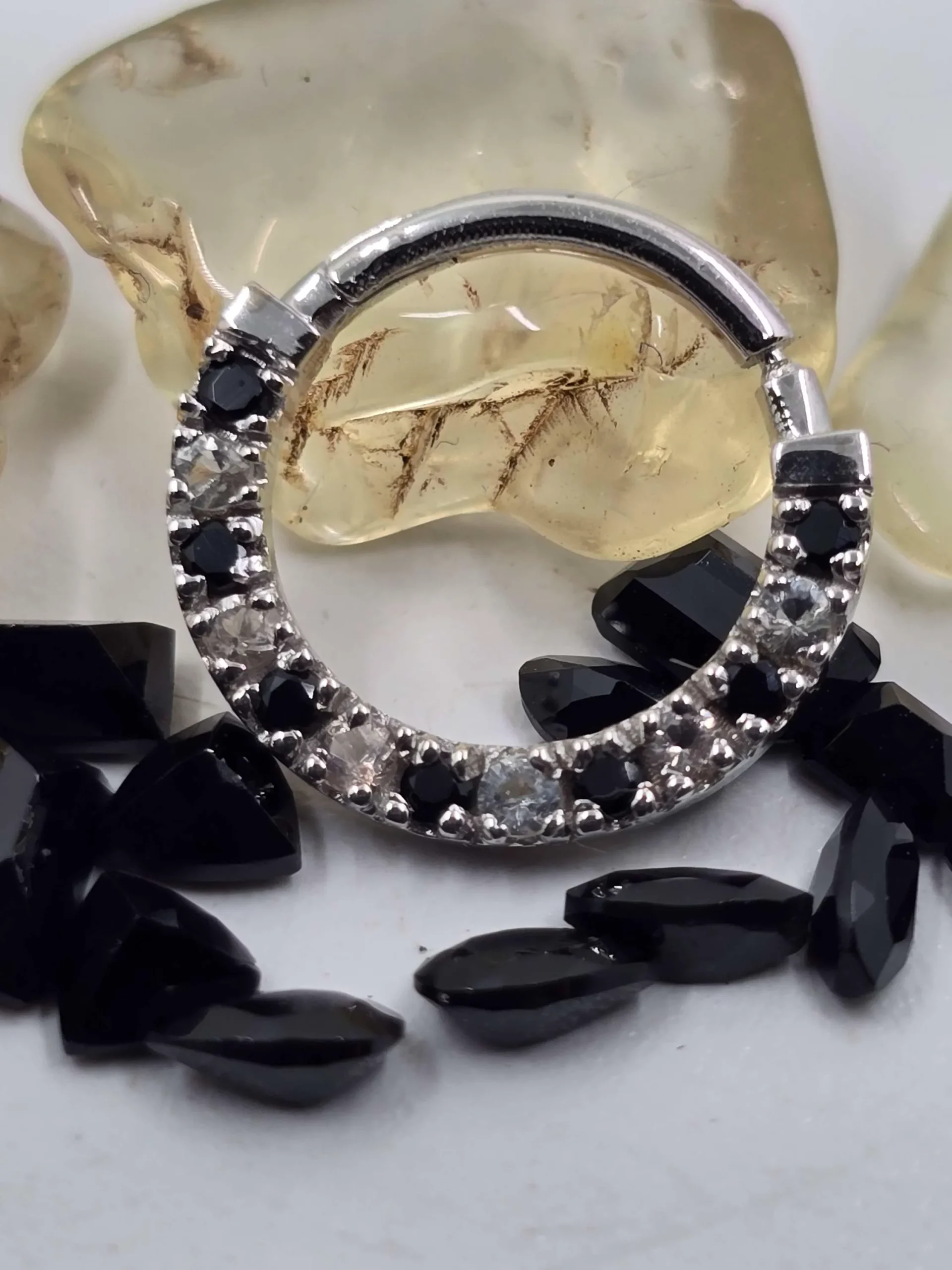 Embody the divine femininity of Parvati, the Hindu goddess of love and beauty, with our stunning septum ring clicker. This exquisite piece features alternating Oregon Sunstone and black spinel gems, showcasing the unique schillerization of Sunstone and the mysterious allure of spinel.