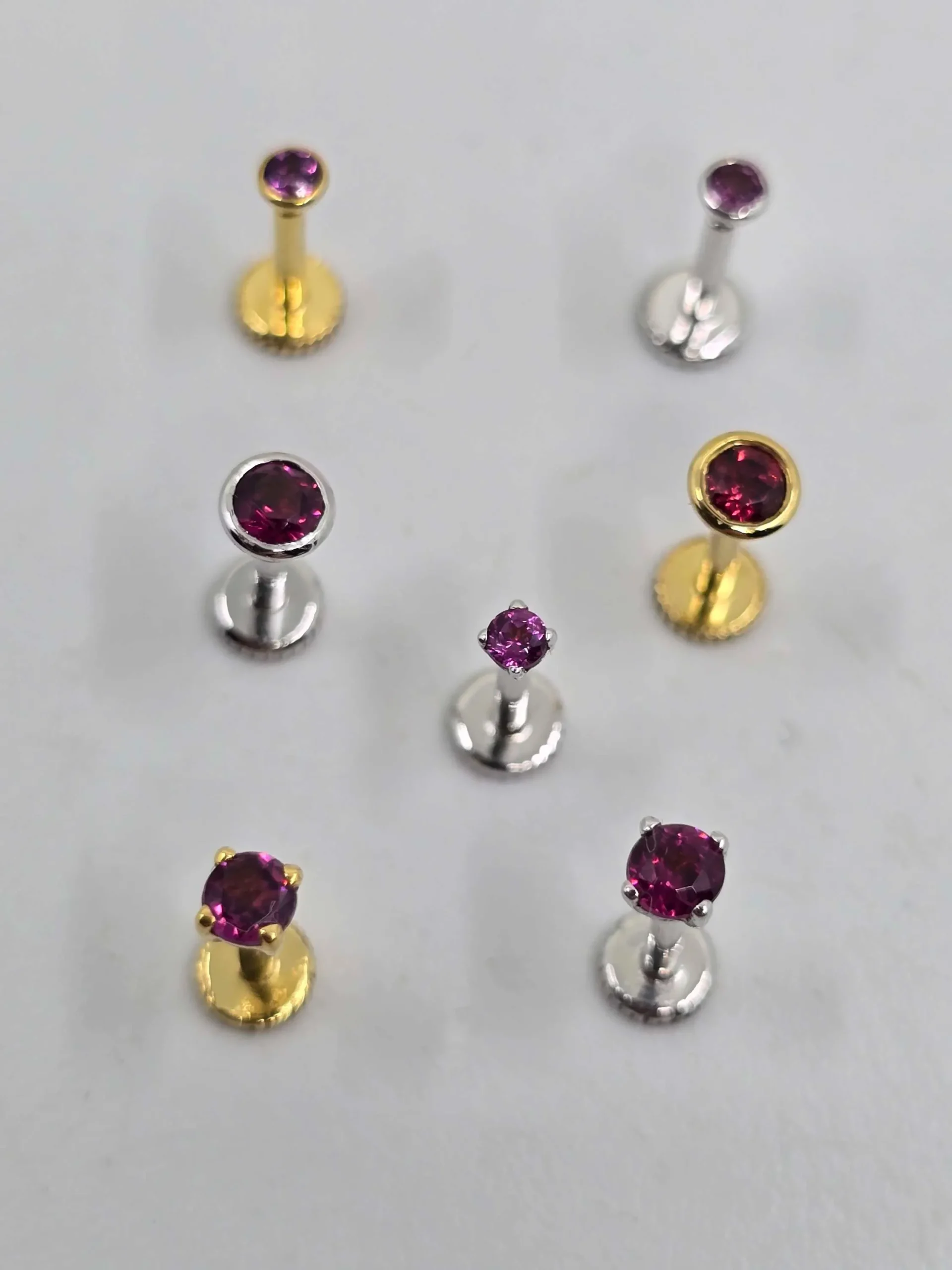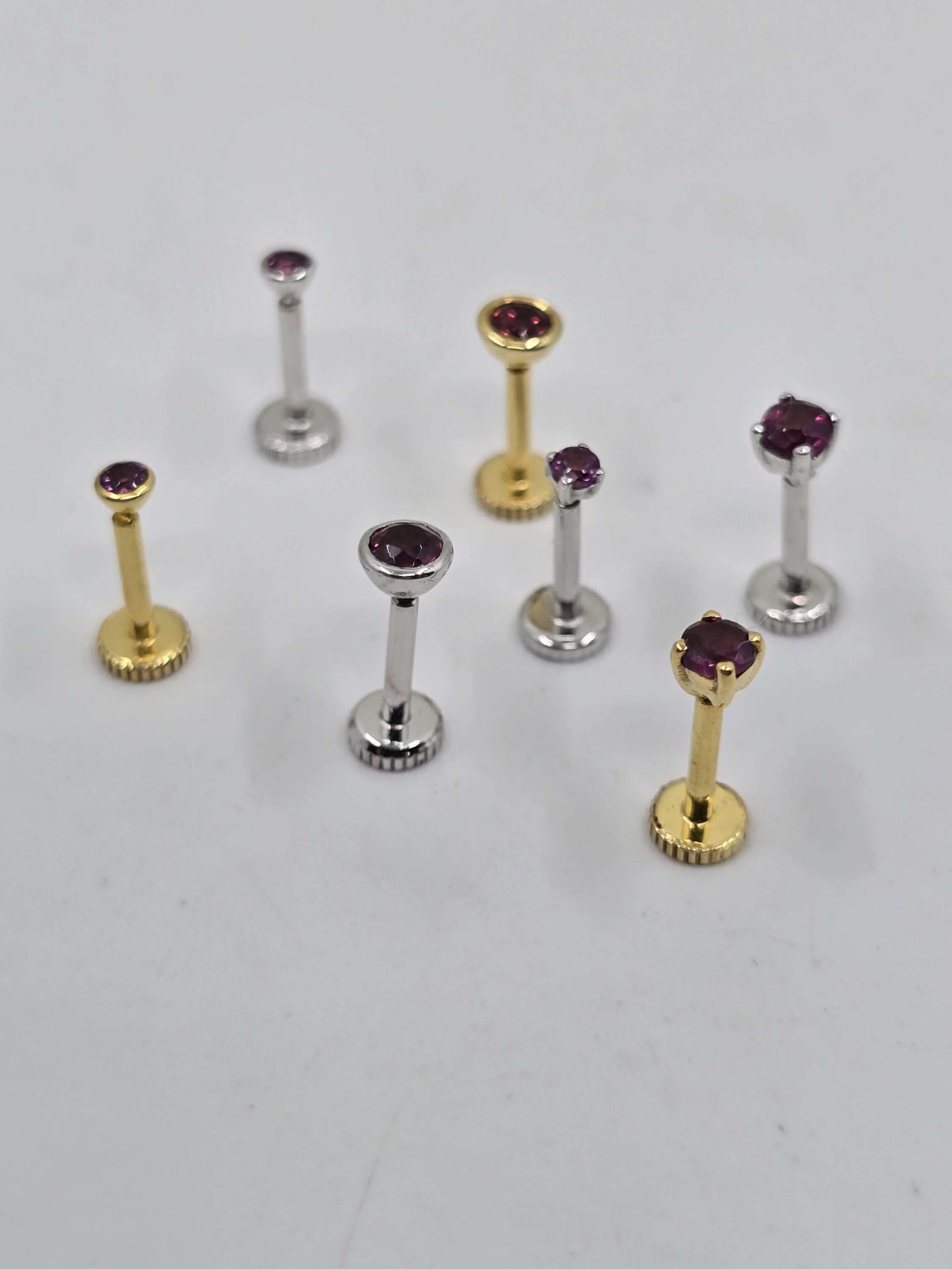 These 14k gold flat back labrets feature raw pink-purple gemstones from Madagascar, set in your choice of bezel or prong. Perfect for nose, conch, helix, Medusa, Monroe, or labret piercings. Internally threaded 16g post with a secure 5mm flat back.