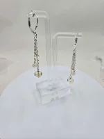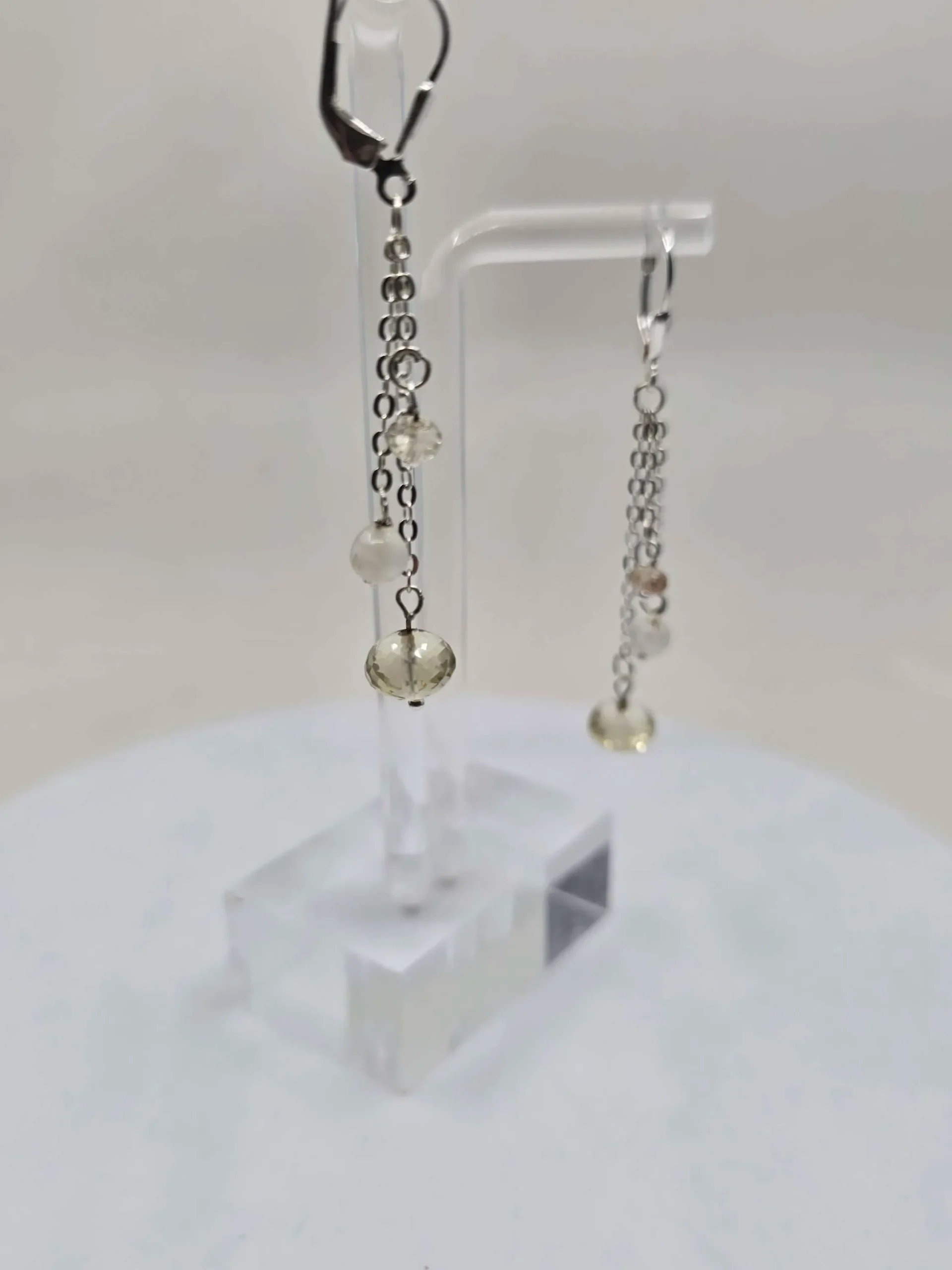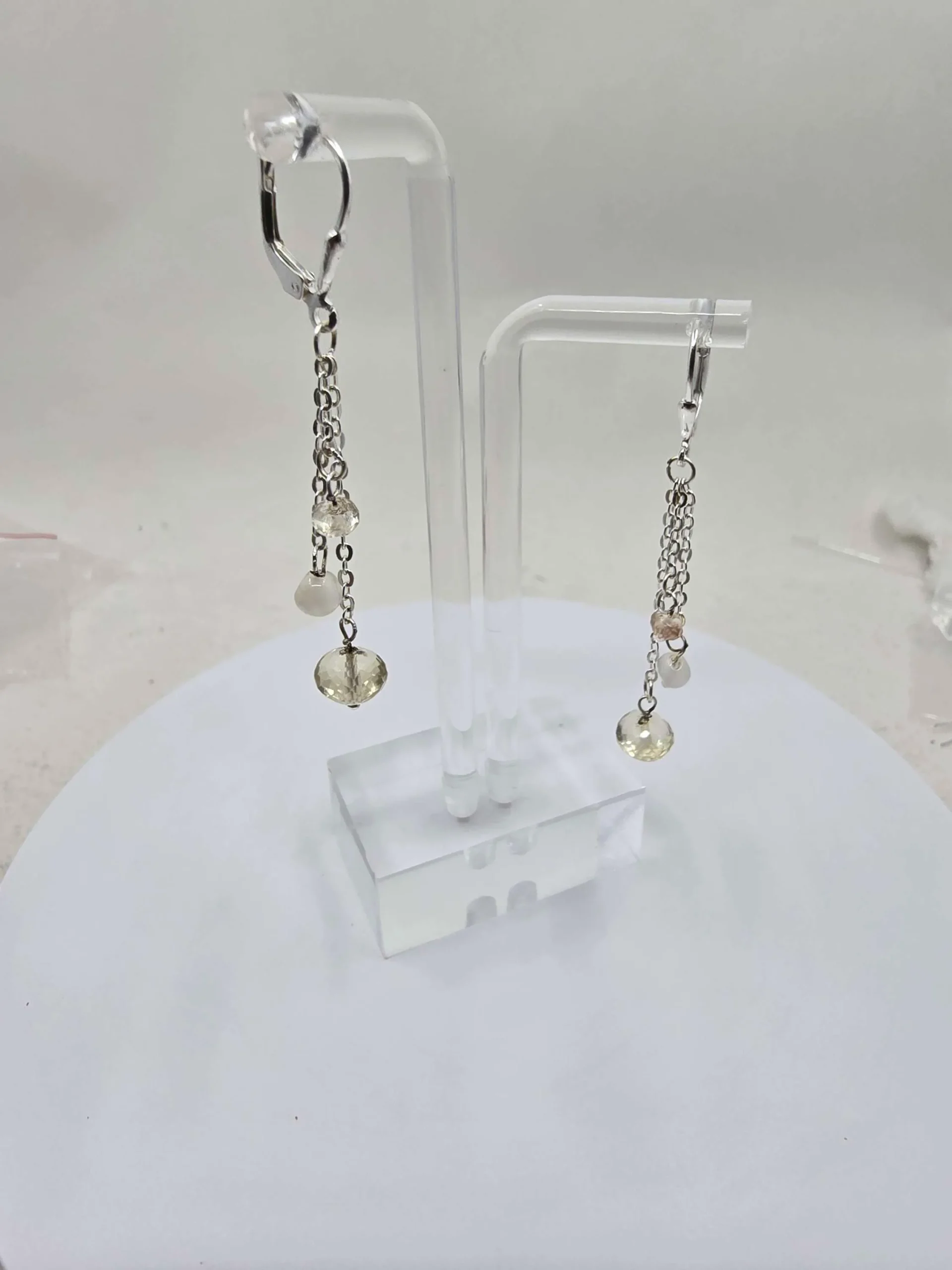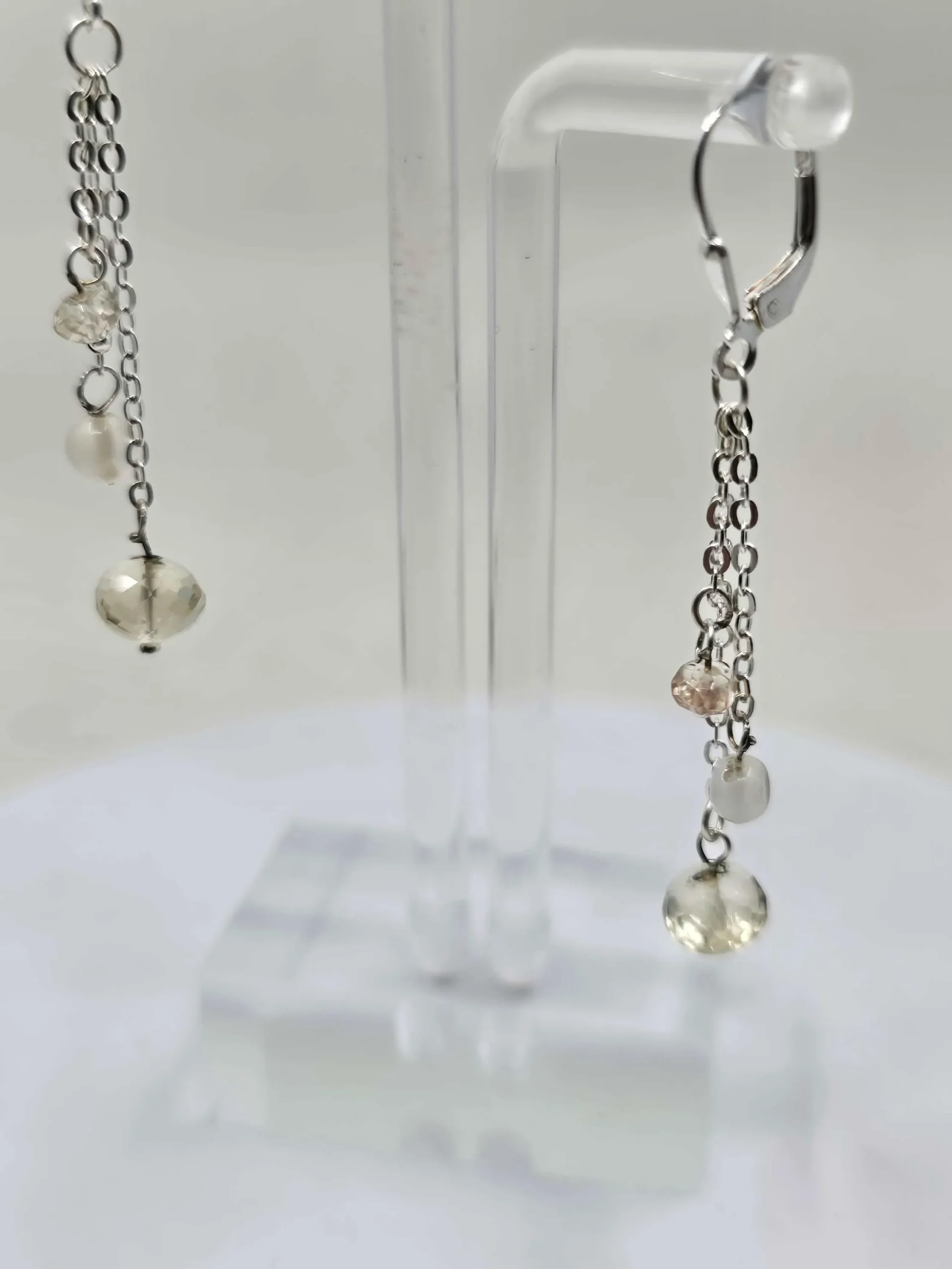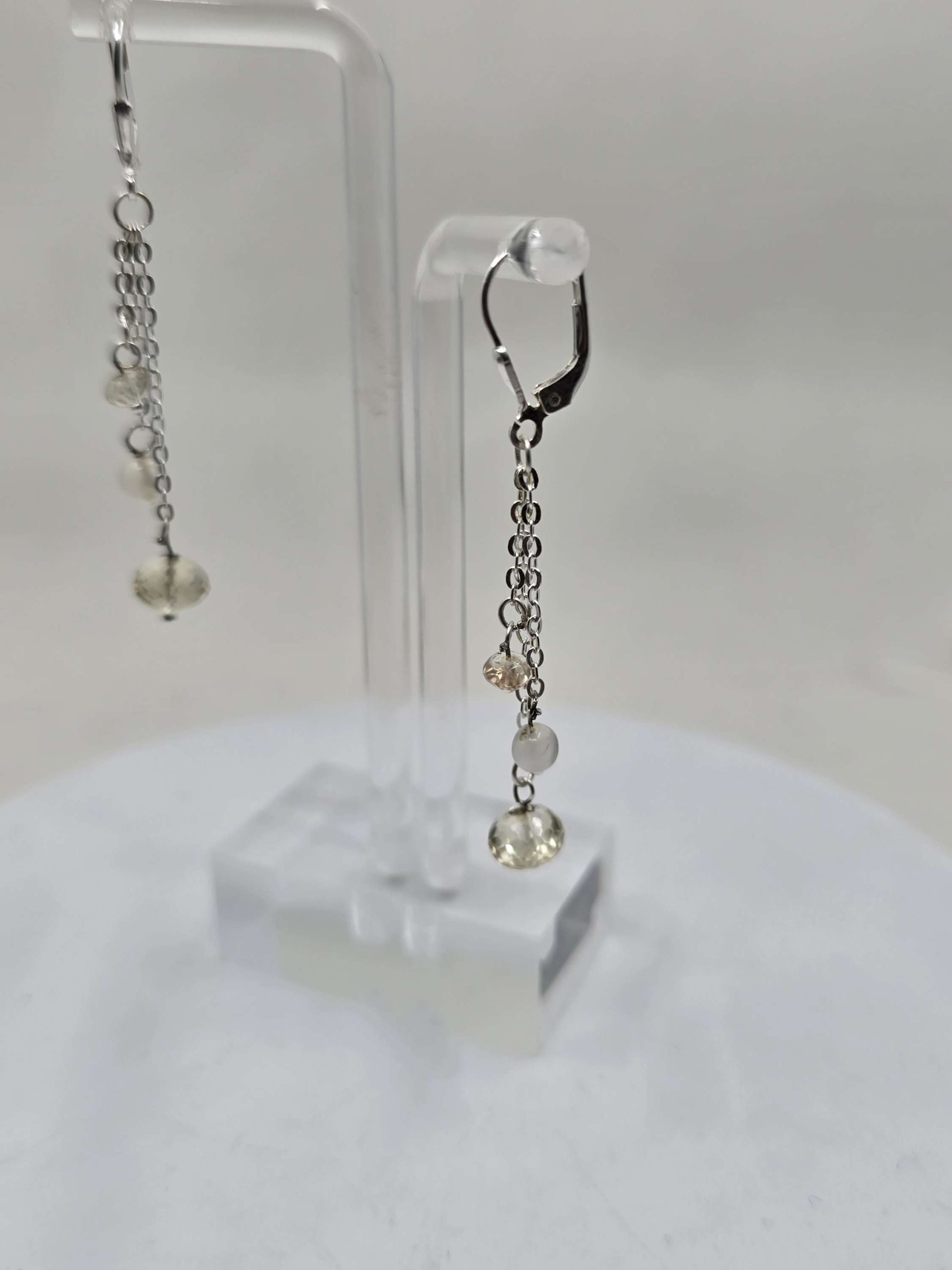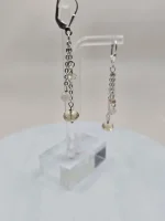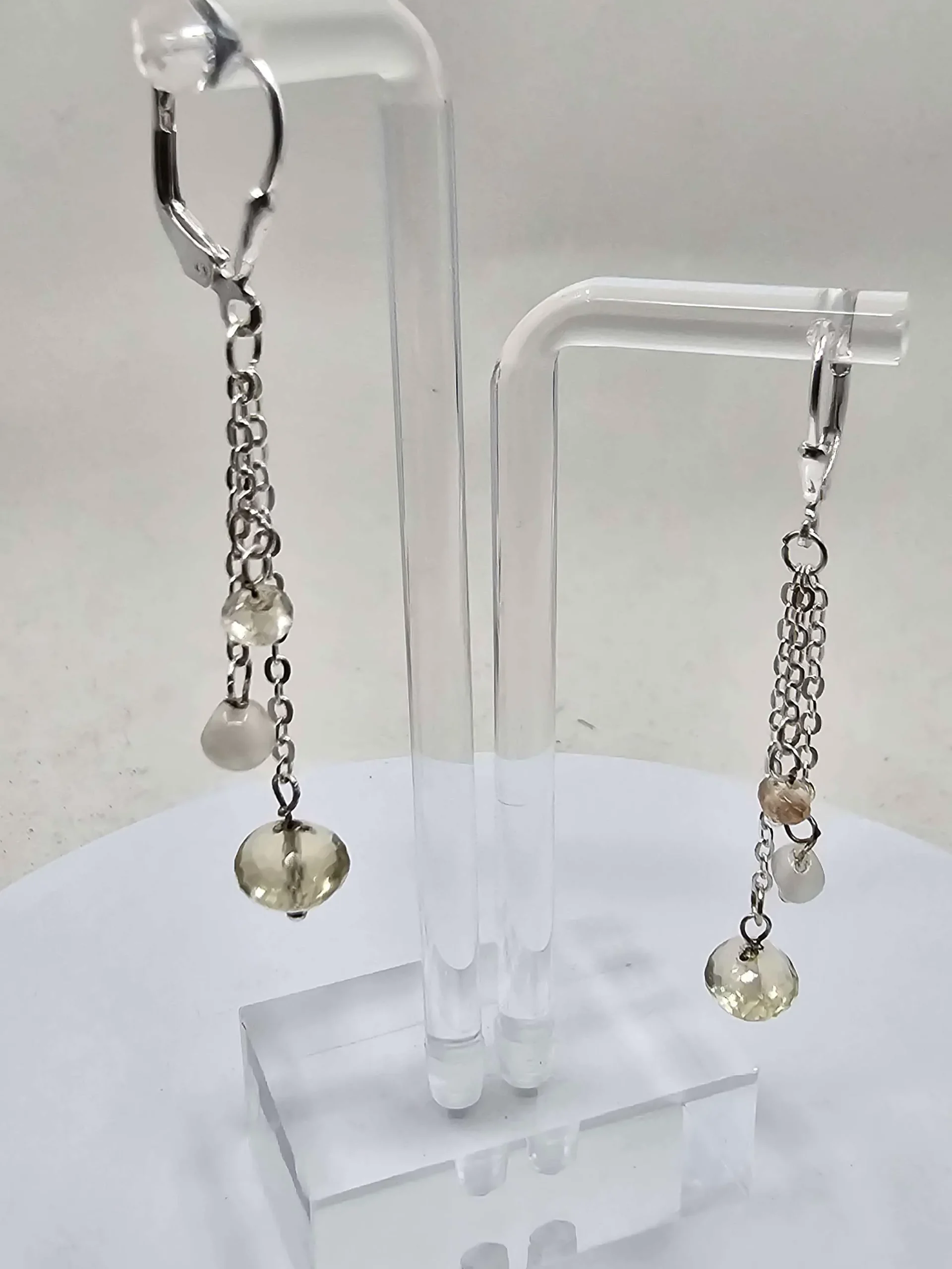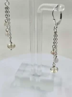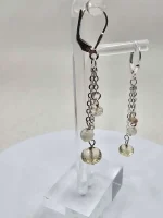 Here’s a nice pair of pretty dangle earrings with sterling silver leverback. The little chains each suspend three beads, a glowing 7mm Oregon Sunstone, a shimmering 4mm moonstone, and a sparkling little 3mm Oregon Sunstone. Tell her she’s your sun and moon! Buy her these adorable earrings today. Or buy them for yourself!