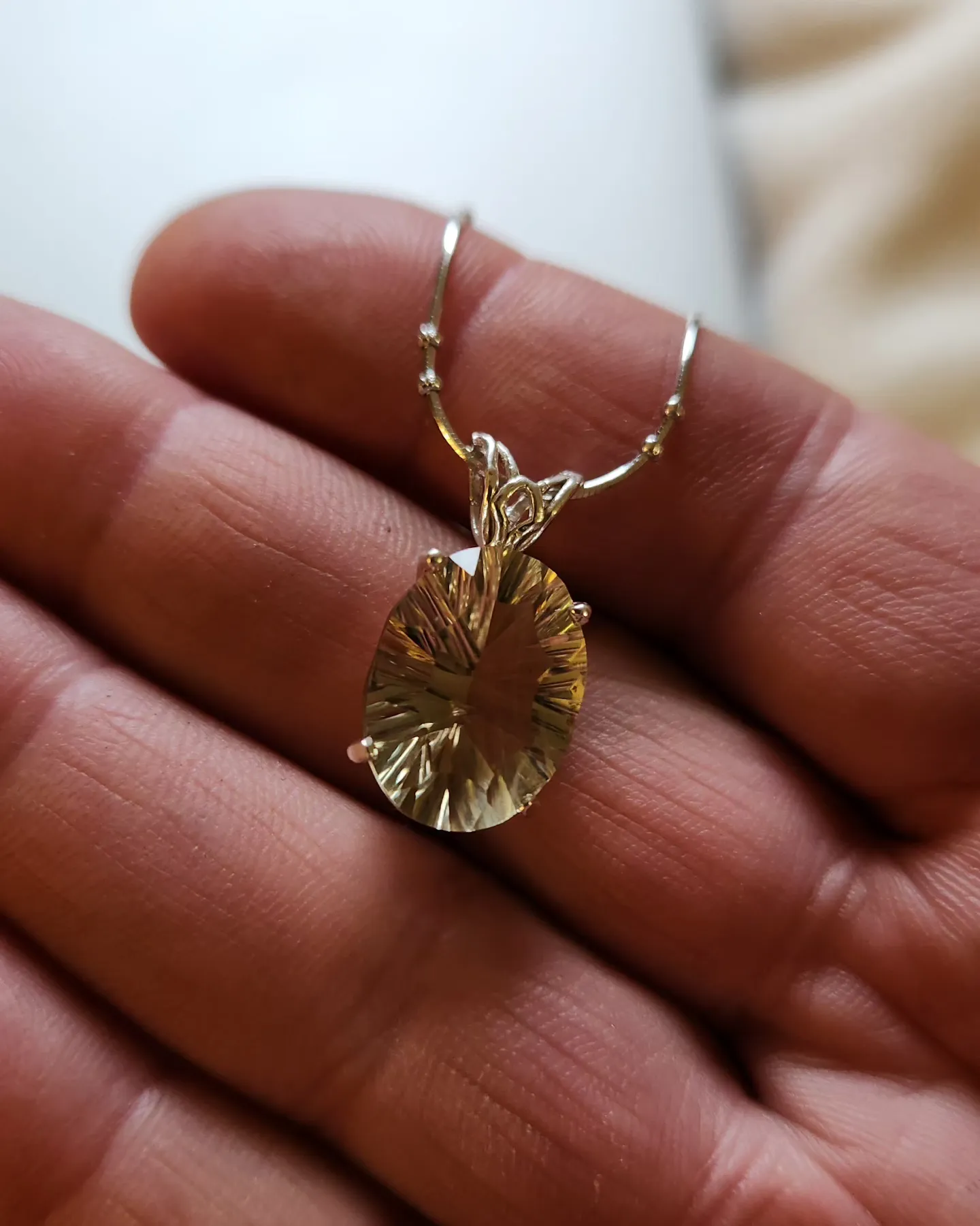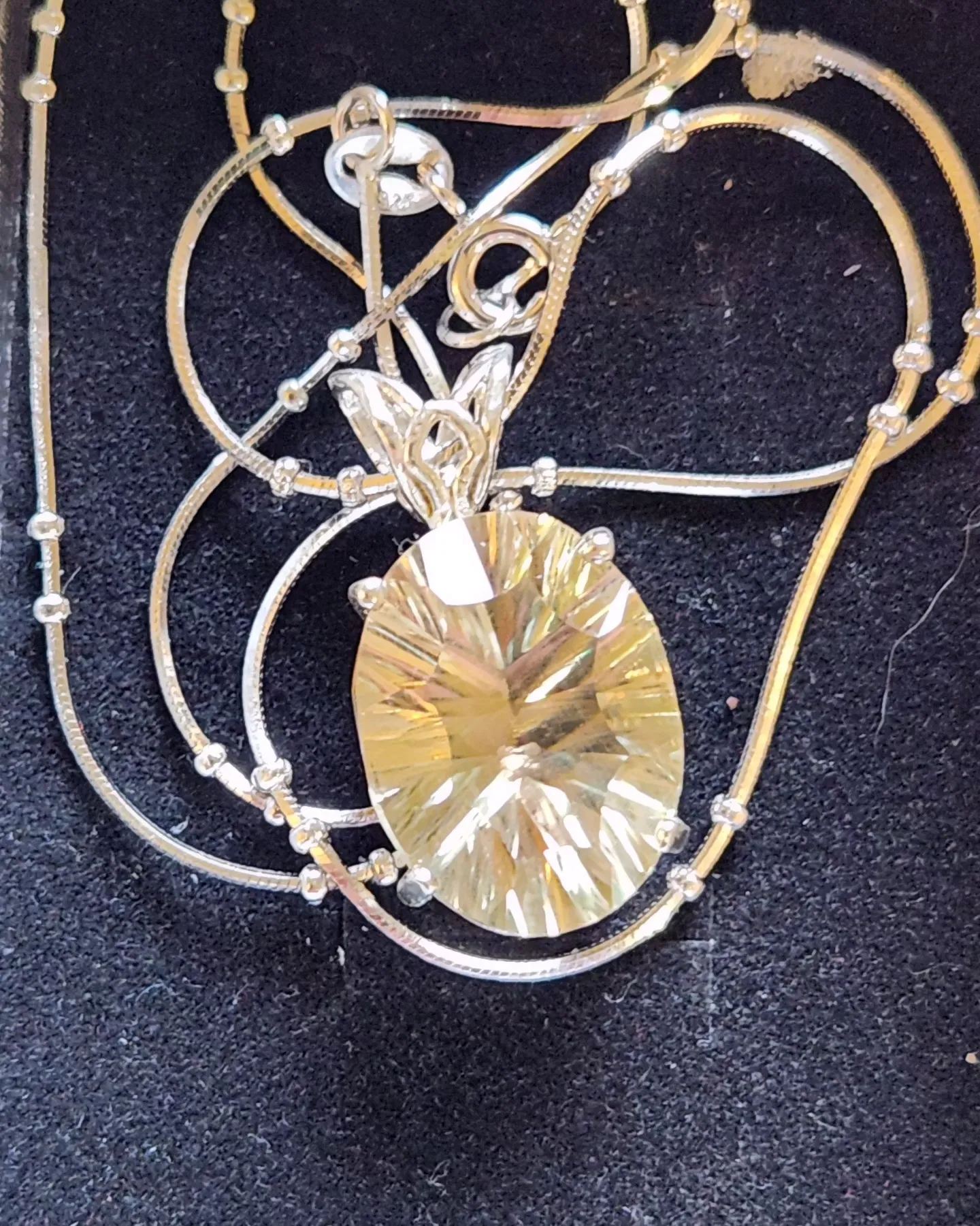This Oregon Sunstone pendant features a bicolor mostly green with pink and champagne, concave cut stone. It weighs 7.8ct and would retail for over $700 for the stone alone.