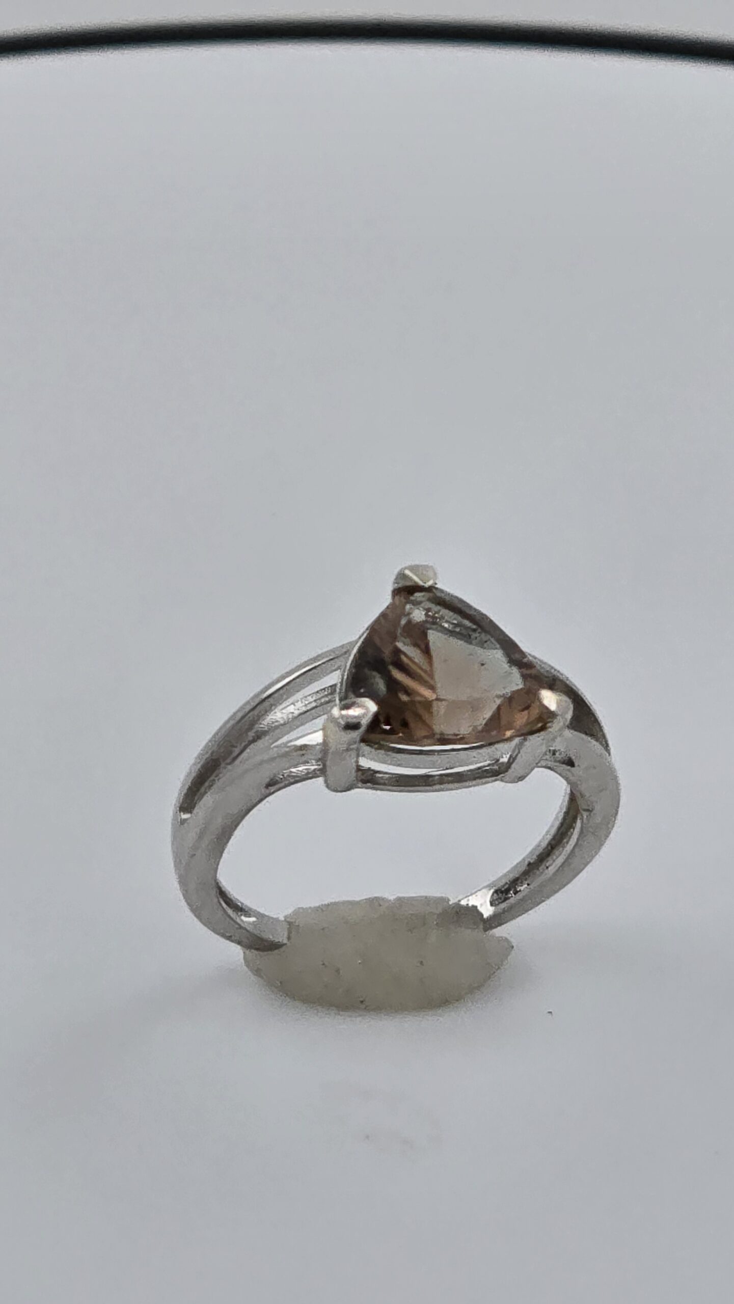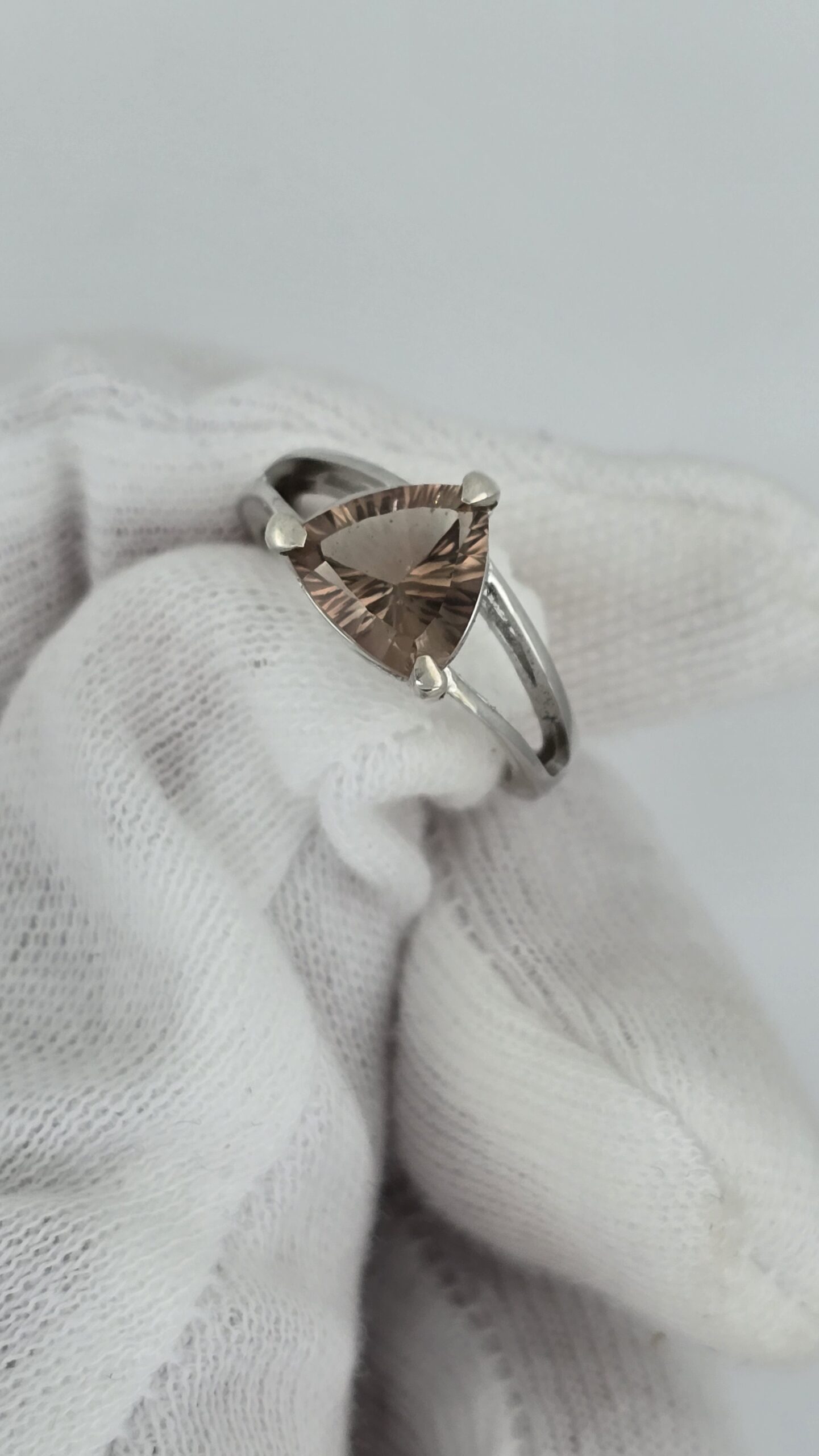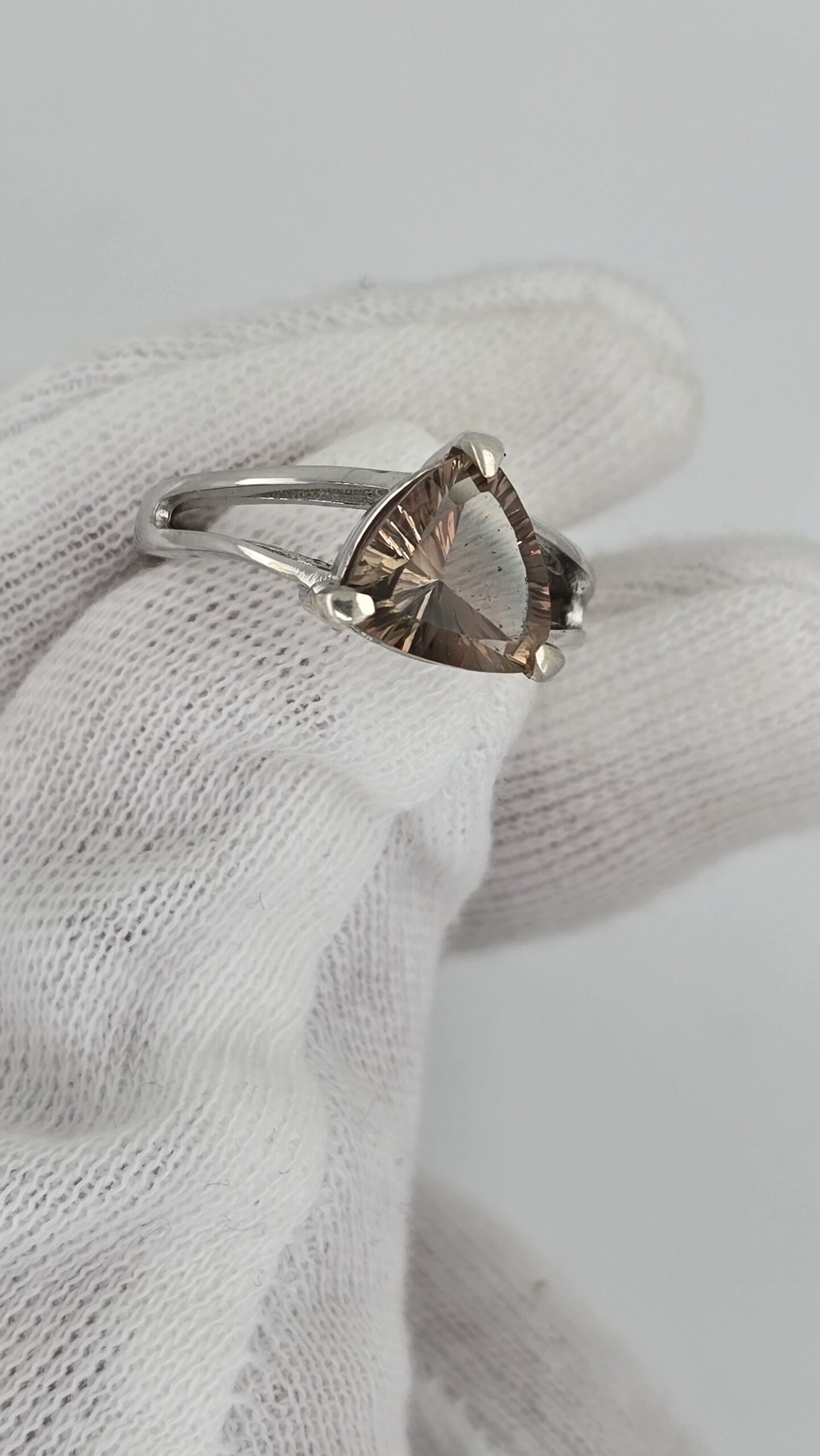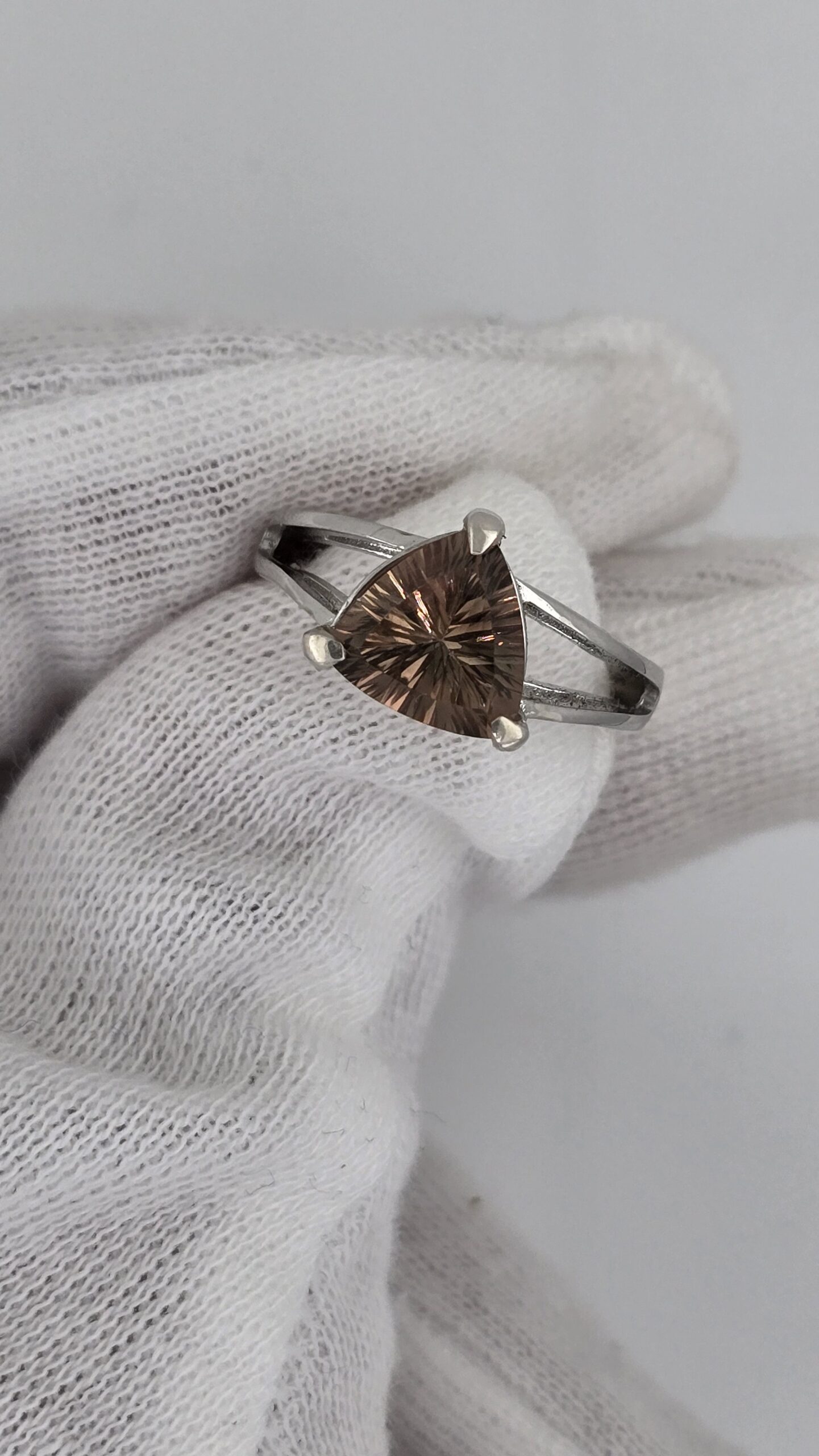Elegant sterling silver split shank ring featuring a 2.5ct bicolor red-green Oregon Sunstone. Trillion cut with concave faceting for maximum brilliance. Size 6, resizable.