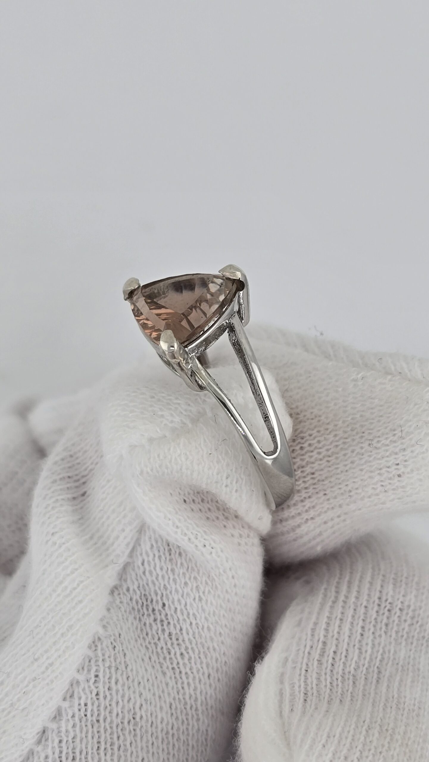 The gemstone is set in a sterling silver split shank ring, designed to showcase the stone while maintaining a simple yet elegant profile. The open band enhances light flow beneath the gem, maximizing the stone’s brilliance and color play.