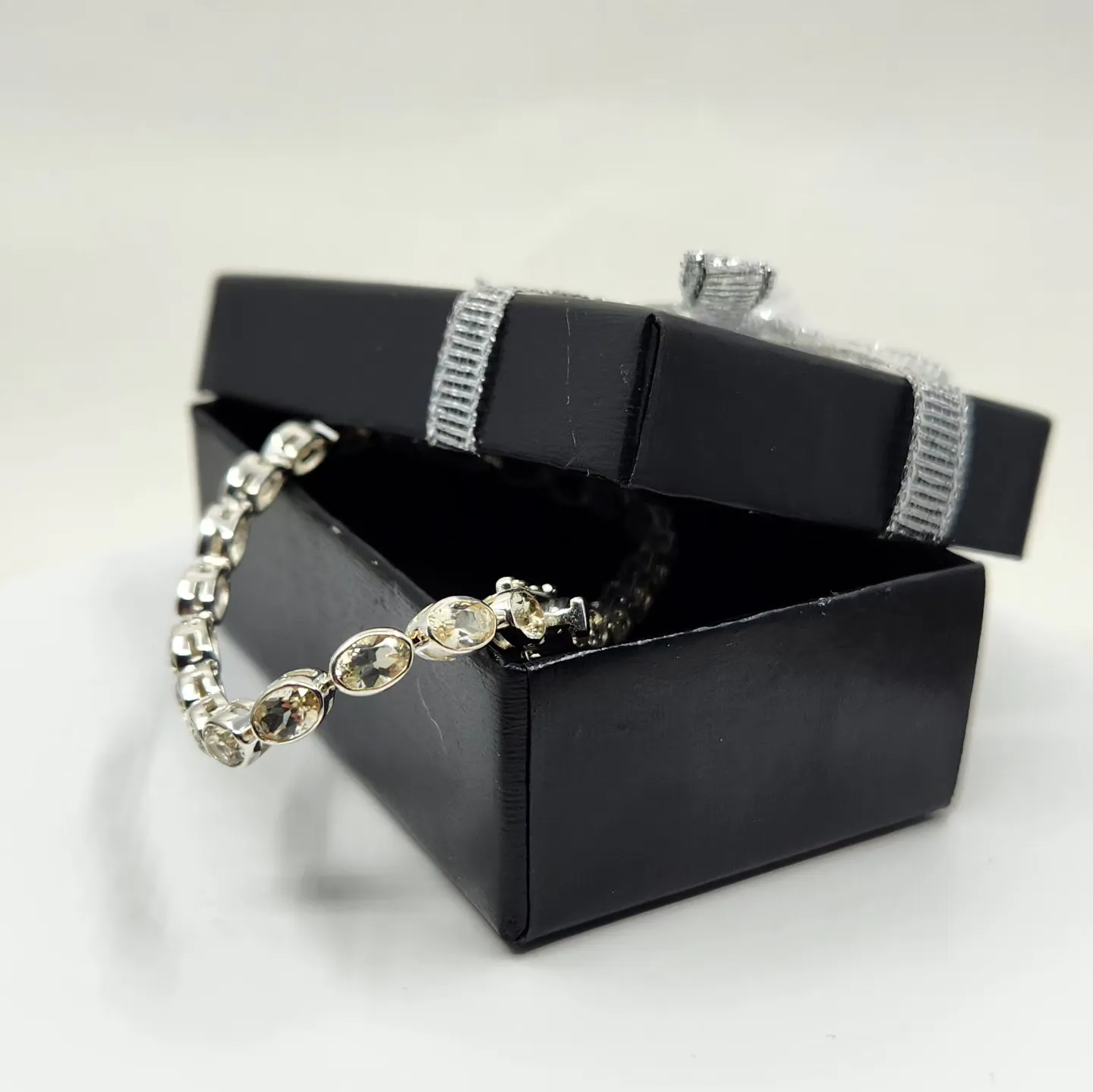 A stunning 7.5″ sterling silver tennis bracelet featuring 26 natural champagne Oregon Sunstones (6x3mm each). These genuine, copper-bearing feldspar gems are ethically hand-mined in Oregon, radiating warm champagne sparkle for a timeless, elegant look.
