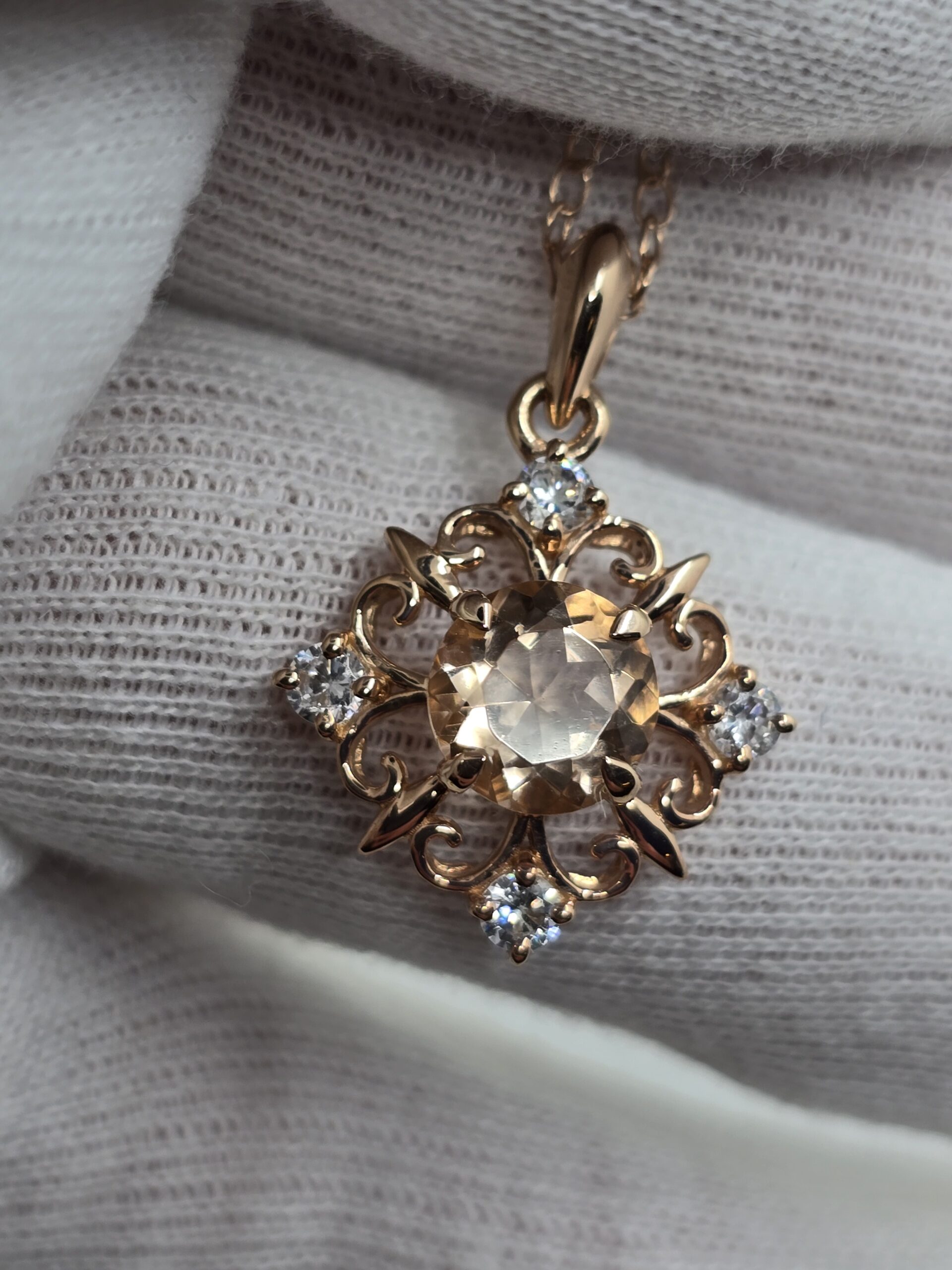 The stone is set in a delicate rose gold vermeil frame, crafted from sterling silver and coated in a thick layer of 14k rose gold for a luxurious, heirloom-quality finish. Encircling the center gem are four sparkling round cubic zirconia accents, adding just the right touch of brilliance and enhancing the pendant’s vintage appeal.