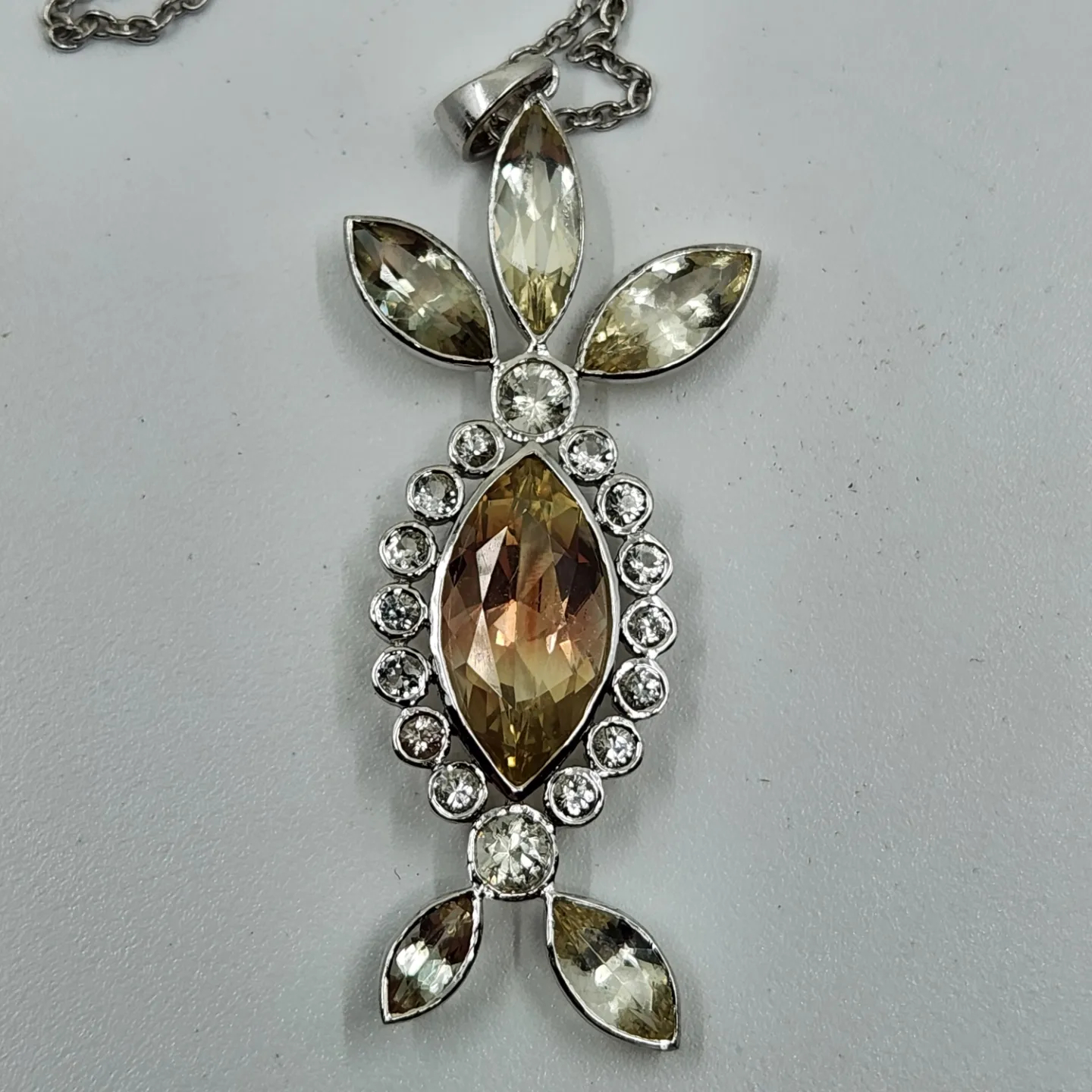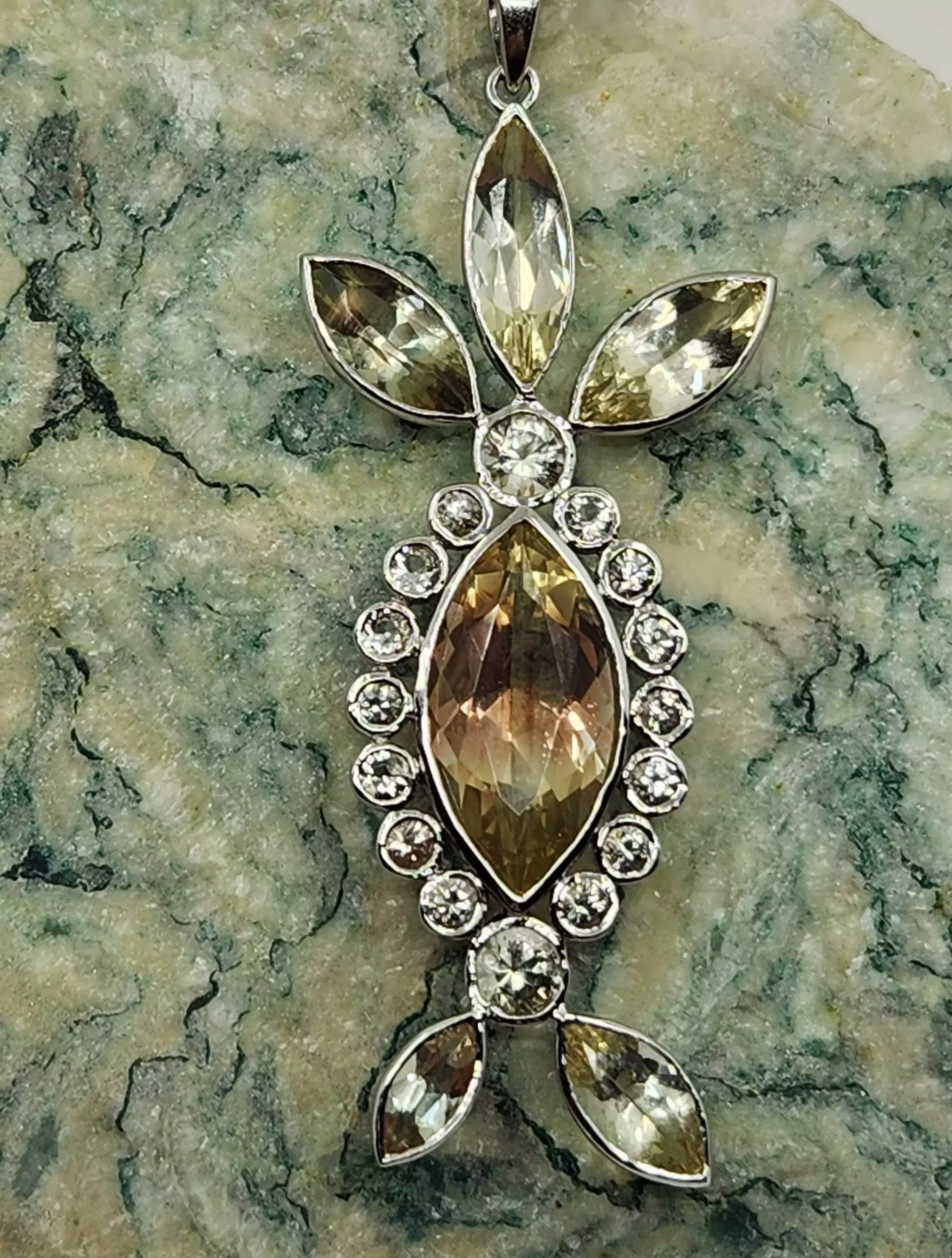 A bold, one-of-a-kind Oregon Sunstone pendant featuring a massive 8ct bicolor centerpiece surrounded by 22 smaller stones in shades of green and clear. Set in sterling silver, this 61mm tall pendant celebrates individuality and brilliance.
